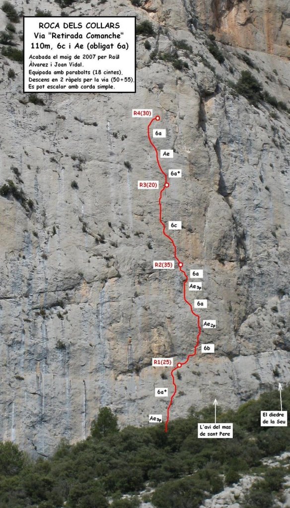 Retirada Comanche quizá no sea la vía más famosa de la pared. Sin embargo es una vía muy buena sobre roca espectacular, caliza compacta y muy adherente. Y con mucho ambiente debido a la verticalidad de sus placas.