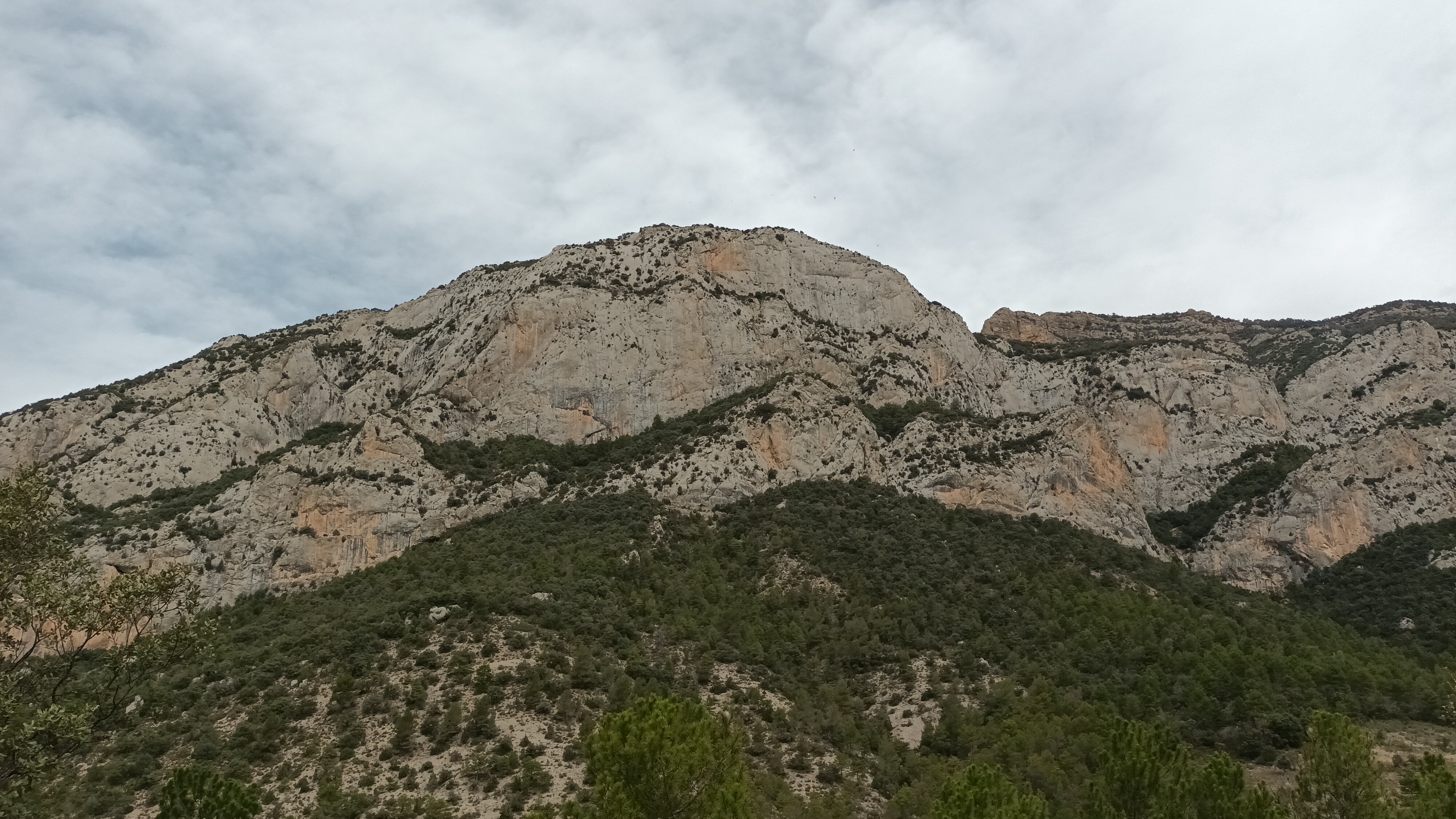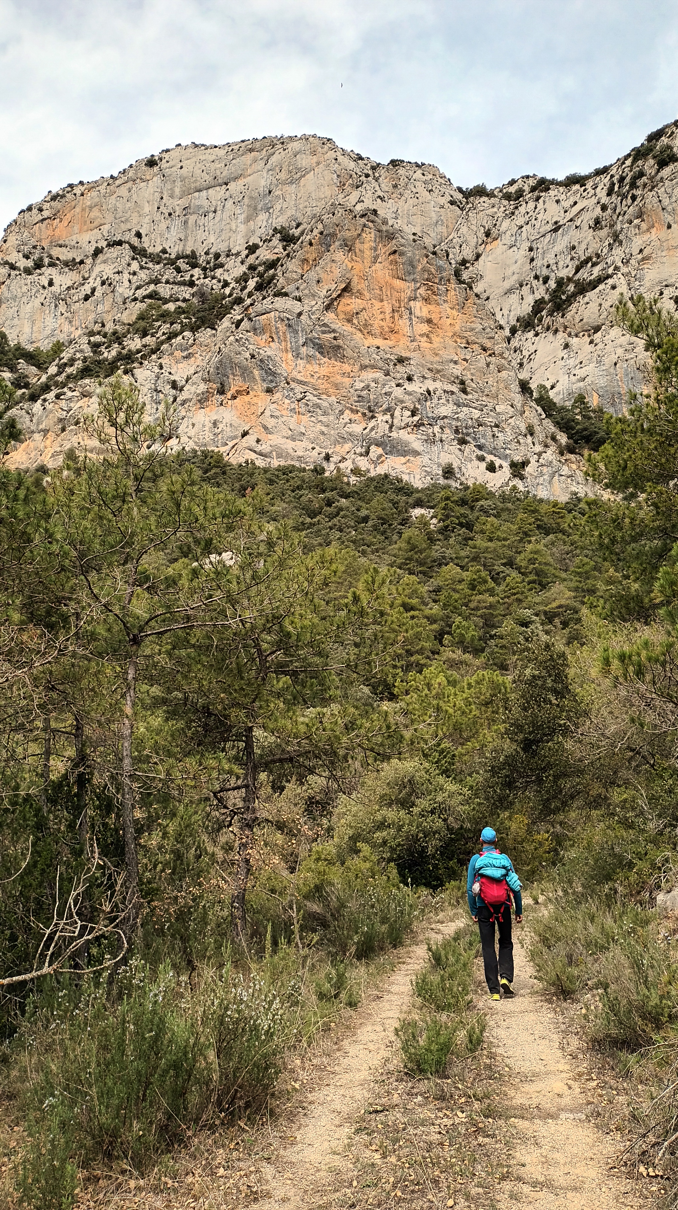 En lugar de a la pared en línea recta, desde la Masía de Sant Pere, seguir la pista hacia la derecha para bordear. En el primer desvío de la pista giramos a la izquierda (hay un río). Cuando estemos en frente de la pared encontraremos un sendero que se mete en el bosque para llegar a ella. En total 50 minutos.