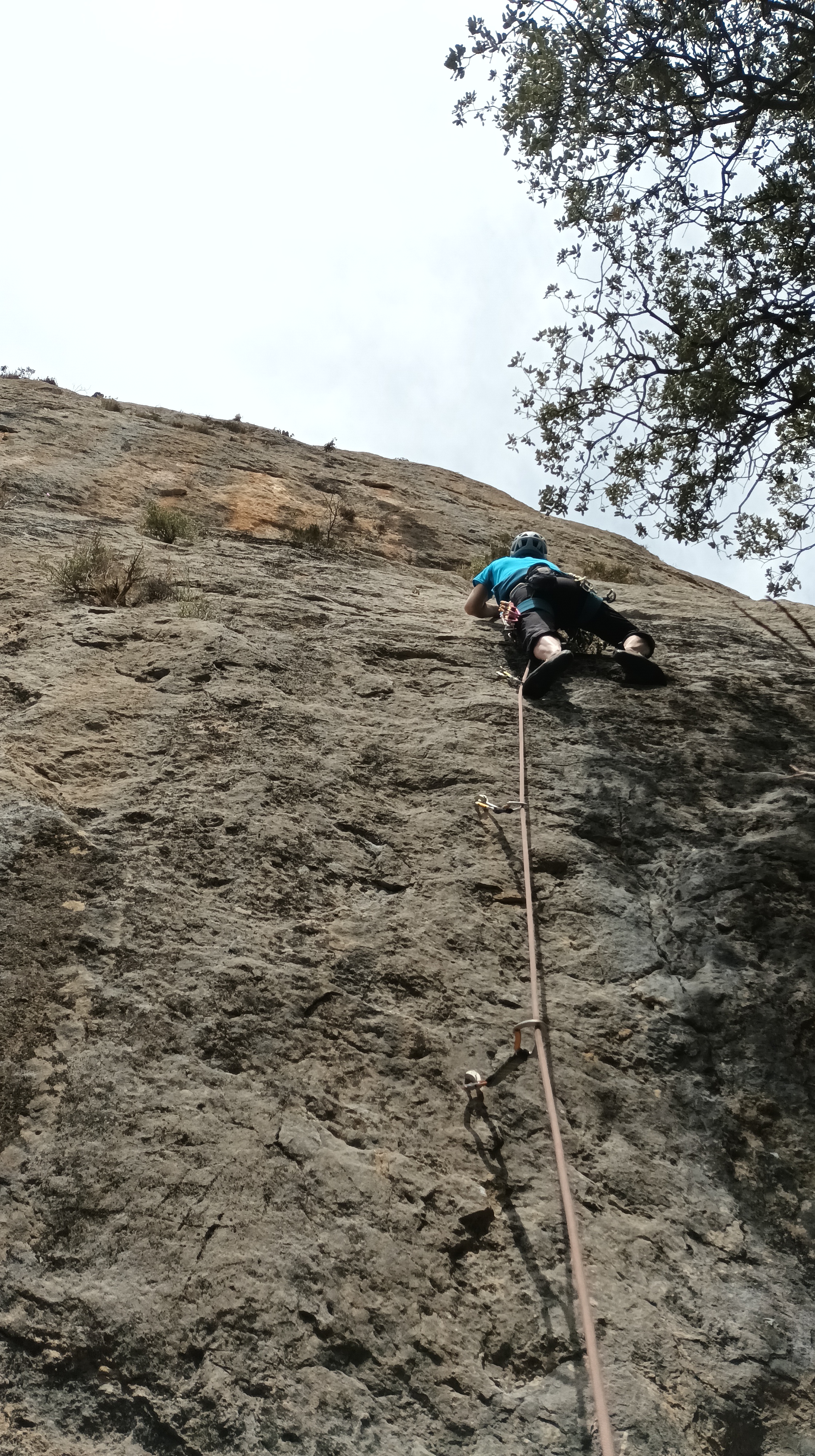 Largo 2, 6b: Salimos hacia la izquieda, mucho ambiente. Se va dejando escalar hasta que llegamos a un paso de 7a que se puede hacer en Ae. Seguimos escalando hasta que llega otra zona que se hace en Ae. Y volvemos a escalar hasta la reunión.