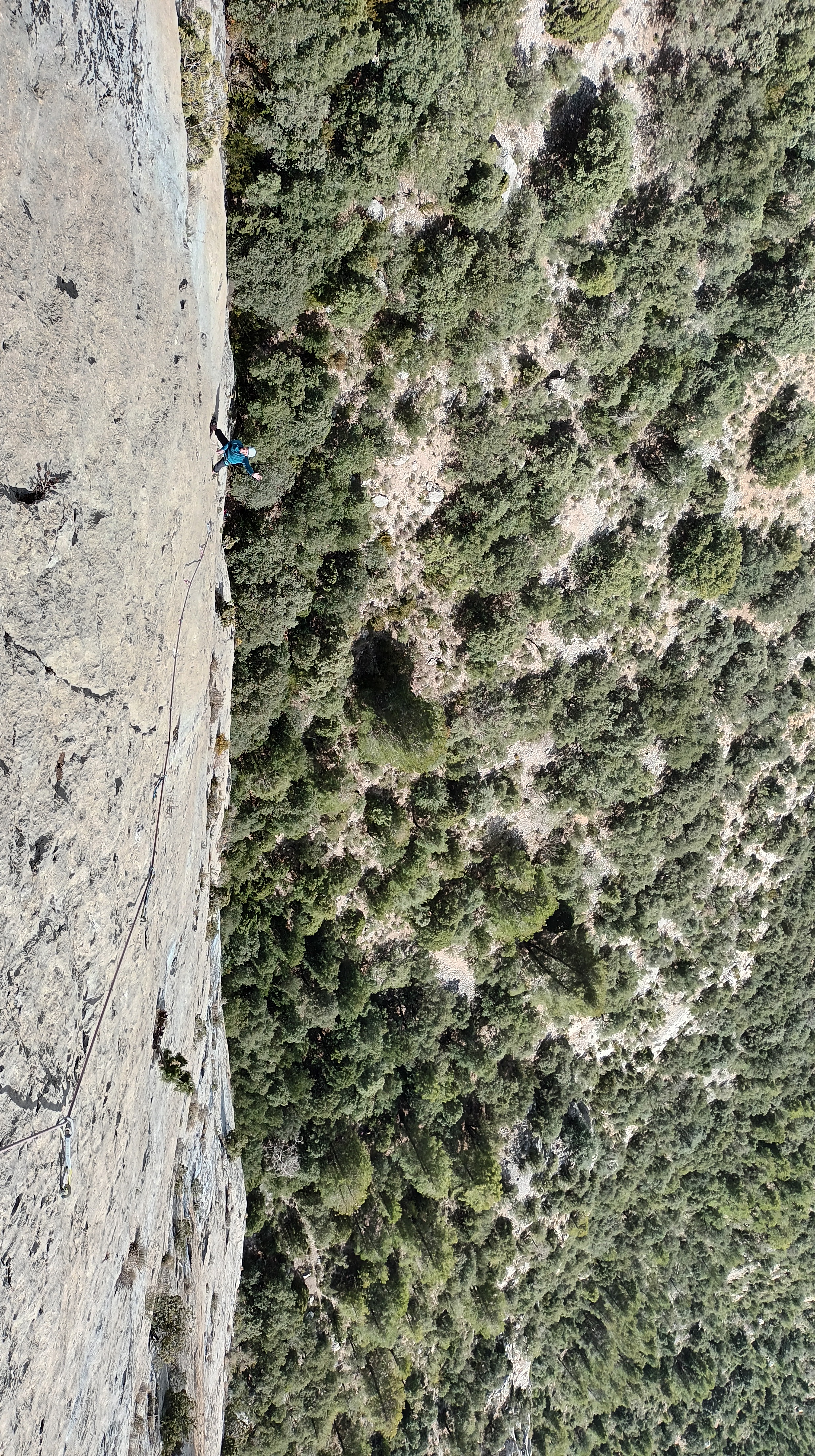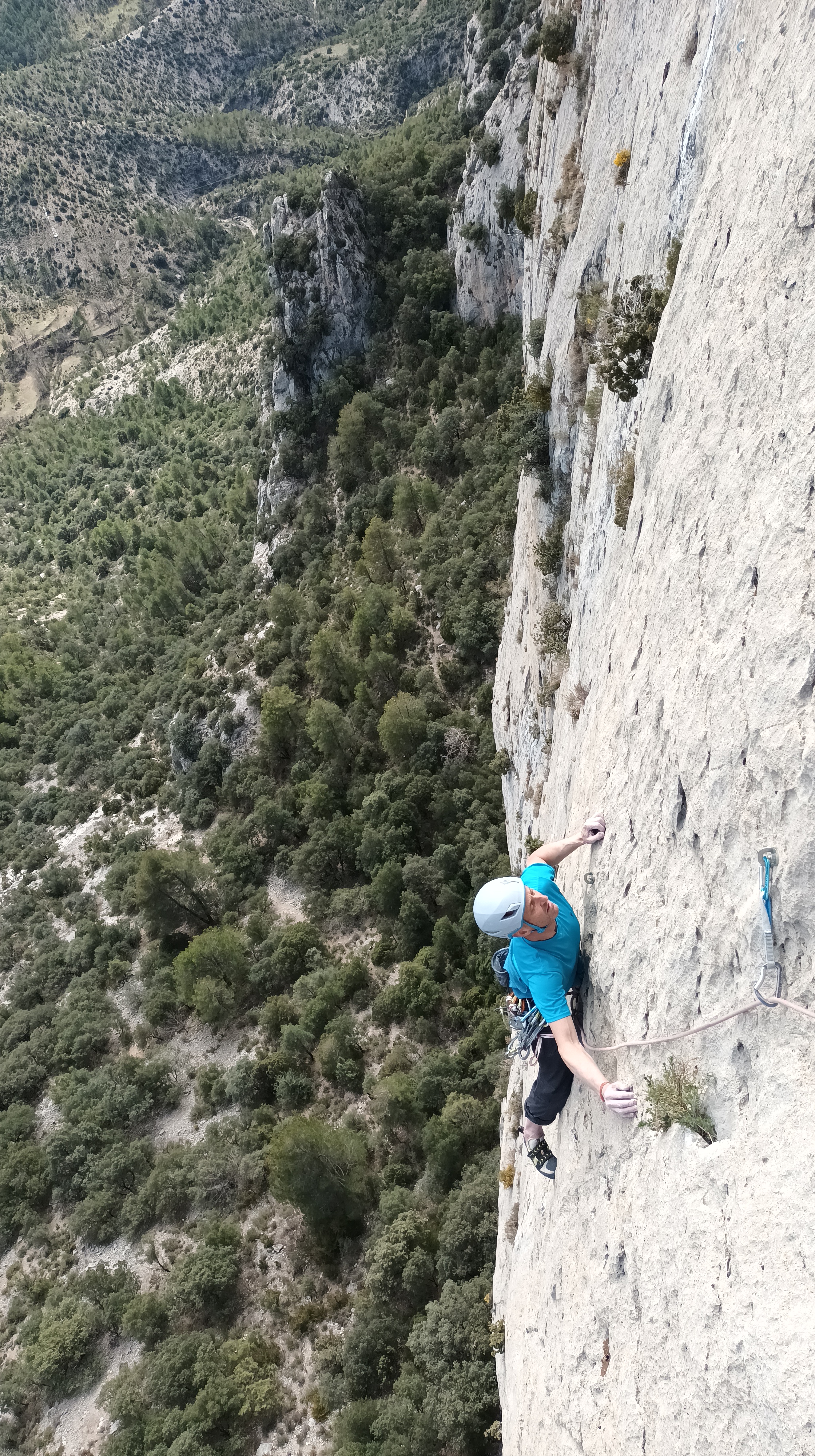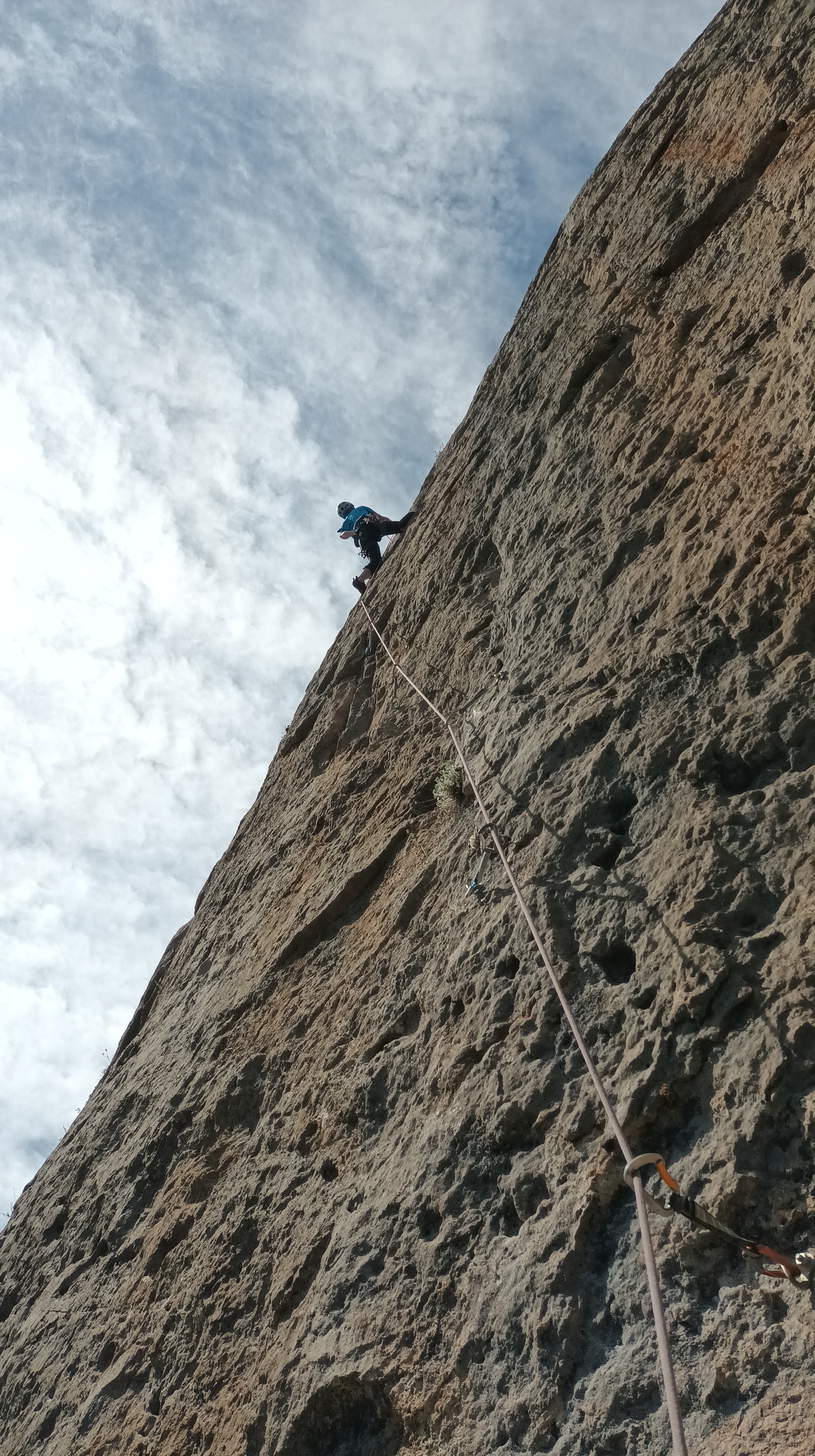Largo 2, 6a+: La vía continua con la misma dinámica. Placas muy verticales con ambiente. Salimos de la reunión hacia la izquierda, unos pasos en artificial a mitad del largo y después volvemos a escalar en libre hasta la reunión. Buenísimo.
