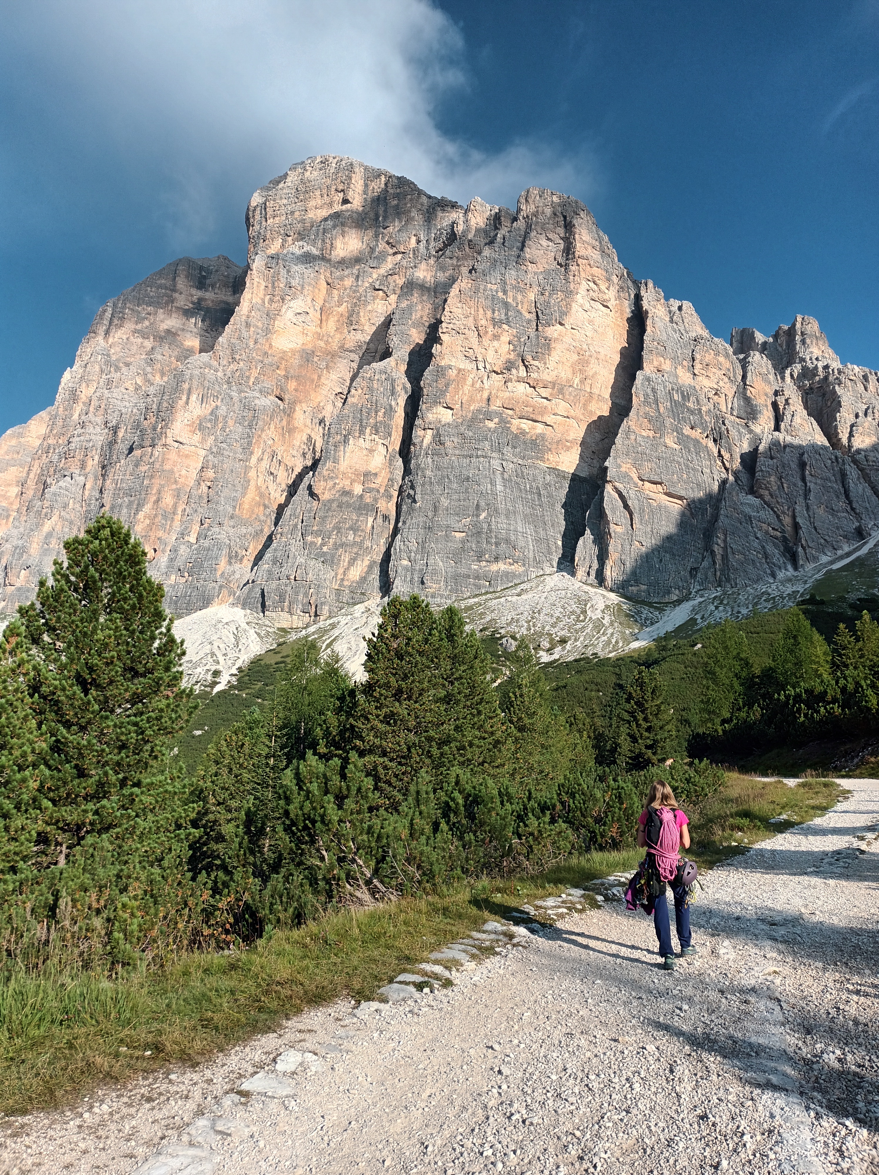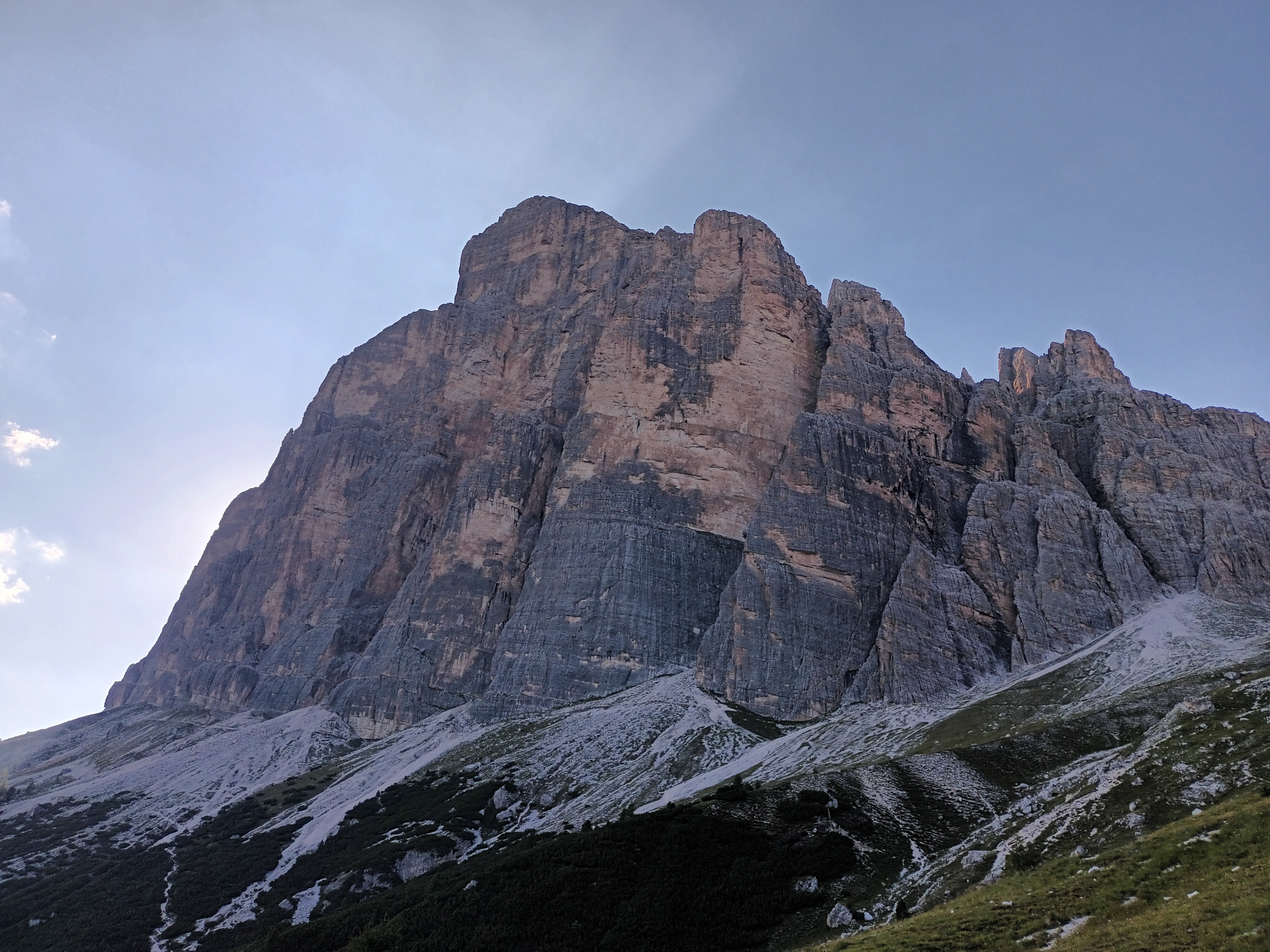 Aproximación: Partimos del Refugio Dibona, al cual podemos acceder en coche desde la carretera principal (Tiene un límite de altura de 2,50 metros, por lo que nos vimos obligados a realizar autostop a las 6:00 de la mañana). Desde el Refugio Dibona podemos ver la Tofana di Rozes y el Primo Spigolo, debemos seguir un camino que asciende hacia el collado de la derecha de la montaña hasta que encontramos una bifurcación que nos depositará a los pies del Spigolo.