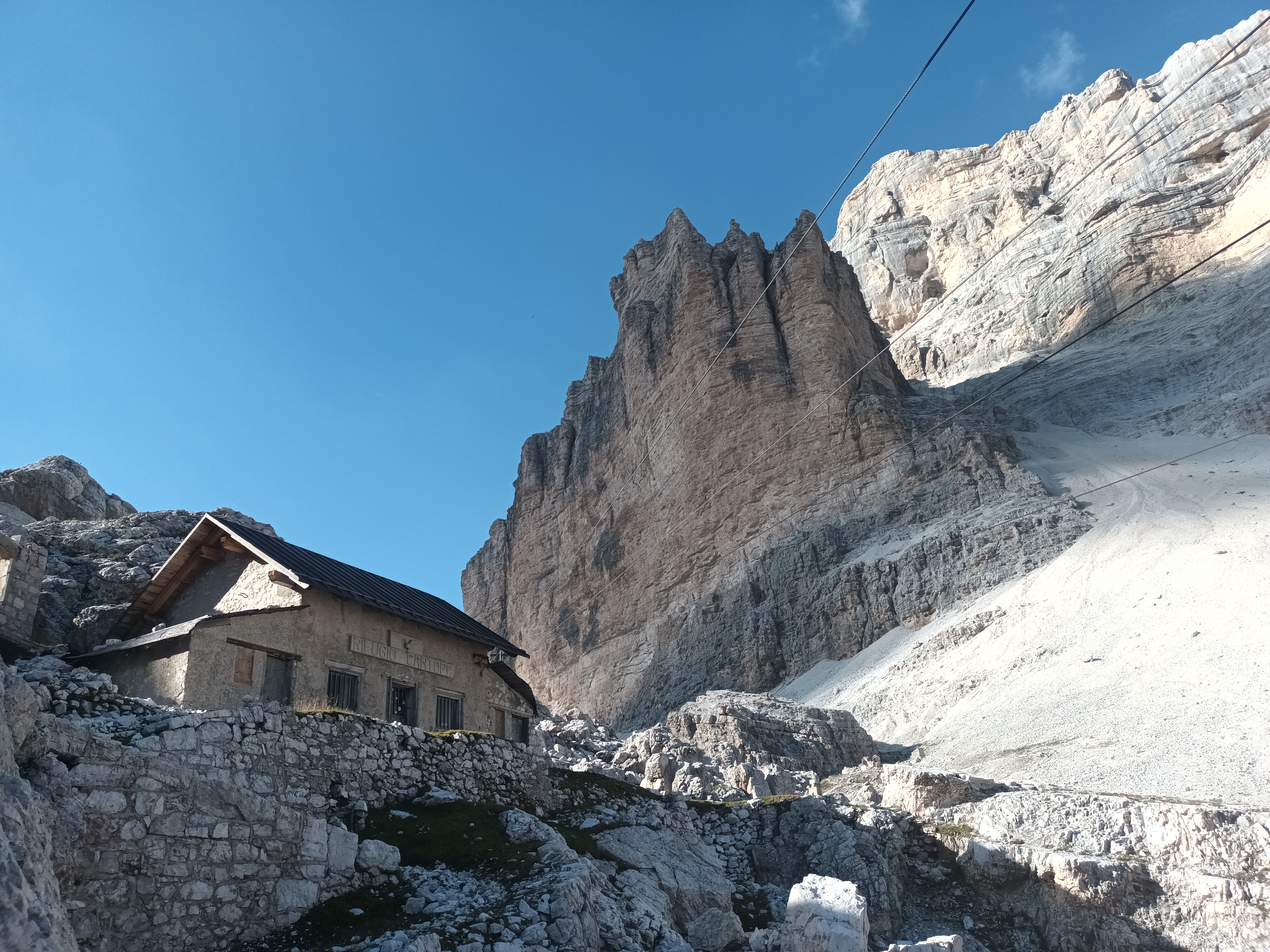 Descenso: Una vez que llegamos al gran gendarme podemos desencordarnos. A partir de ahí tendremos que seguir el sendero señalado con hitos. Habrá que atravesar una parte muy expuesta pero aún así seguiremos teniendo hitos. Tendremos que bajar hasta encontrar una antiguas construcciones de la Primera Guerra Mundial, y seguir el sendero hasta conectar con el camino de bajada al Refugio Dibona.