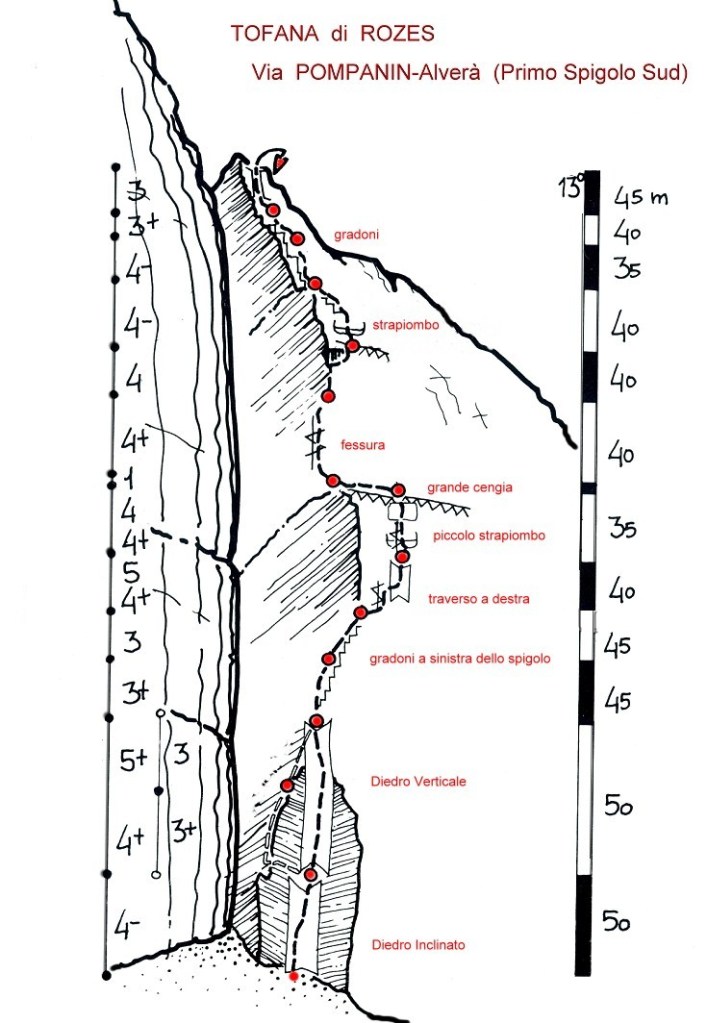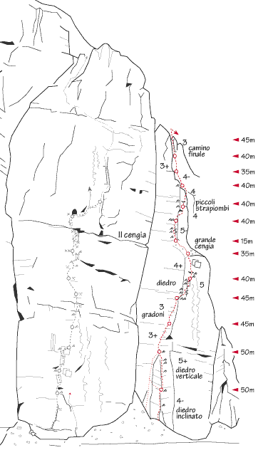 Largo 1, IV (50 metros): Empieza a la izquierda del diedro que forma el Spigolo con la pared. Es decir, se trata de un diedro tumbado a la izquierda del diedro principal. Bastante roto en apariencia.