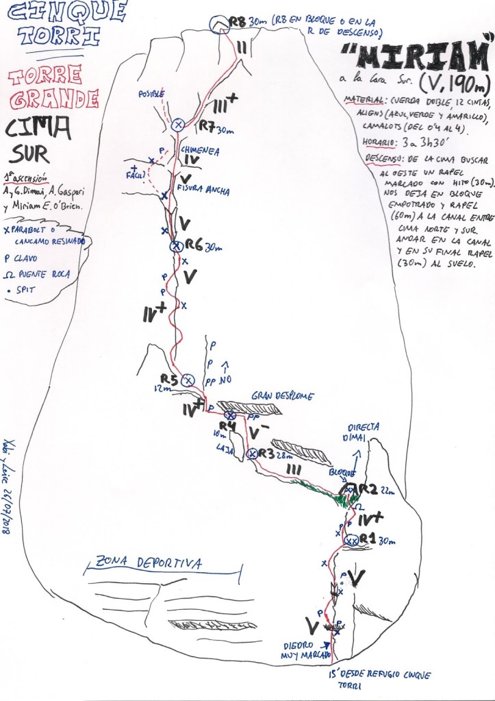 Primera ascensión: El 29 de junio de 1927, los guías de Ampezzo Angelo y Giuseppe Dimai, conocidos como “Déo”, trazaron una nueva y difícil ruta en la soleada cara sur de Torre Grande (Cima Sud) de Cinque Torri.