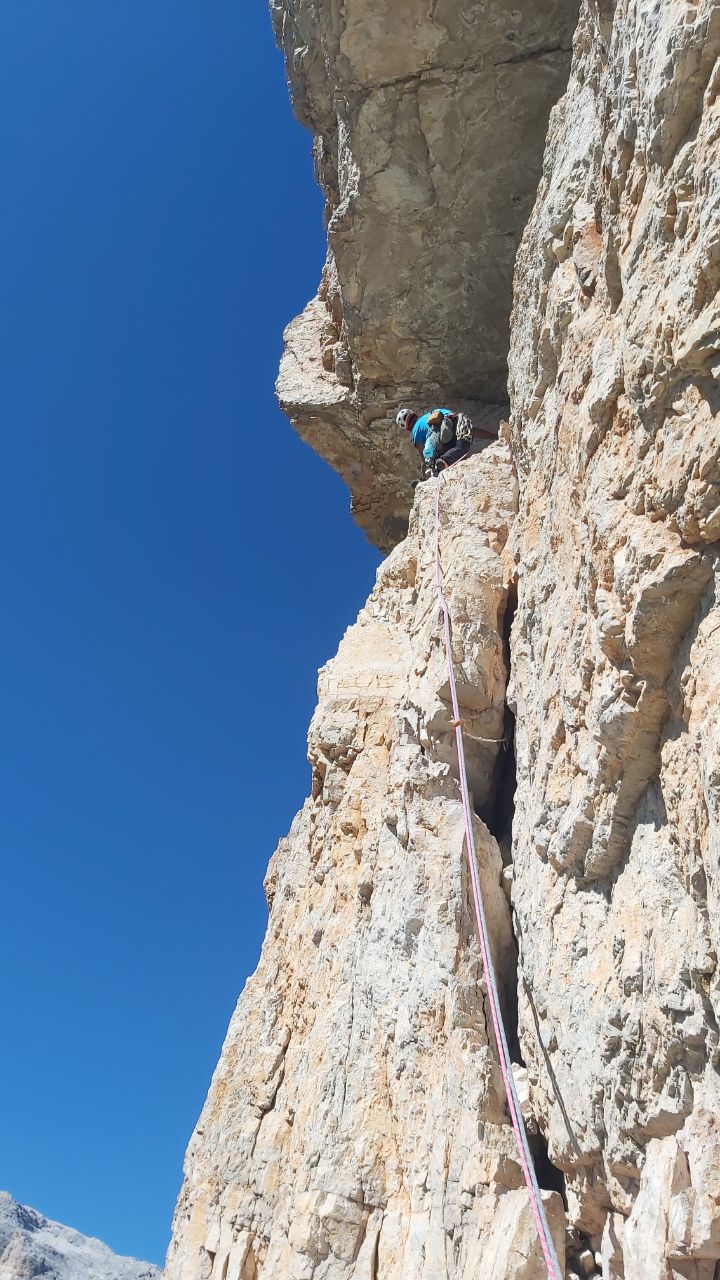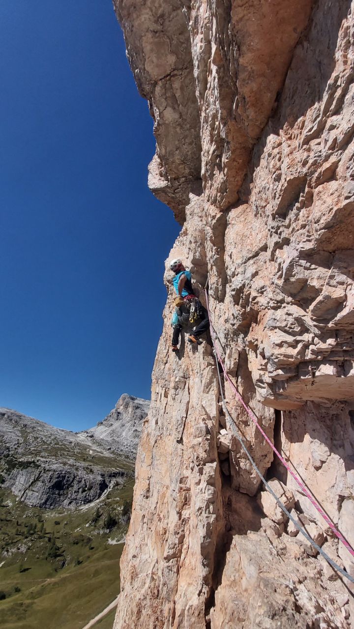 Primera ascensión: El 29 de junio de 1927, los guías de Ampezzo Angelo y Giuseppe Dimai, conocidos como “Déo”, trazaron una nueva y difícil ruta en la soleada cara sur de Torre Grande (Cima Sud) de Cinque Torri.