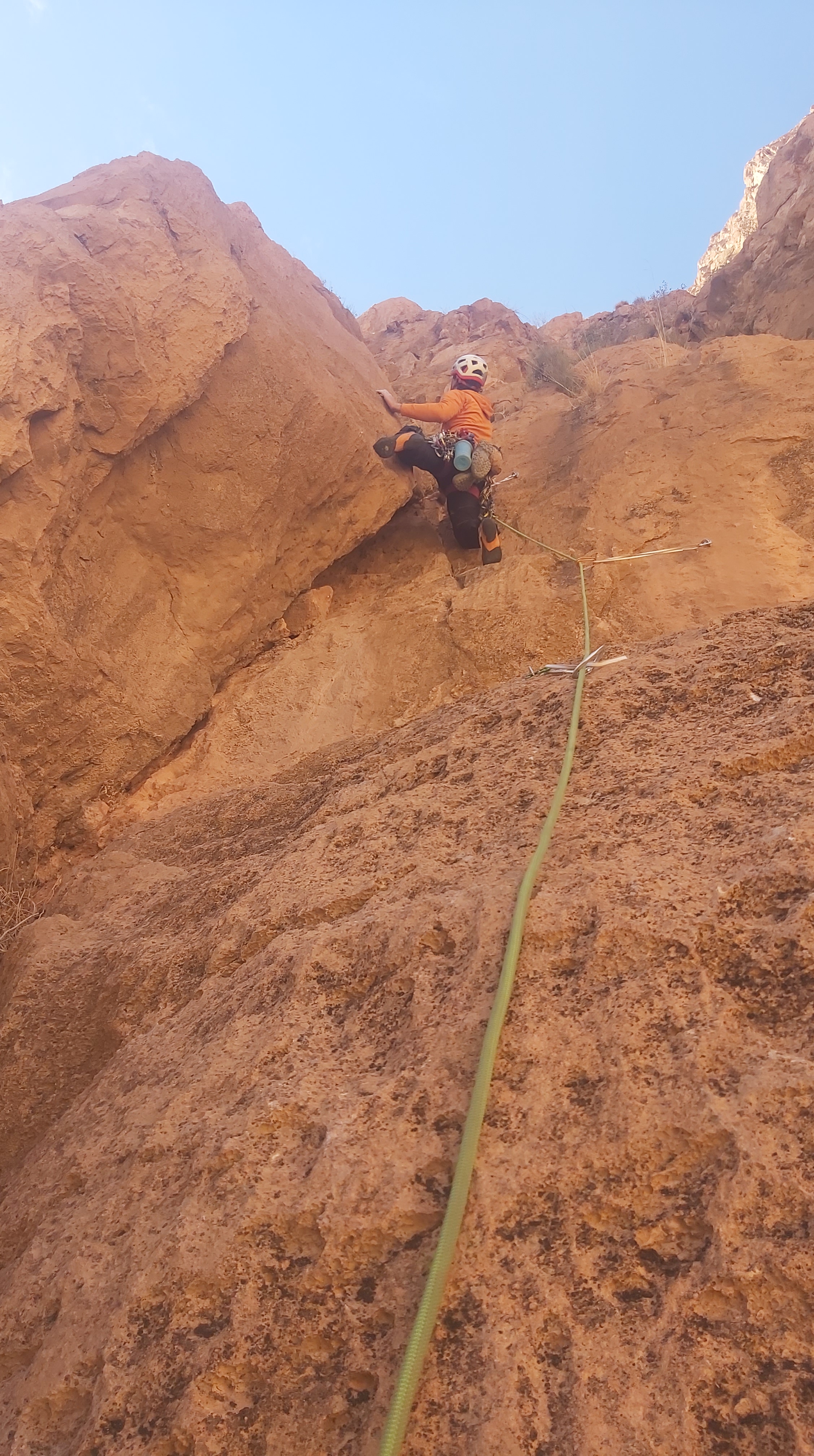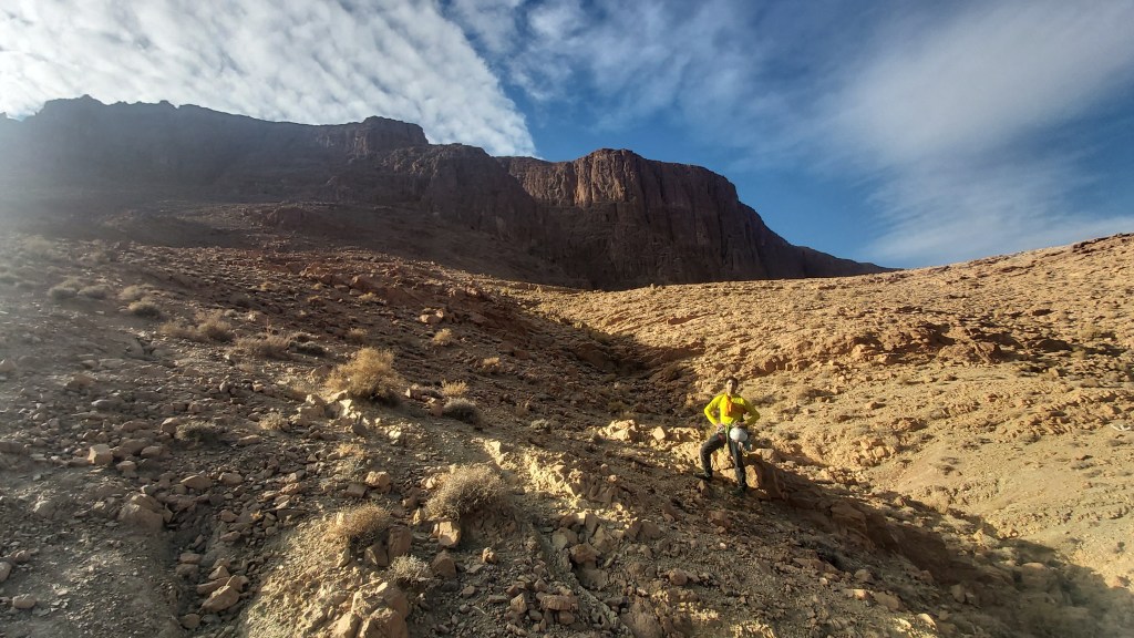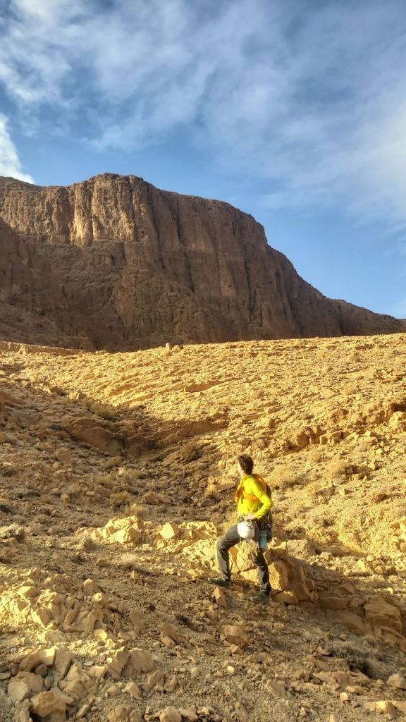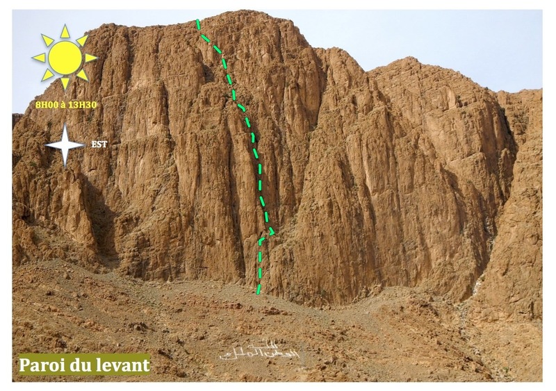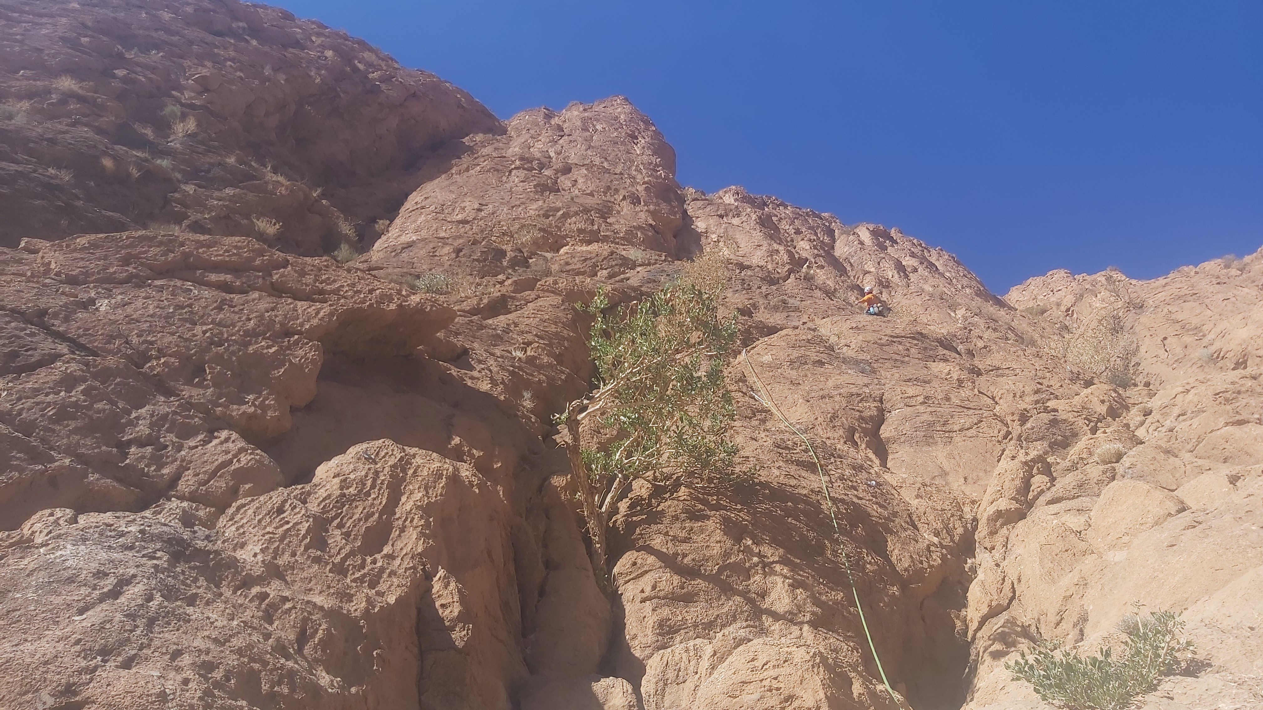Vía abierta con muy buen gusto, que en 4 largos te deja en una gran repisa desde la cual puedes salir a cima mediante unas trepadas por una gran canal. Perfecta para un día de descanso activo, aunque el descenso es muy largo si no lo haces rapelando. No obstante, el descenso andando es un precioso paseo por las montañas del Atlas, con grandes vistas y en el que nos encontramos con una gran familia de nómadas que estaban viviendo en unas casas cavadas en la roca. Espectacular.
