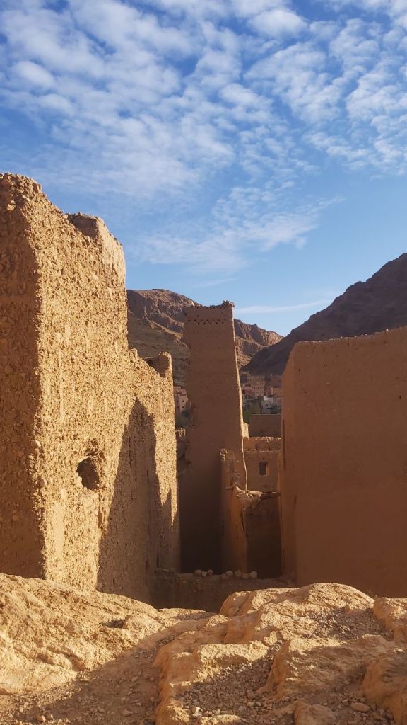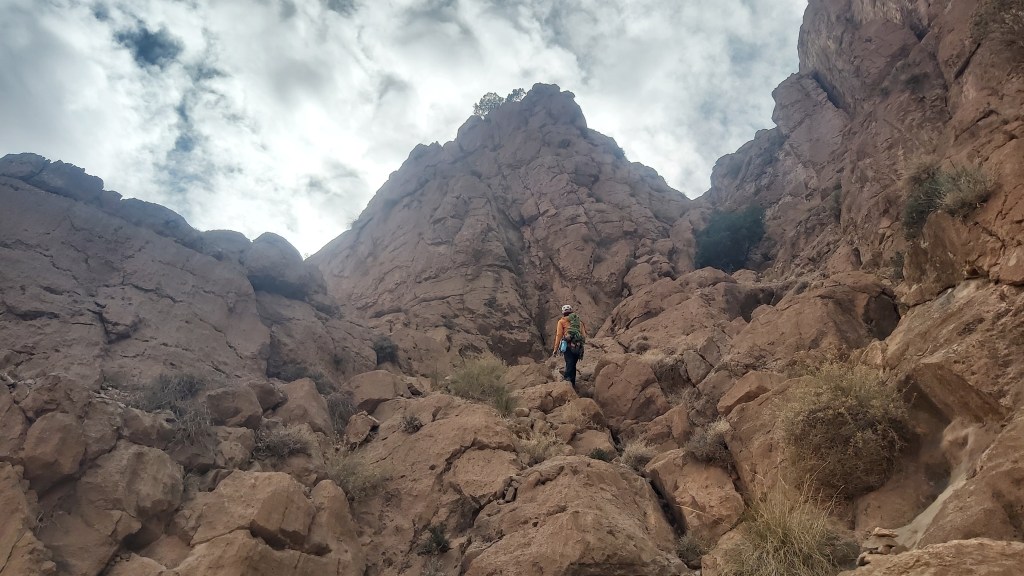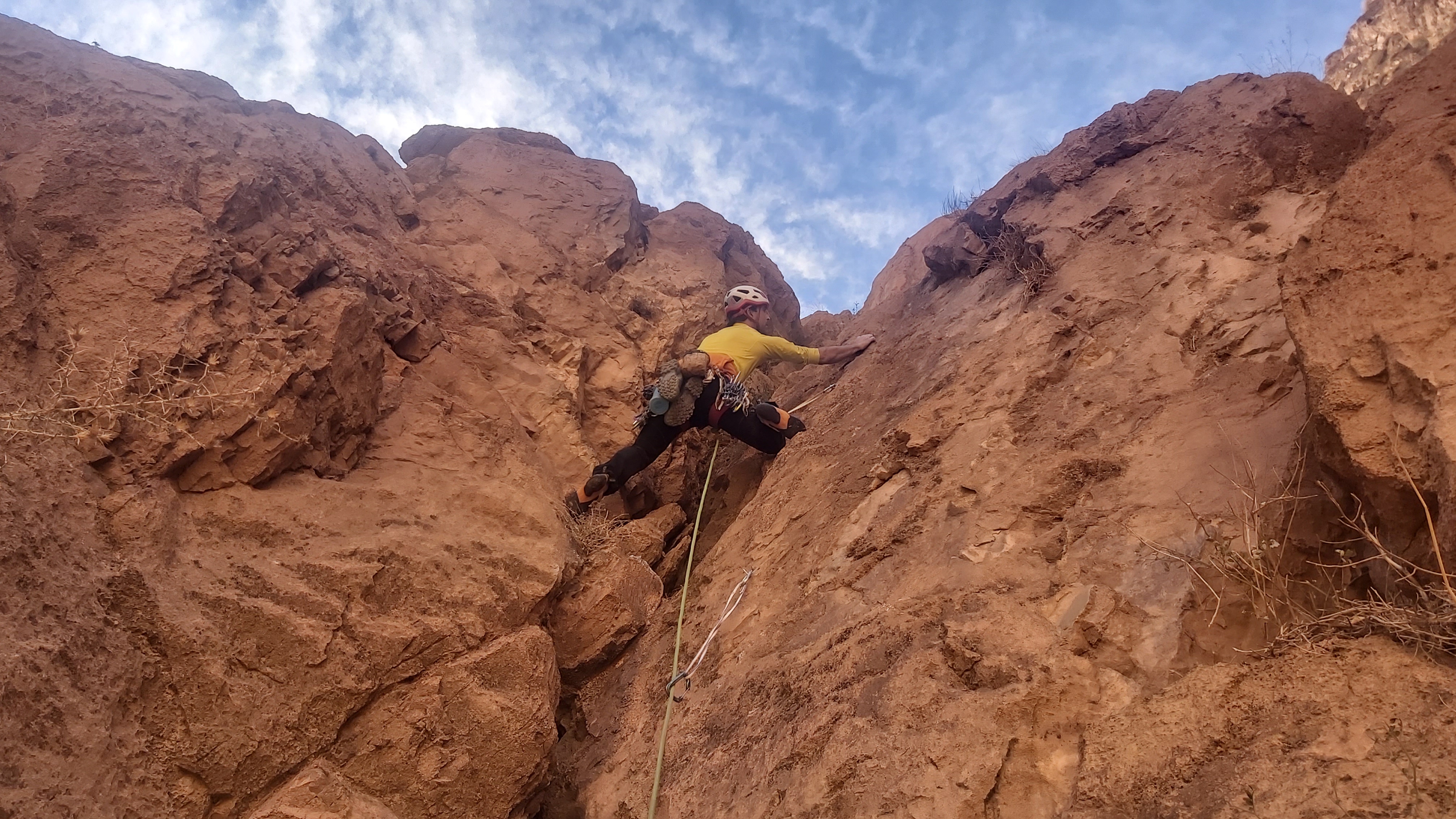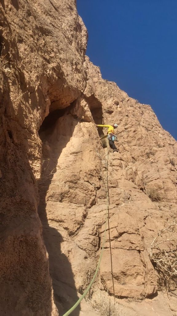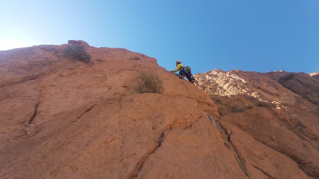 Vía abierta con muy buen gusto, que en 4 largos te deja en una gran repisa desde la cual puedes salir a cima mediante unas trepadas por una gran canal. Perfecta para un día de descanso activo, aunque el descenso es muy largo si no lo haces rapelando. No obstante, el descenso andando es un precioso paseo por las montañas del Atlas, con grandes vistas y en el que nos encontramos con una gran familia de nómadas que estaban viviendo en unas casas cavadas en la roca. Espectacular.