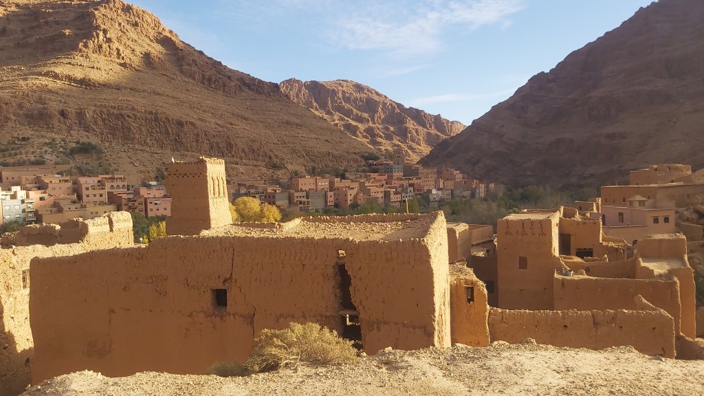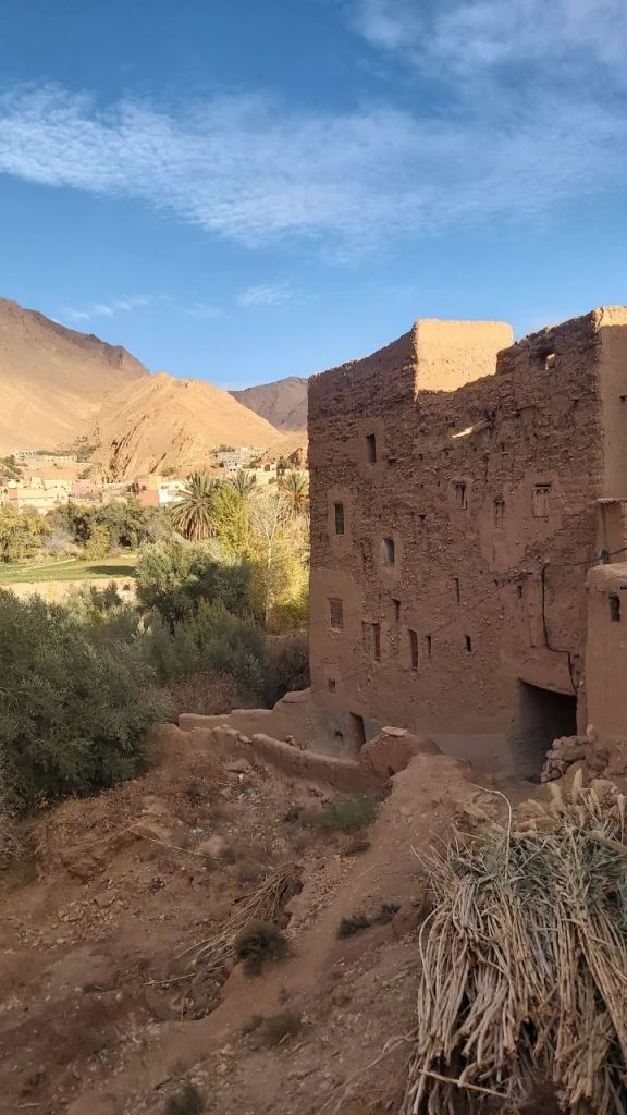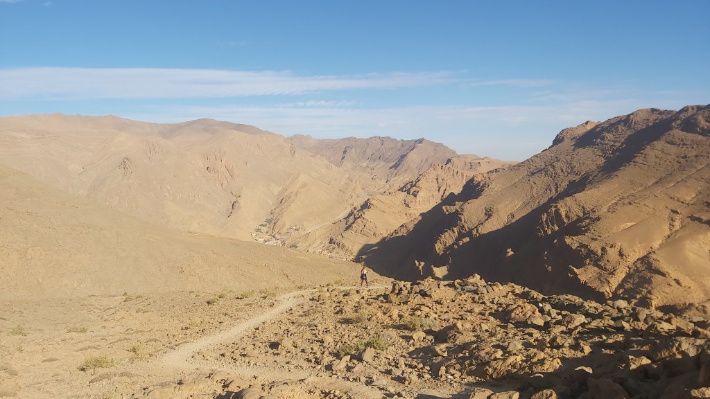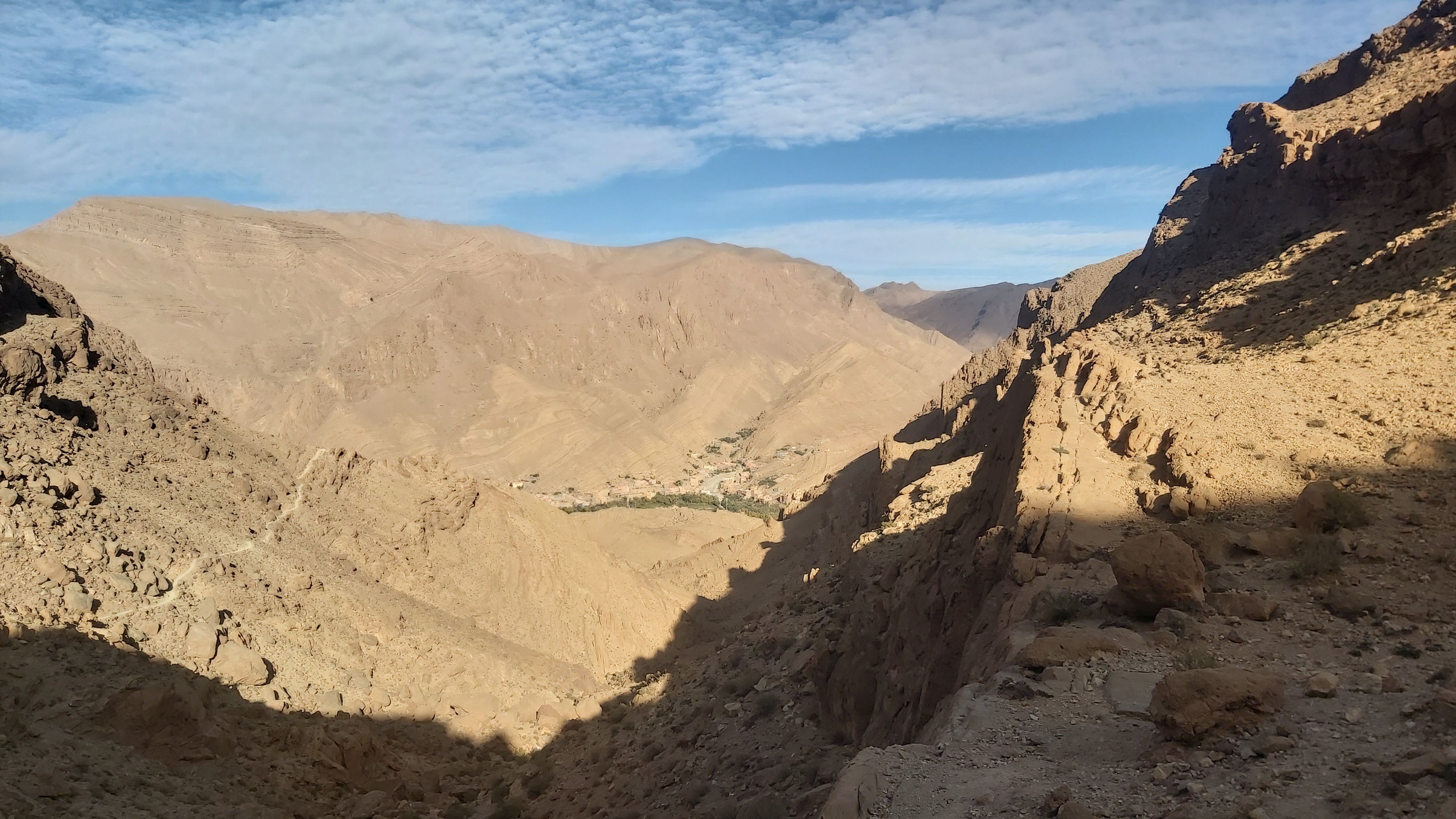 Descenso: El descenso es largo, muy largo, pero merece la pena porque es un camino precioso por las montañas con muy buenas vistas de Tinghir y de las montañas del Atlas. Hay que ir hasta la cima y desde ahí a la izquierda hasta el collado. Desde el collado ya bajamos al pueblo de nuevo. Espectacular.