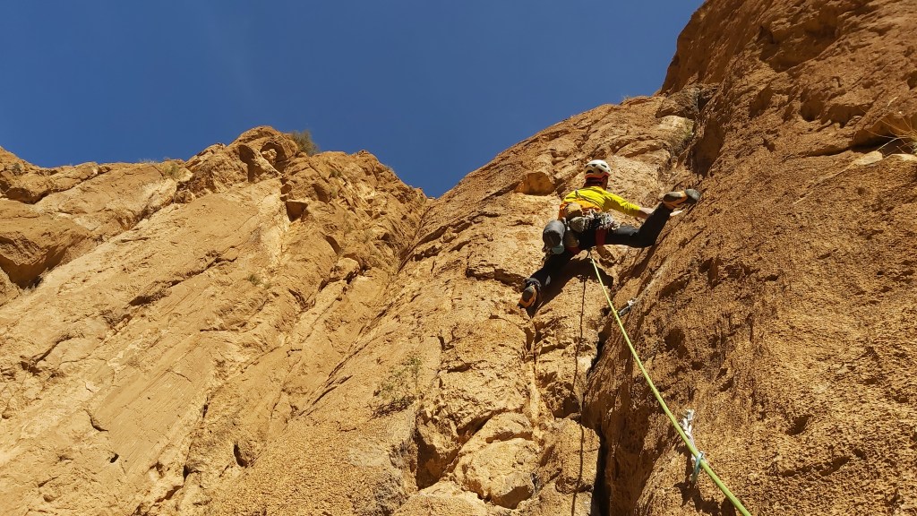 Salimos a la izquierda y vemos la tónica que seguirán los siguientes largos, pocos bolts y grandes alejes.