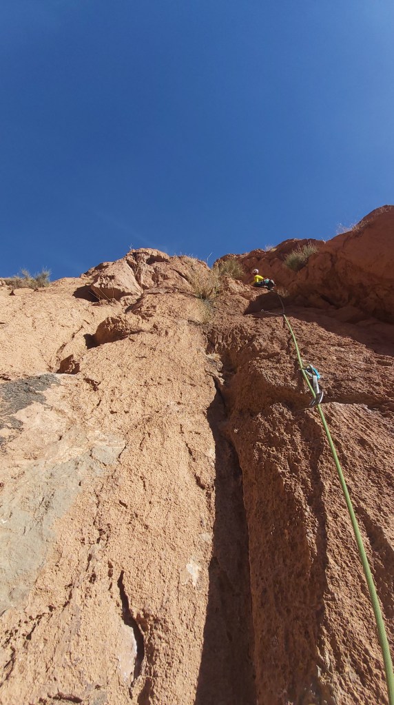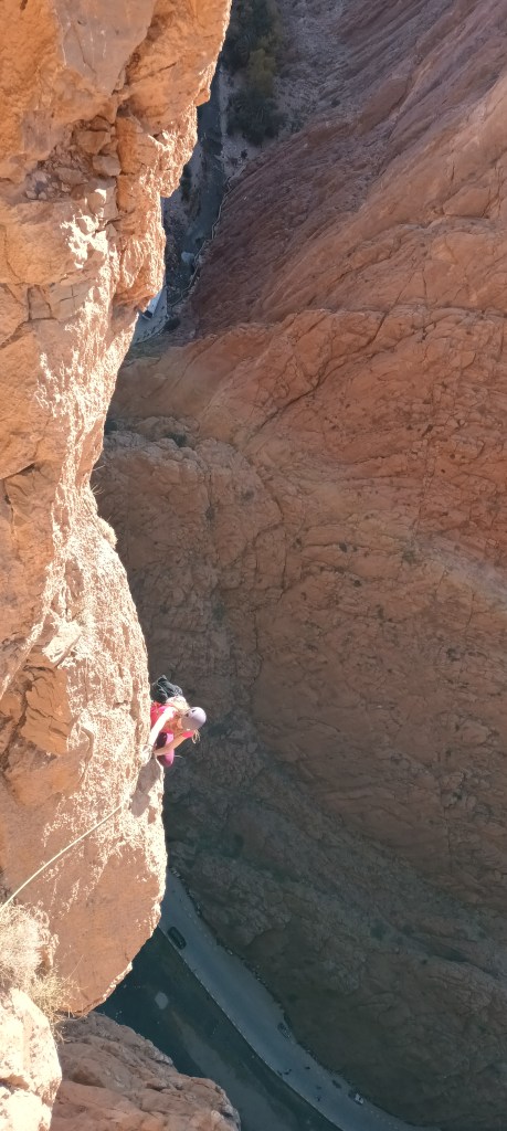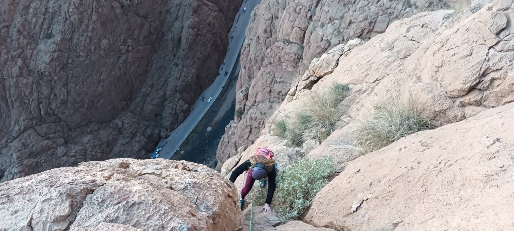 La sensación de estar en un lugar remoto (8 horas de autobus atravesando parajes áridos a través de las montañas del Atlas), la calidad de la roca compacta y abrasiva, los colores rojos de la roca y el horizonte…. el Oasis…. hacen que cada escalada se convierta en algo exótico nunca vivido anteriormente.