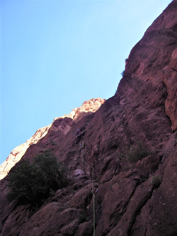 Largo 6, V+ (30 metros): Empieza con un paso a través de un agarre invertido que me pareció muy bonito. Después una bavaresa nos lleva a un techo con canto. Brutal.