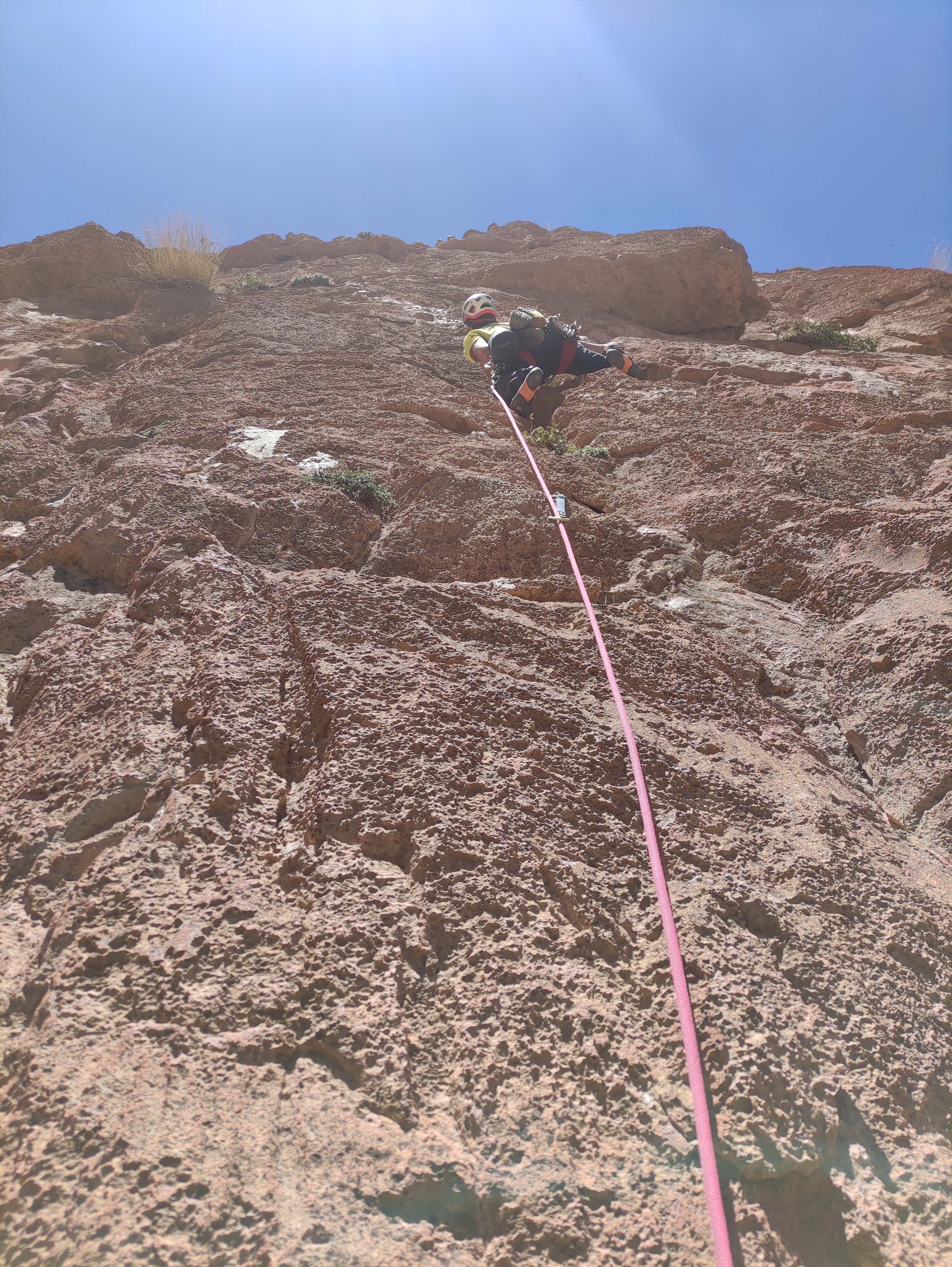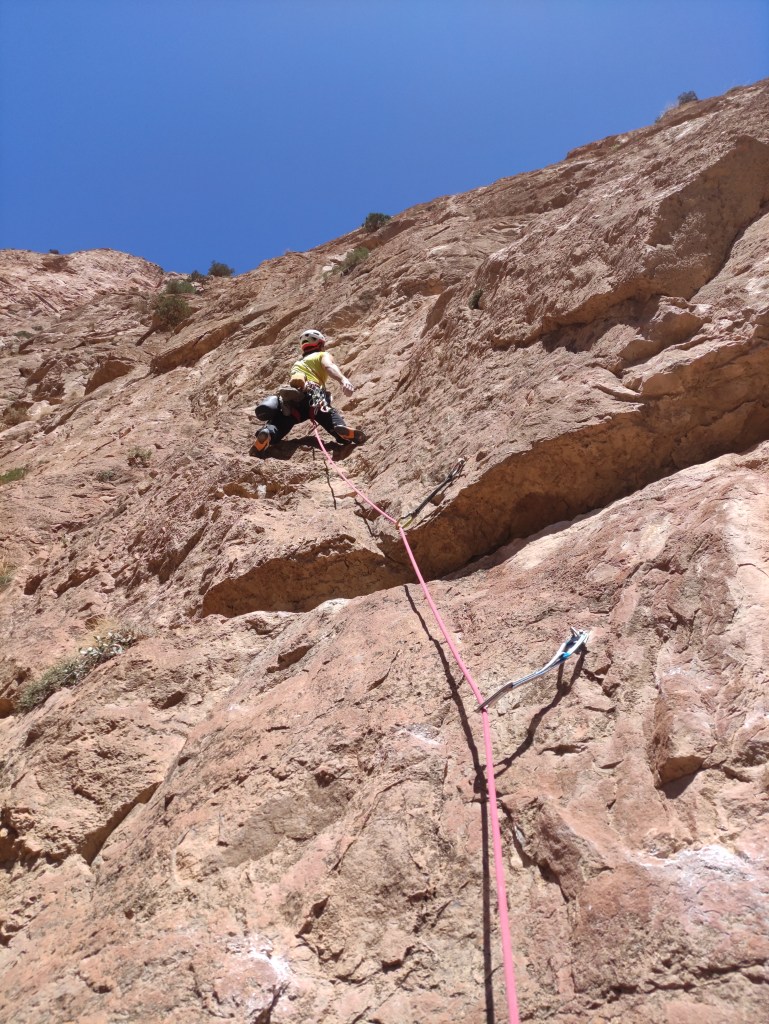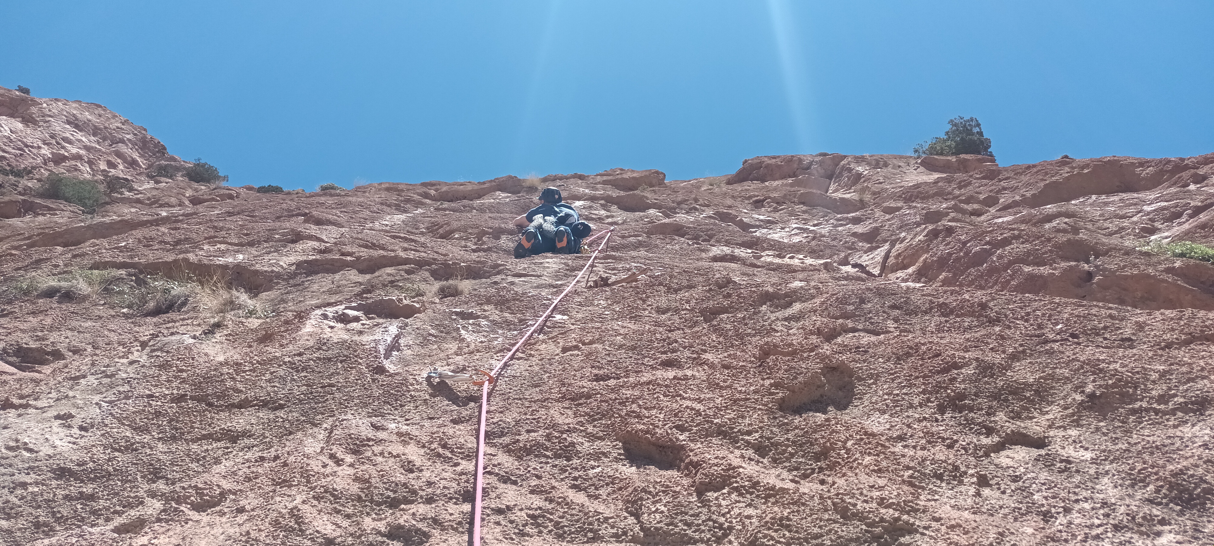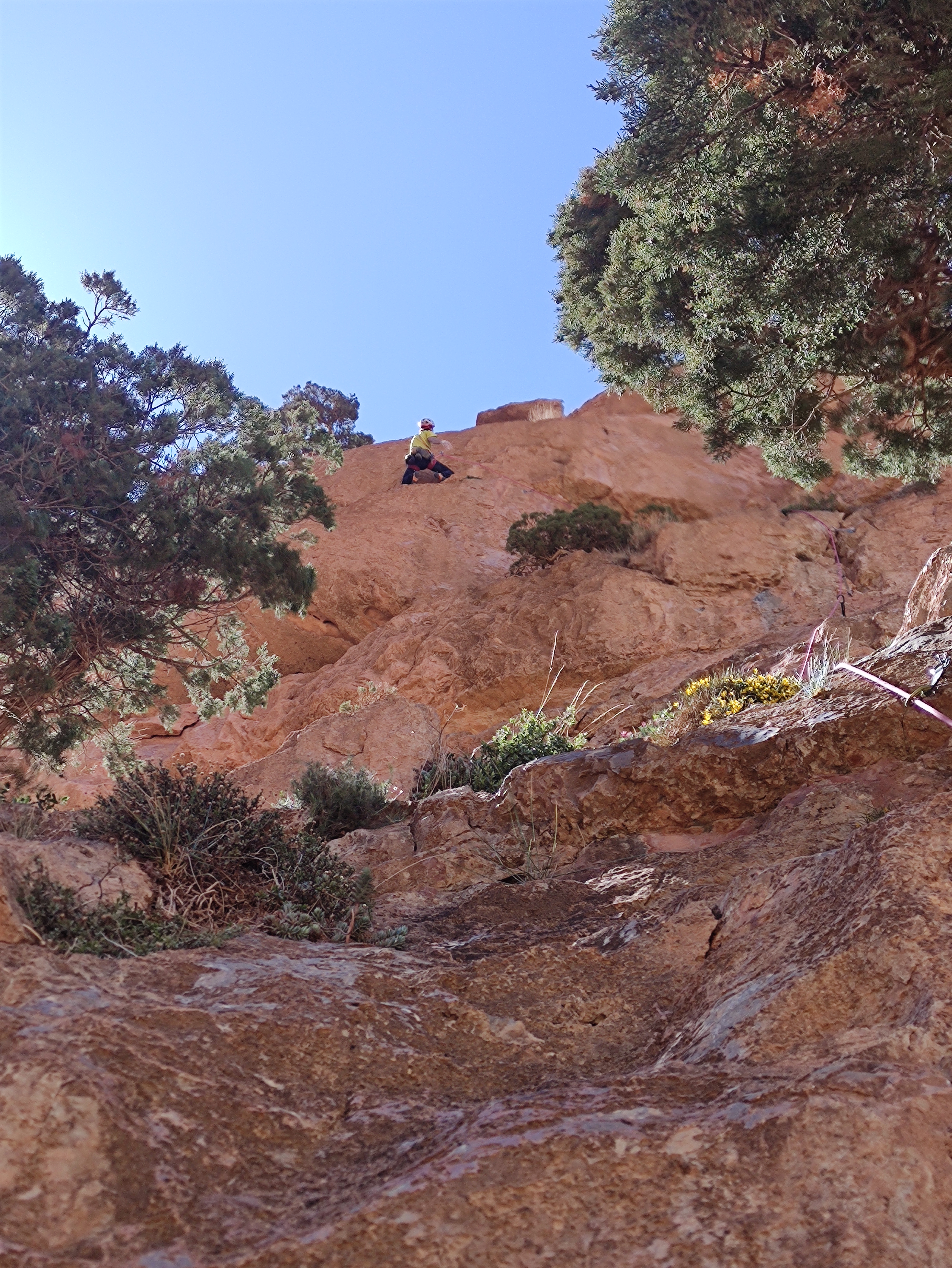 Largo 2, 6b (25 metros): Más duro que el anterior. De placa fina con un paso duro a la mitad. Y otro pequeño paso antes de la reunión. Sale a izquiedas para luego ir con tendencia a la derecha.