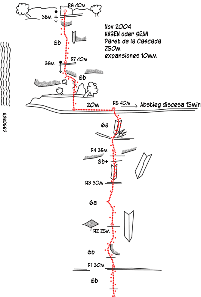 Largo 6, 6b (40 metros): 6b apoteósico. Empieza con un murito entre dos árboles. Superamos después unos grandes bloques. Para pasar a realizar una travesía a izquieda por debajo de un techo. Espectacular. Después una placa de gotas de agua hasta la reunión en otra pequeña vira.