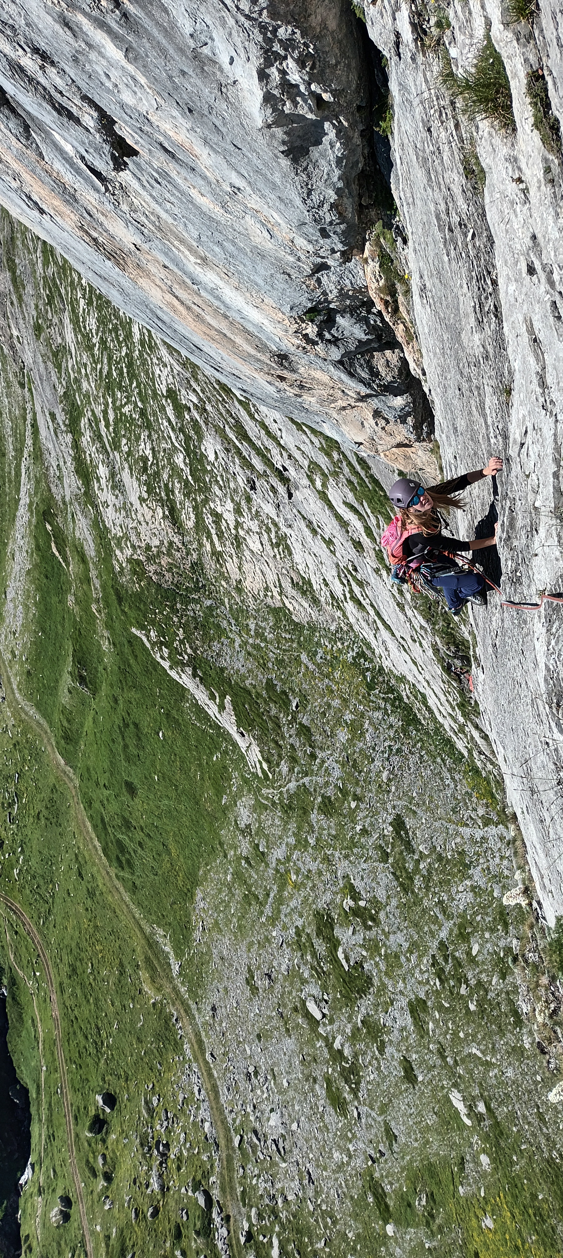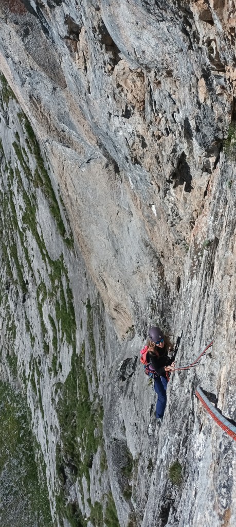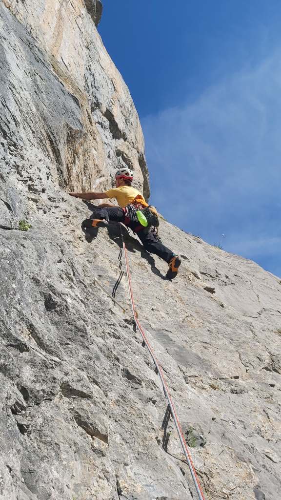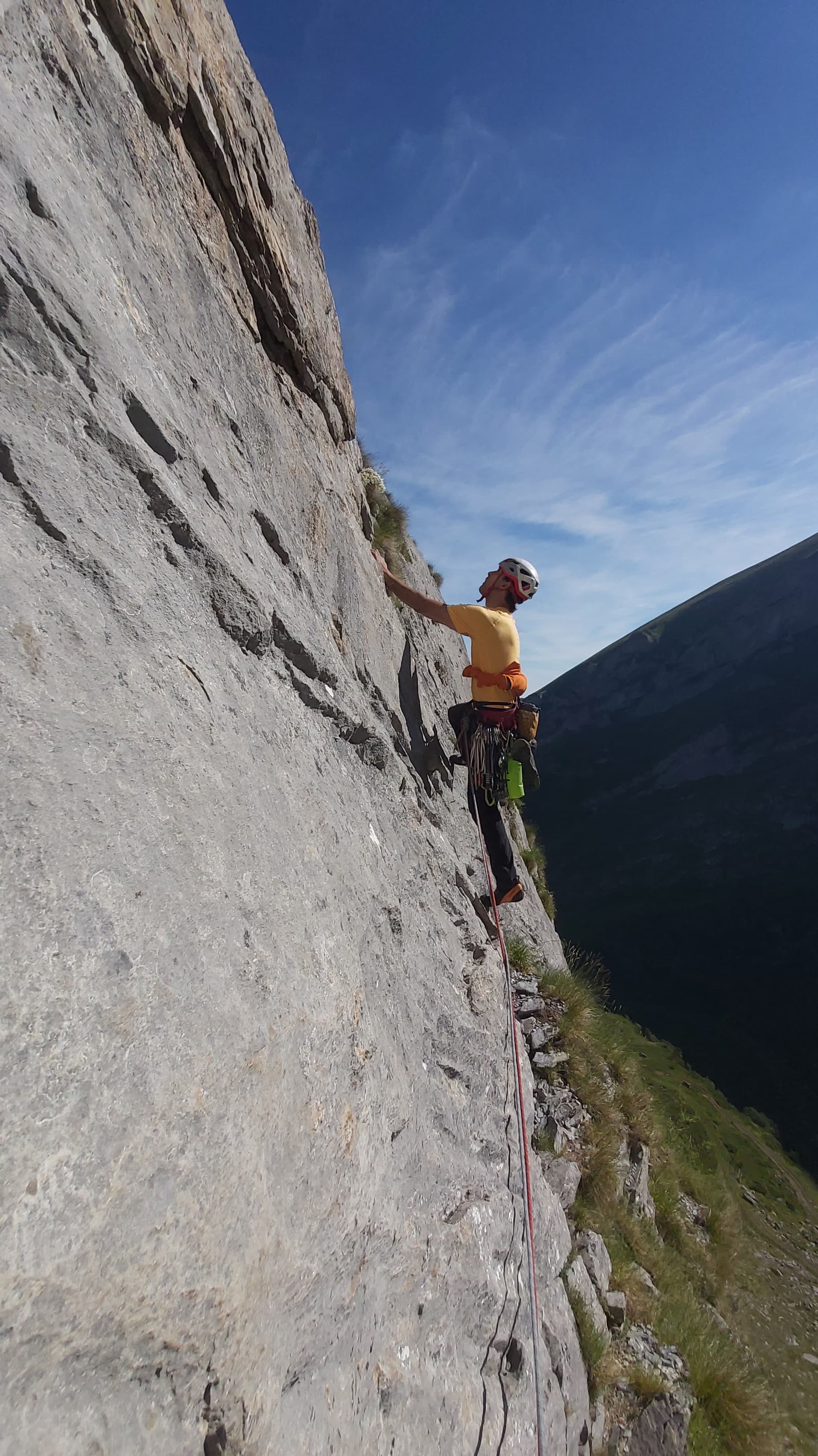 Largo 5, IV+ (30 metros): Salimos en recto por las placas, encontramos un bolt en la arista y nos asomamos al otro valle. En esa repisa (con vistas al otro valle, a la sombra) montamos reunión sobre 2 clavos.
