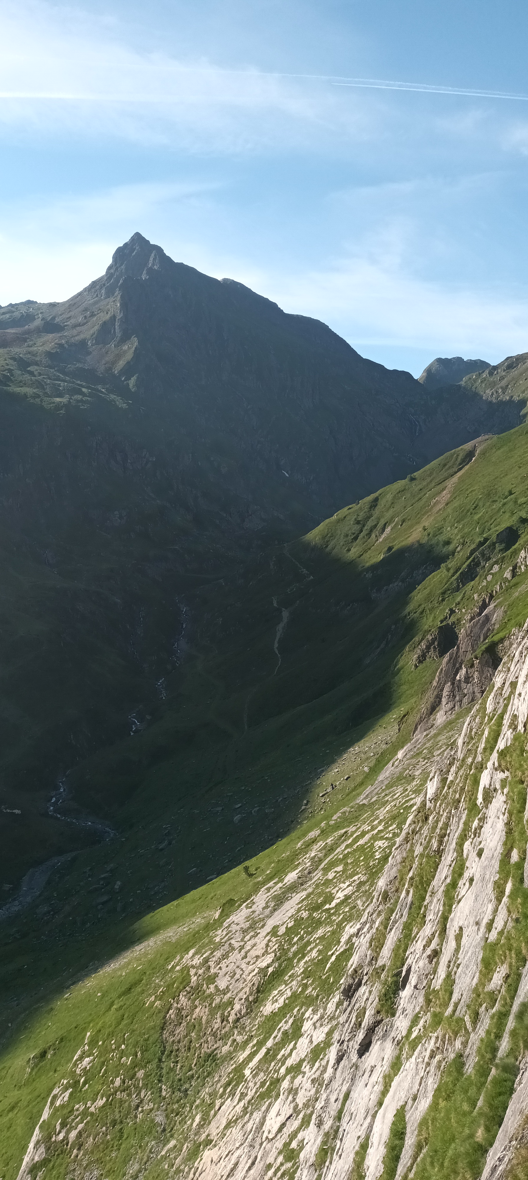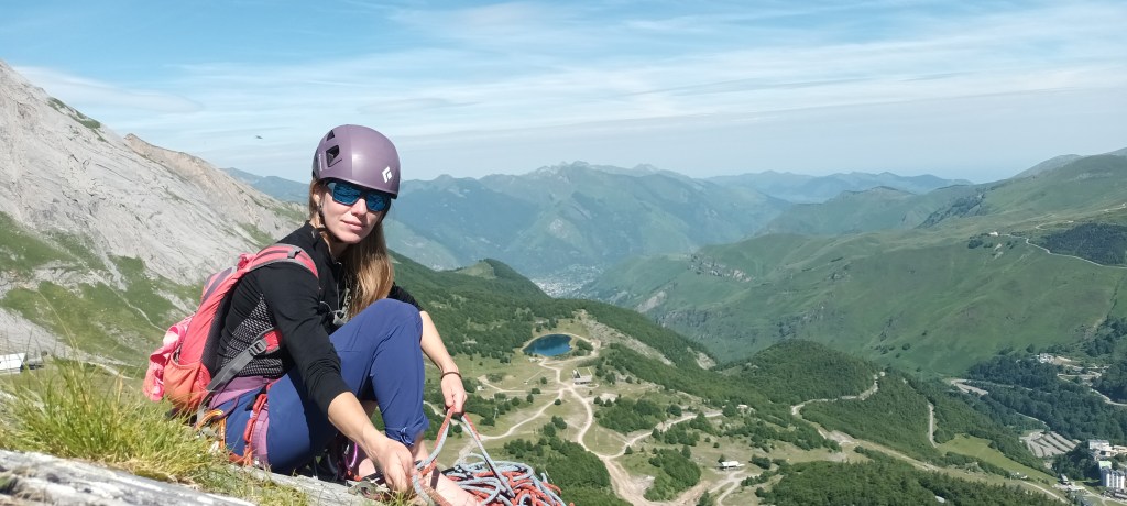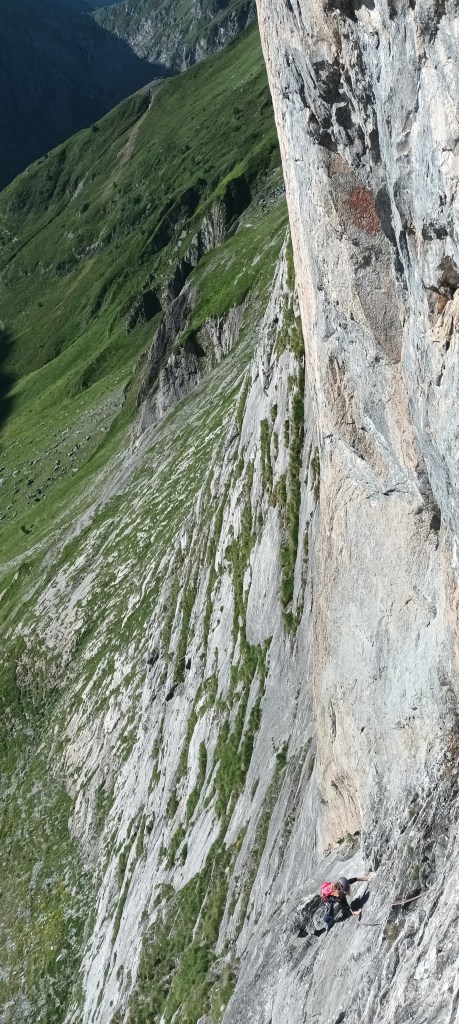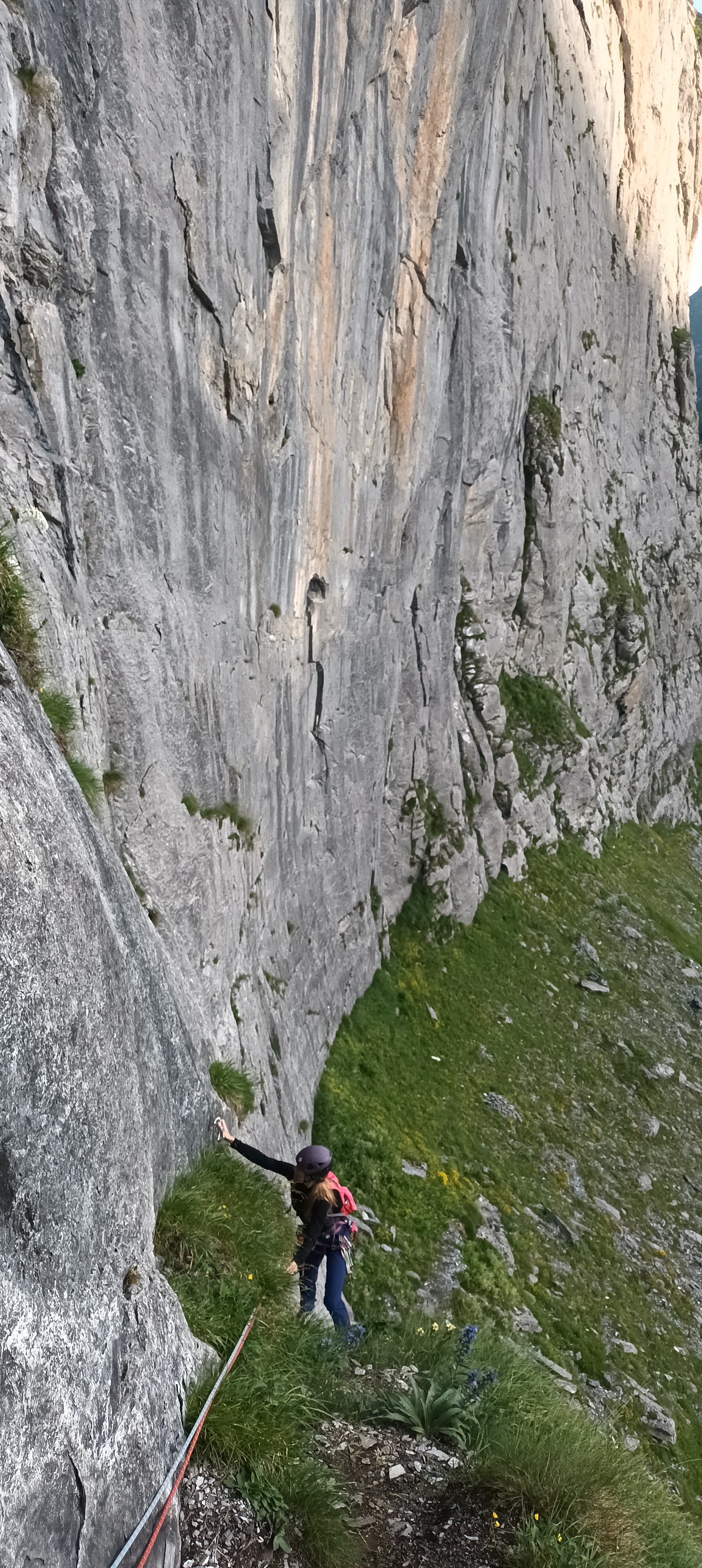 Largo 5, IV+ (30 metros): Salimos en recto por las placas, encontramos un bolt en la arista y nos asomamos al otro valle. En esa repisa (con vistas al otro valle, a la sombra) montamos reunión sobre 2 clavos.