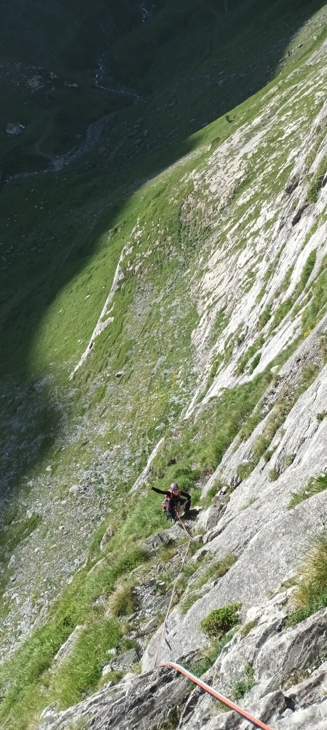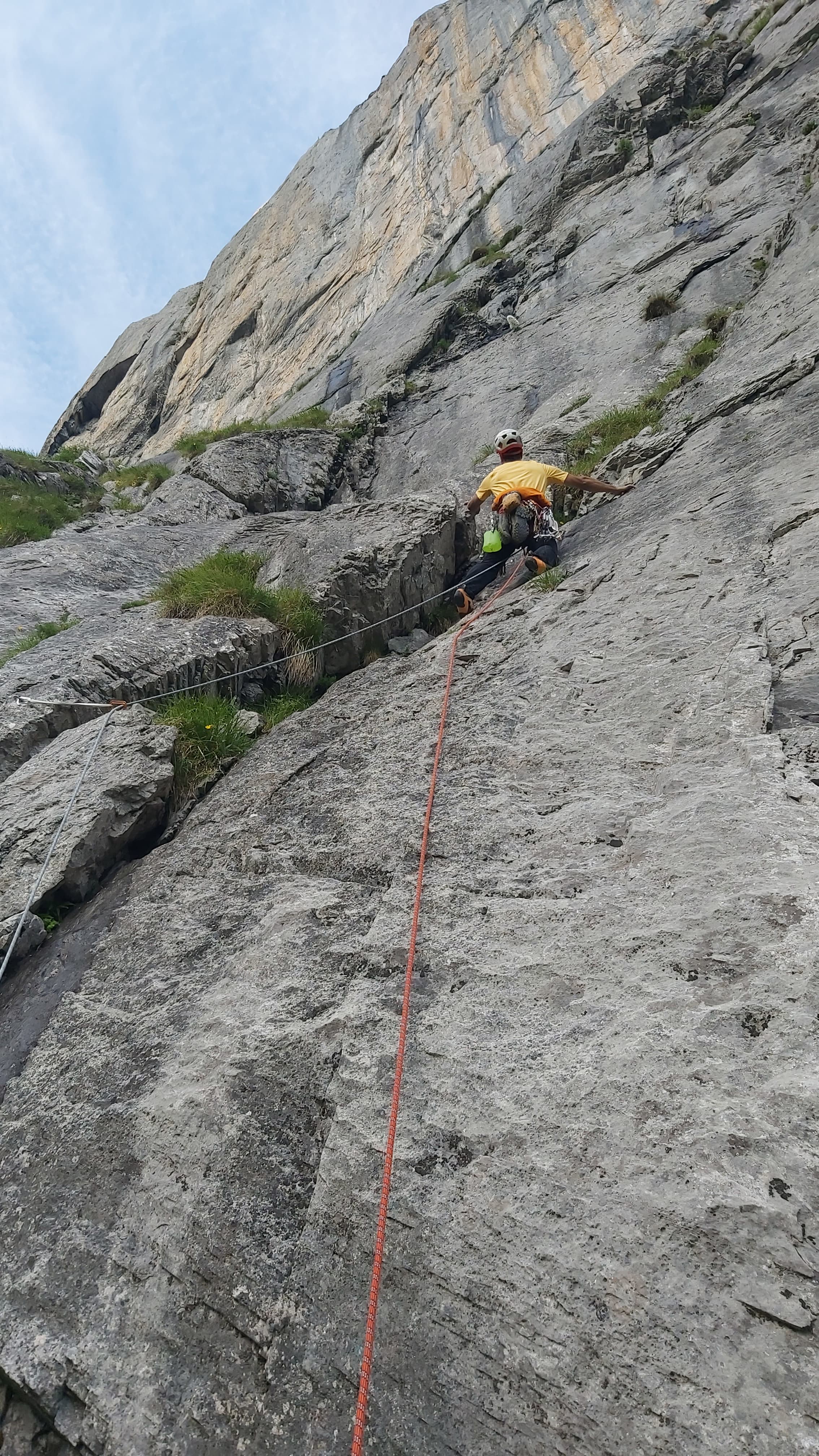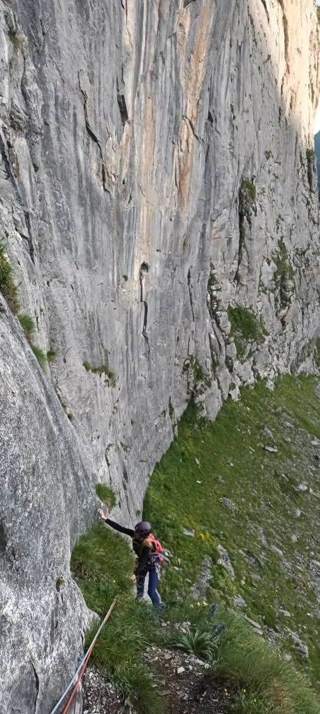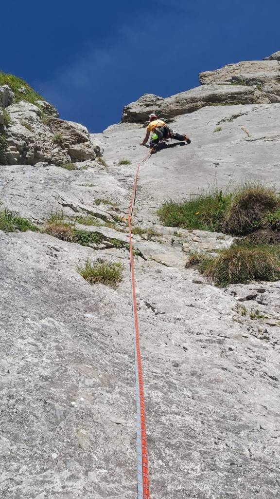 Largo 2, IV (35 metros): Salimos a izquierda y después recto hacia arriba por terreno herboso hasta la siguiente reunión. Largo feo. Reunión cómoda.