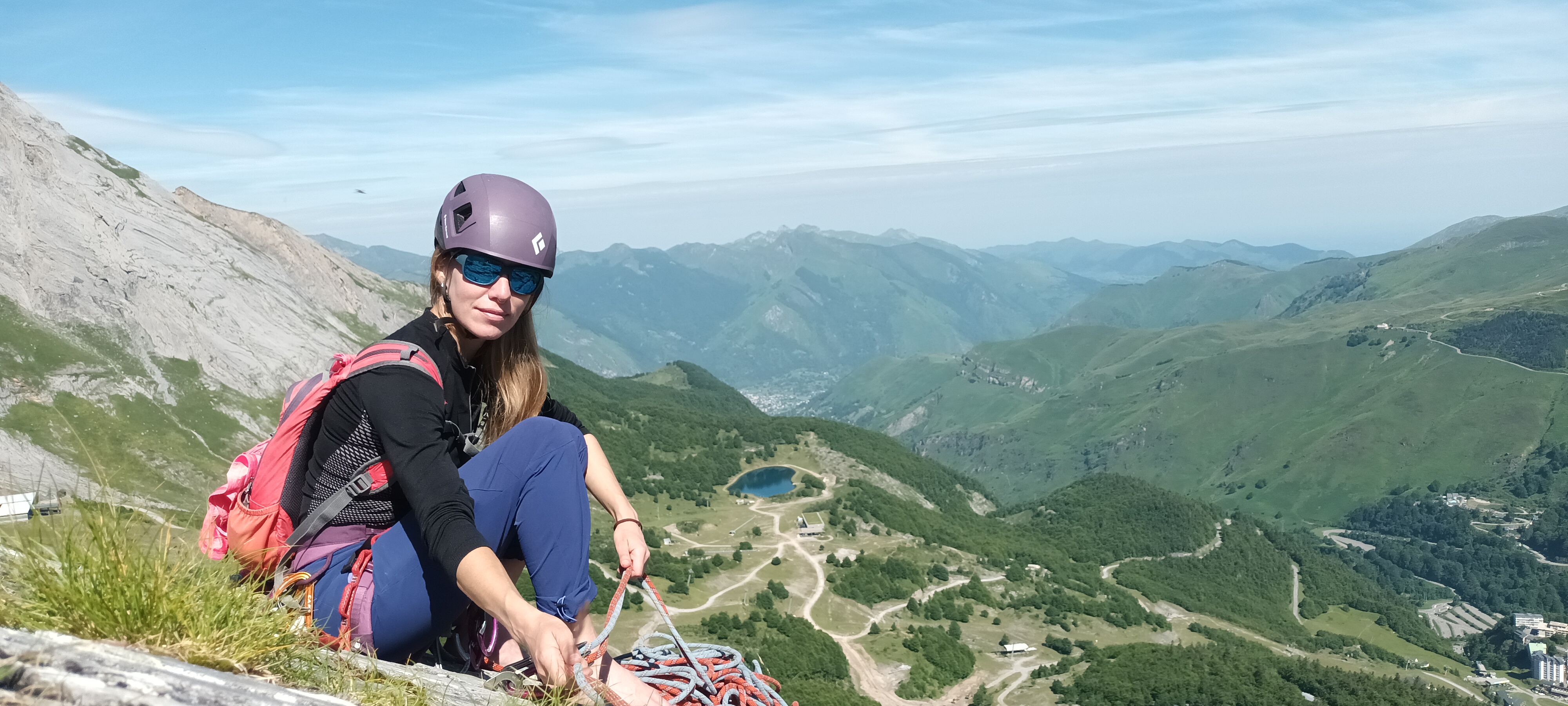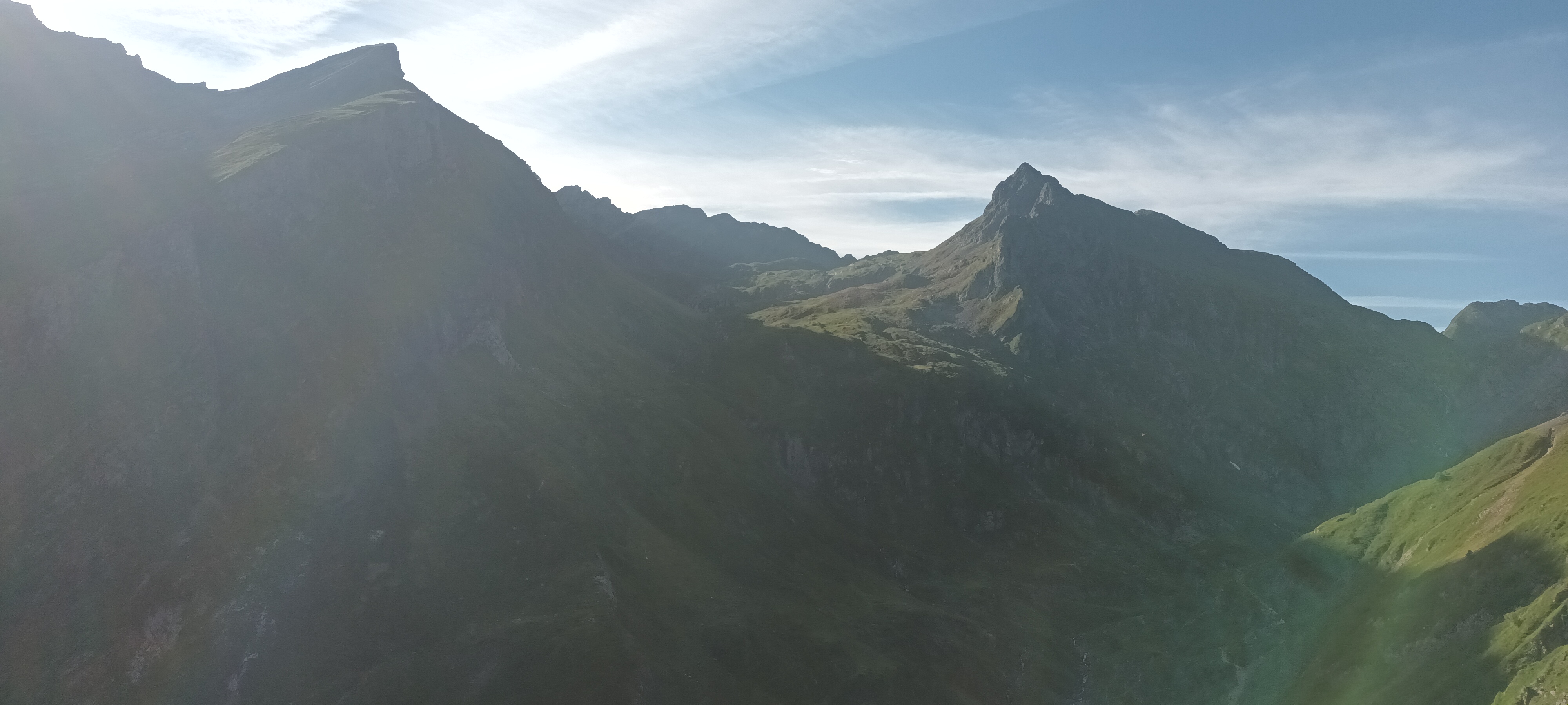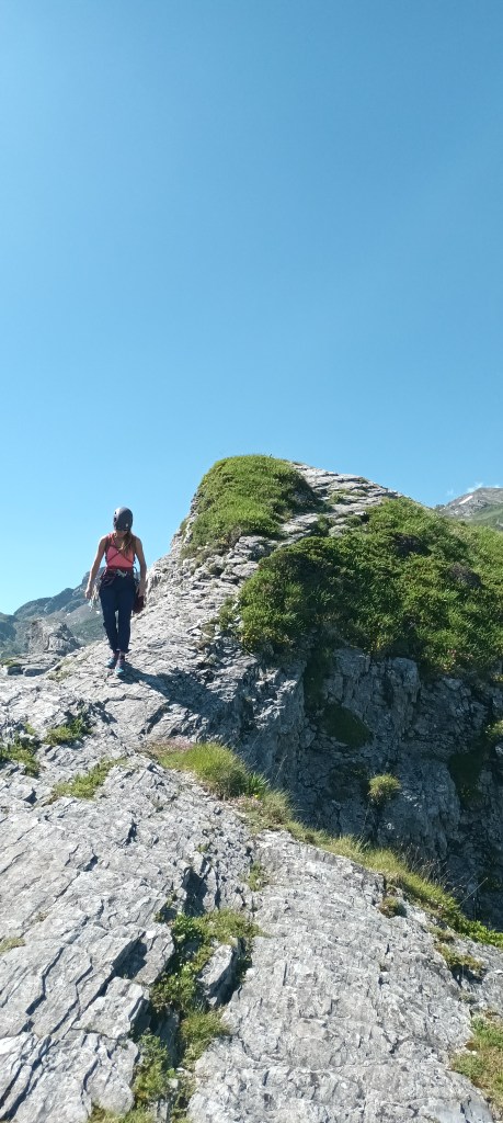 Descenso: Una vez en la cima nos dirigimos hacia la derecha (hacia Gourette). Pasaremos un tramo de arista con vacío a ambos lados y después seguir por el sendero que nos conducirá a tierra firme, alternando tramos de sendero con destrepes resbaladizos. Una vez en tierra firme, tendremos que retroceder unos centenares de metros hasta alcanzar el mismo camino que hemos realizado en la aproximación y atravesar el bosque de nuevo.