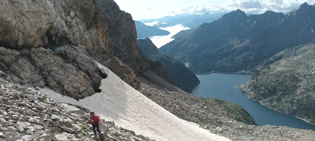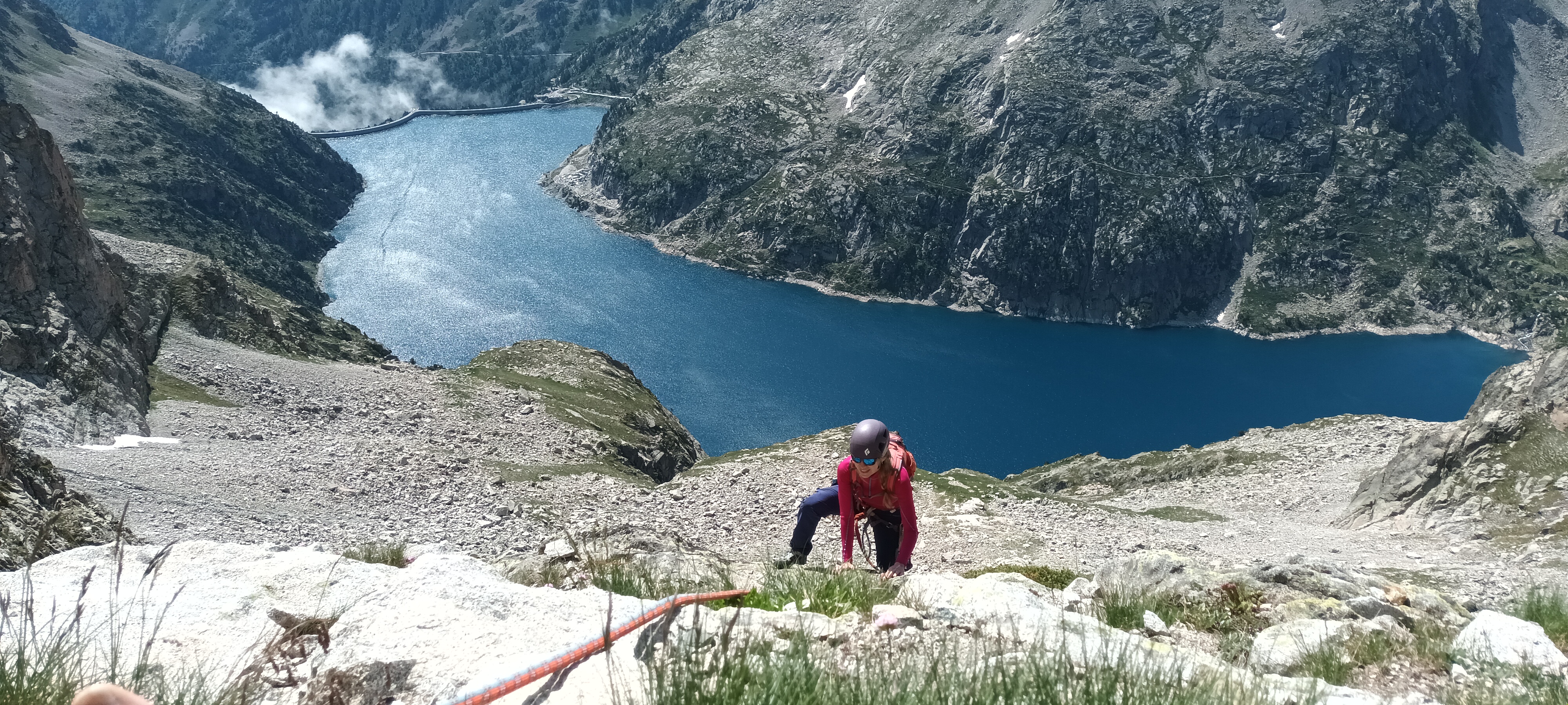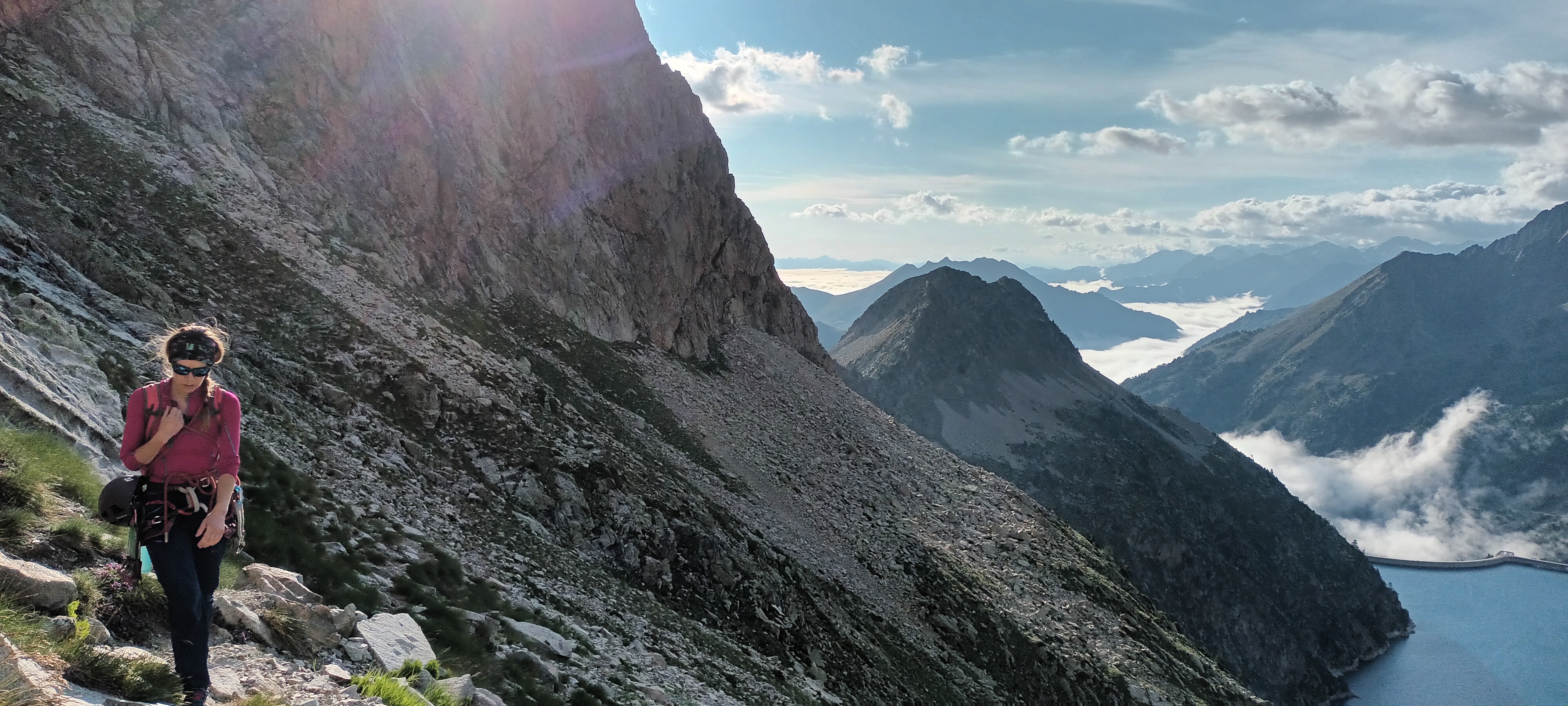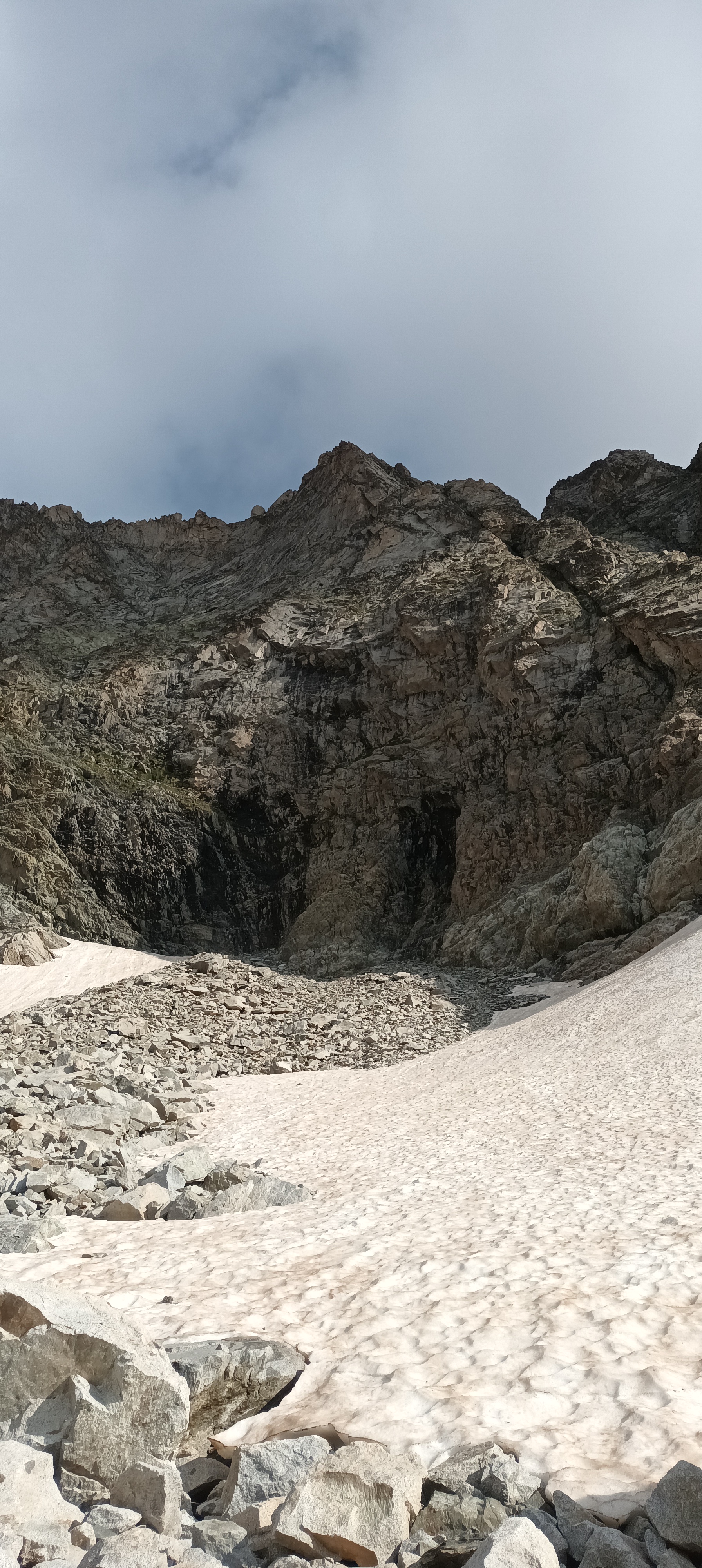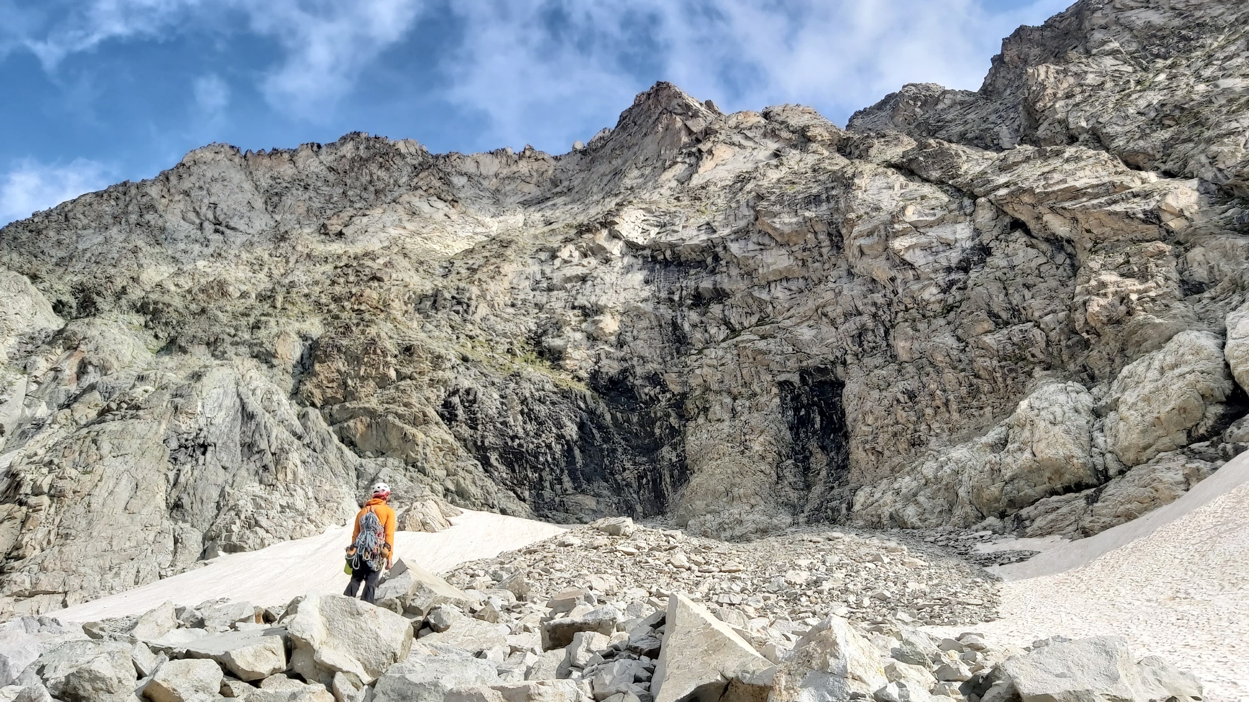 Aproximación: Atravesamos la presa de Cap de Long y seguimos el sendero que va ascendiendo hacia el paso del gato. Dejamos este paso a nuestra derecha y continuamos por el sendero, con la muralla sur del Ramougn a nuestra derecha, hasta el pie de vía. Cuando hicimos la vía, el pie de vía se encontraba justo entre dos neveros. Para identificarla, nos podemos servir de la pequeña chimenea característica del primer largo. También nos pueden servir las dos manchas negras de agua, la vía se encuentra justo en medio de estas manchas.