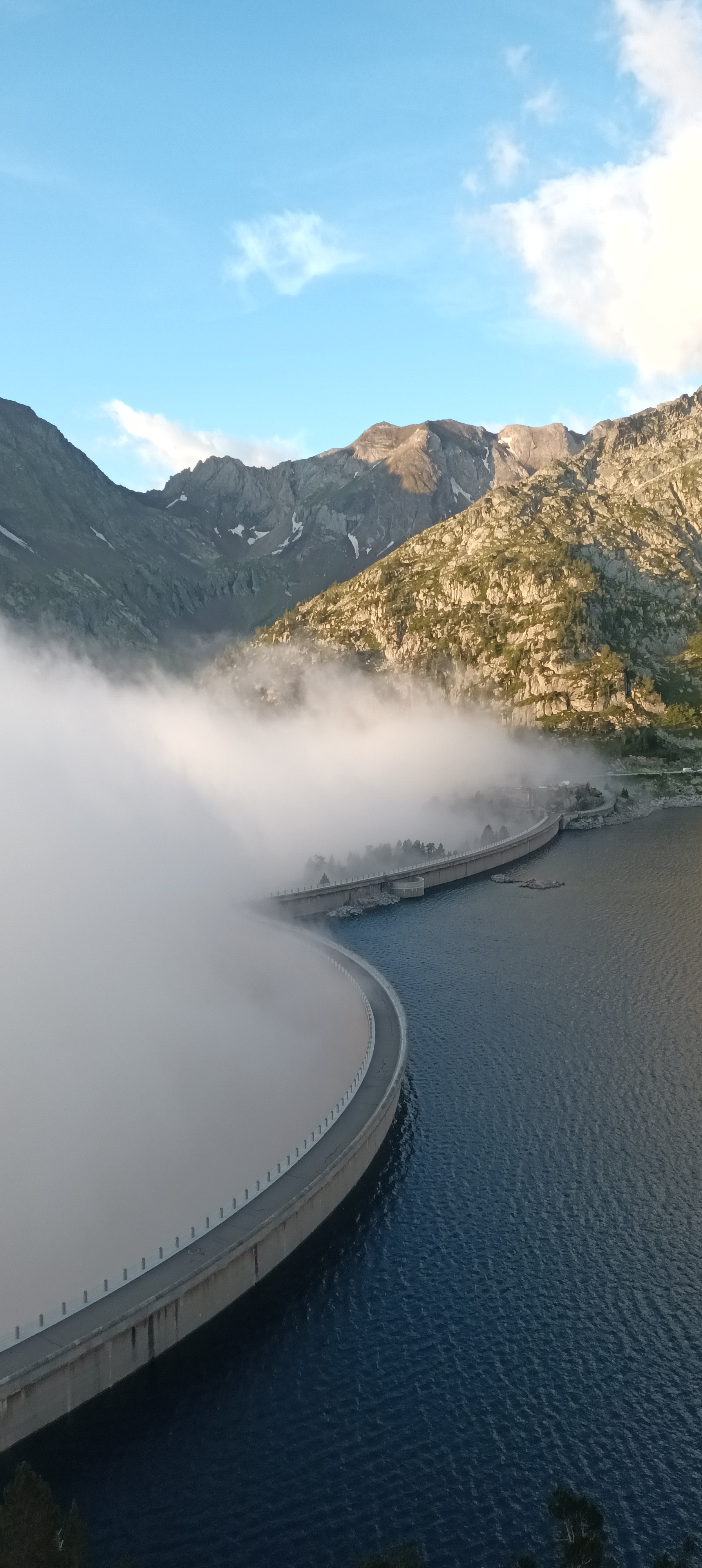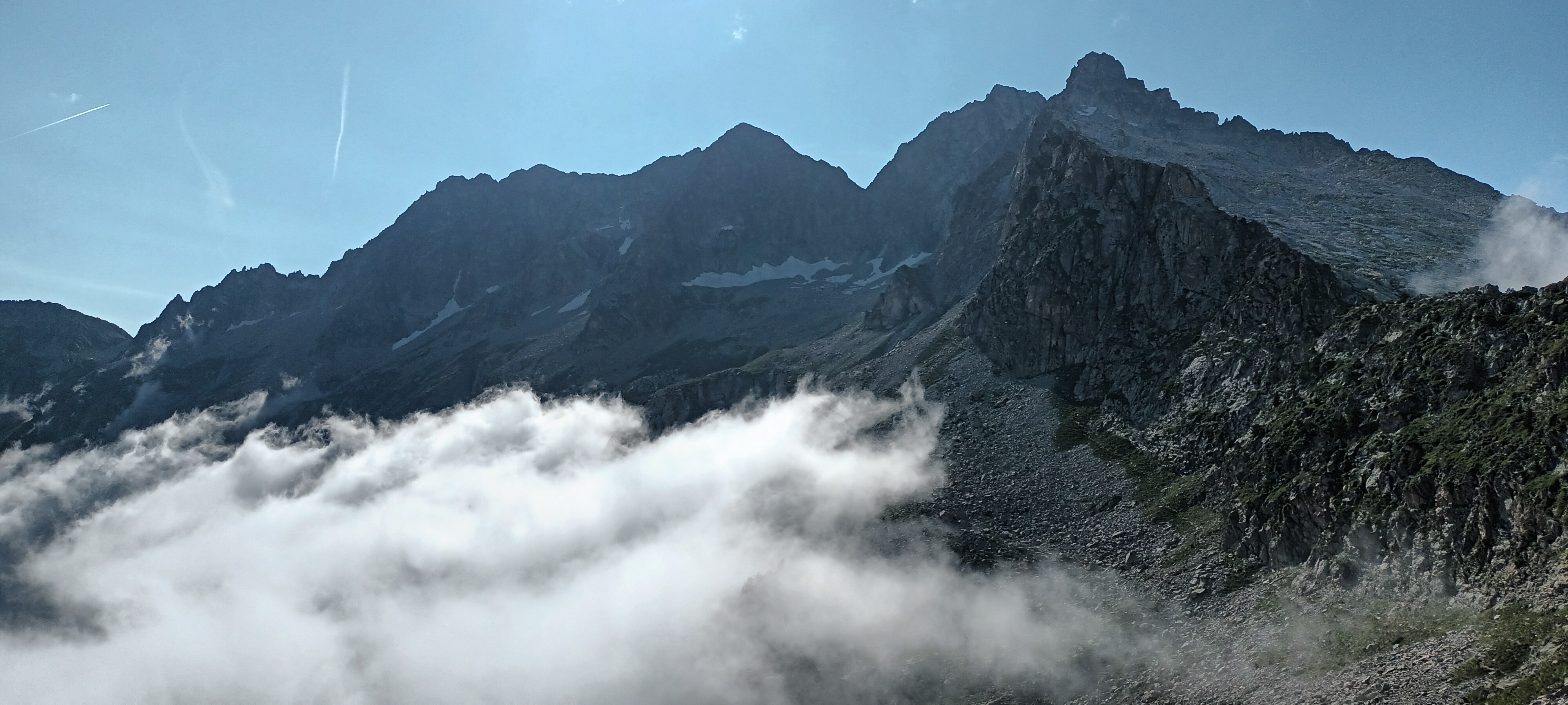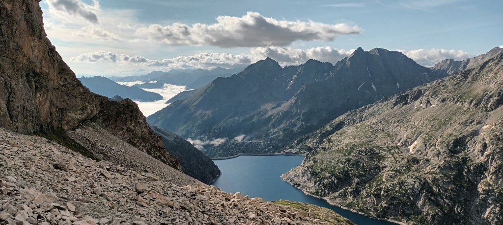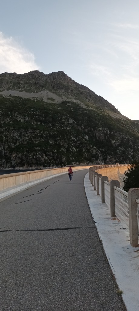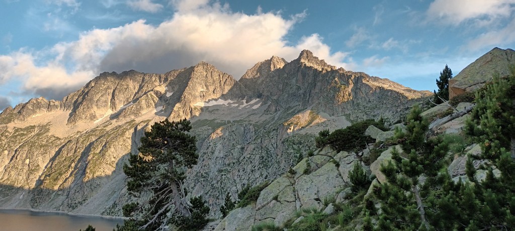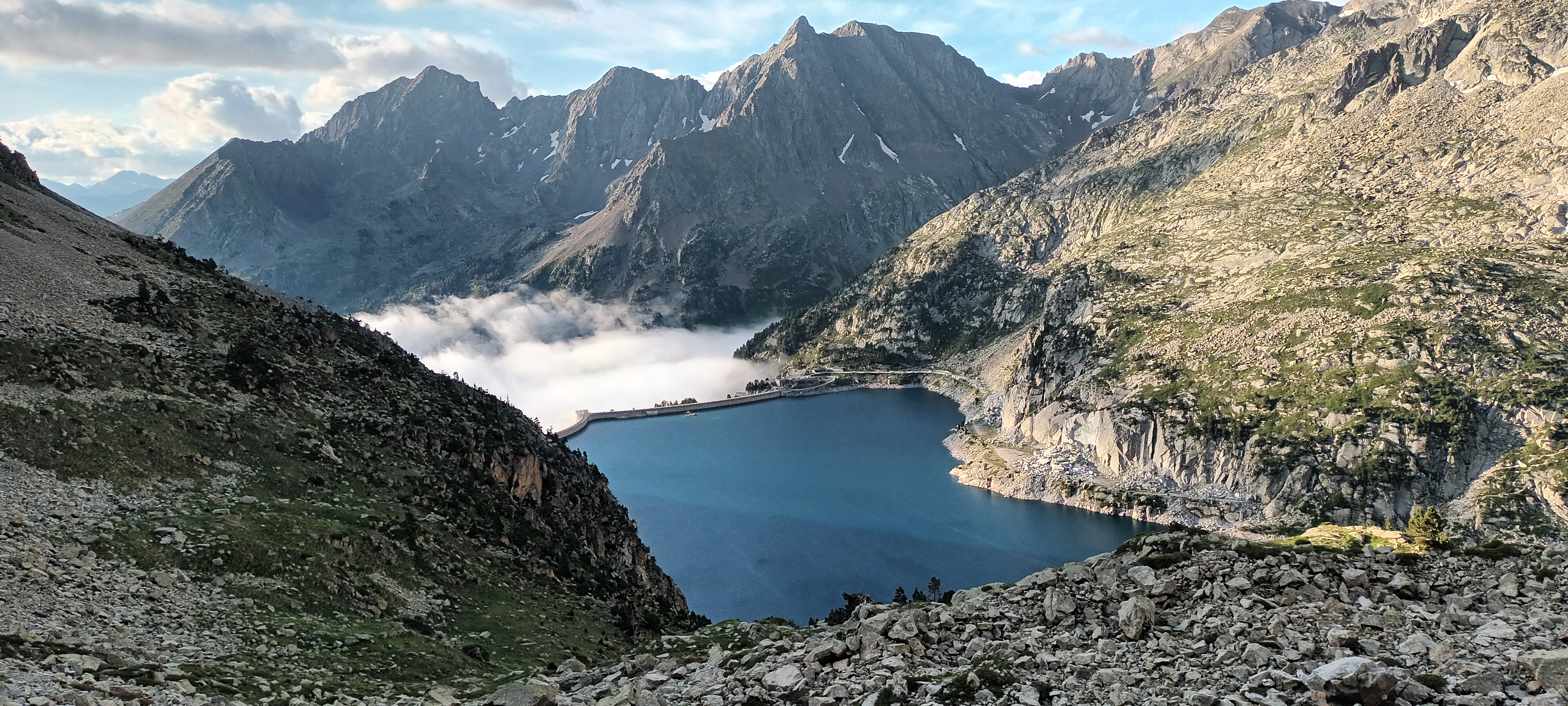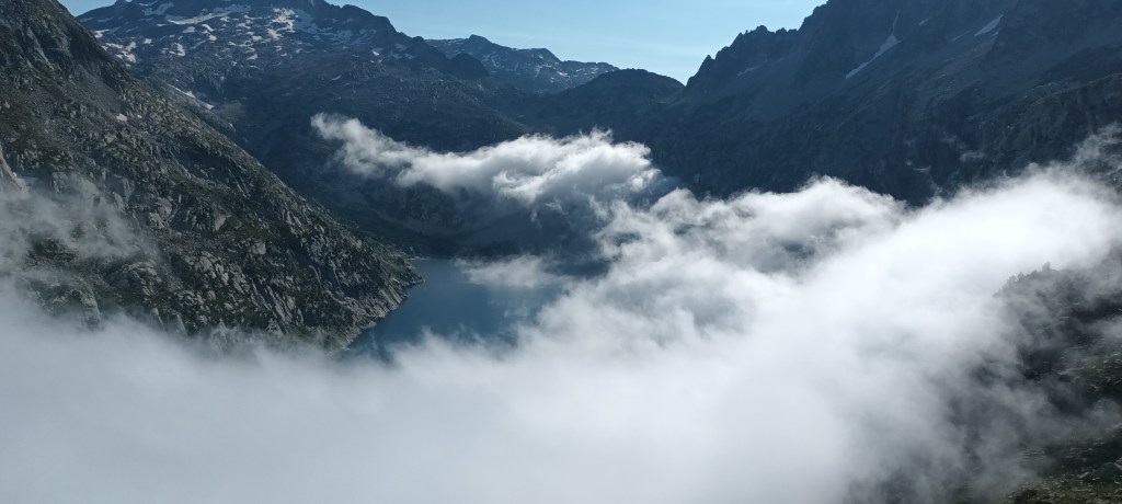 Aproximación: Atravesamos la presa de Cap de Long y seguimos el sendero que va ascendiendo hacia el paso del gato. Dejamos este paso a nuestra derecha y continuamos por el sendero, con la muralla sur del Ramougn a nuestra derecha, hasta el pie de vía. Cuando hicimos la vía, el pie de vía se encontraba justo entre dos neveros. Para identificarla, nos podemos servir de la pequeña chimenea característica del primer largo. También nos pueden servir las dos manchas negras de agua, la vía se encuentra justo en medio de estas manchas.