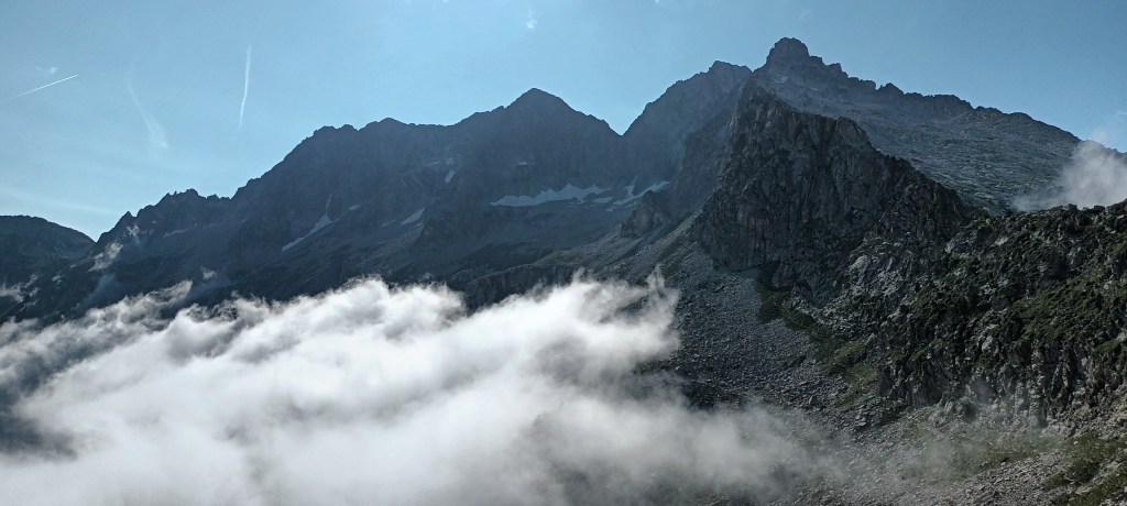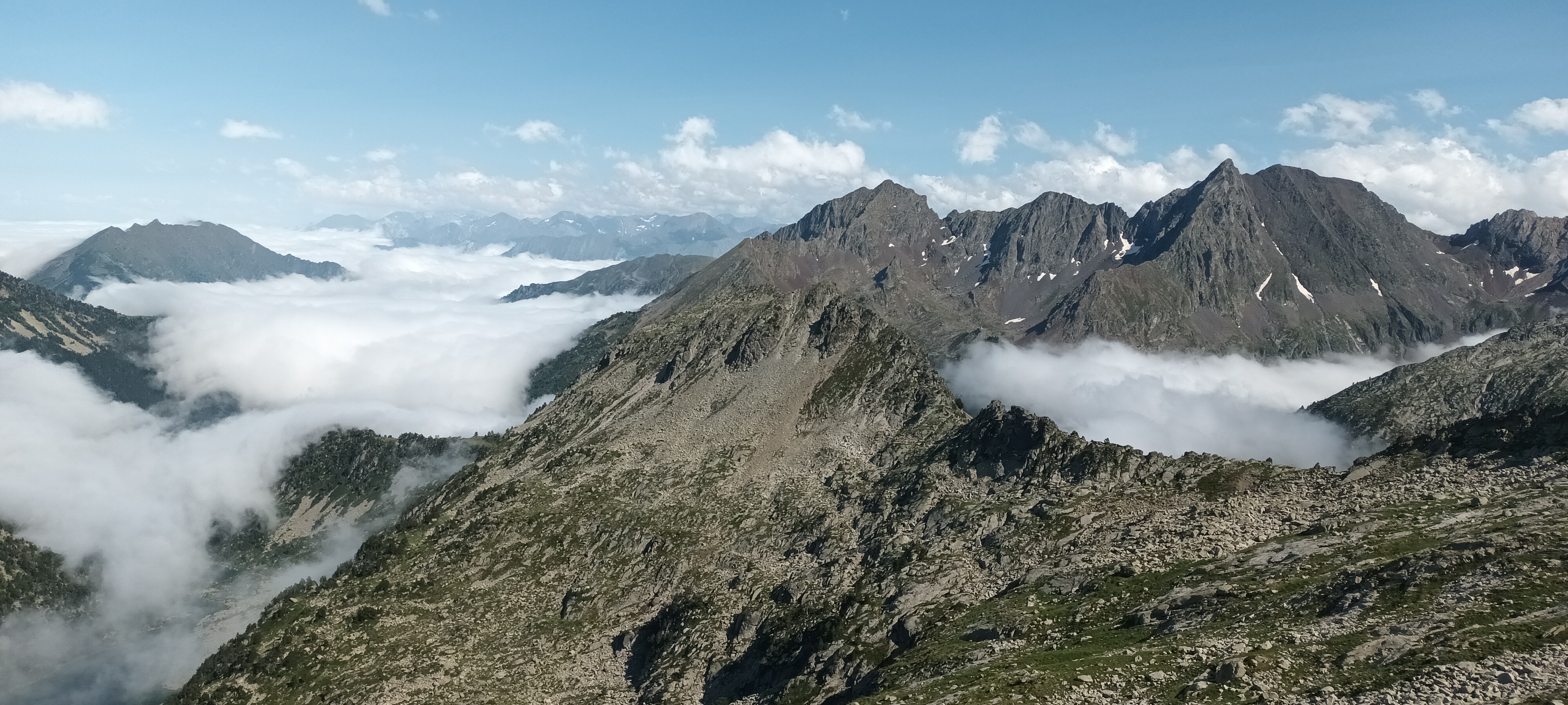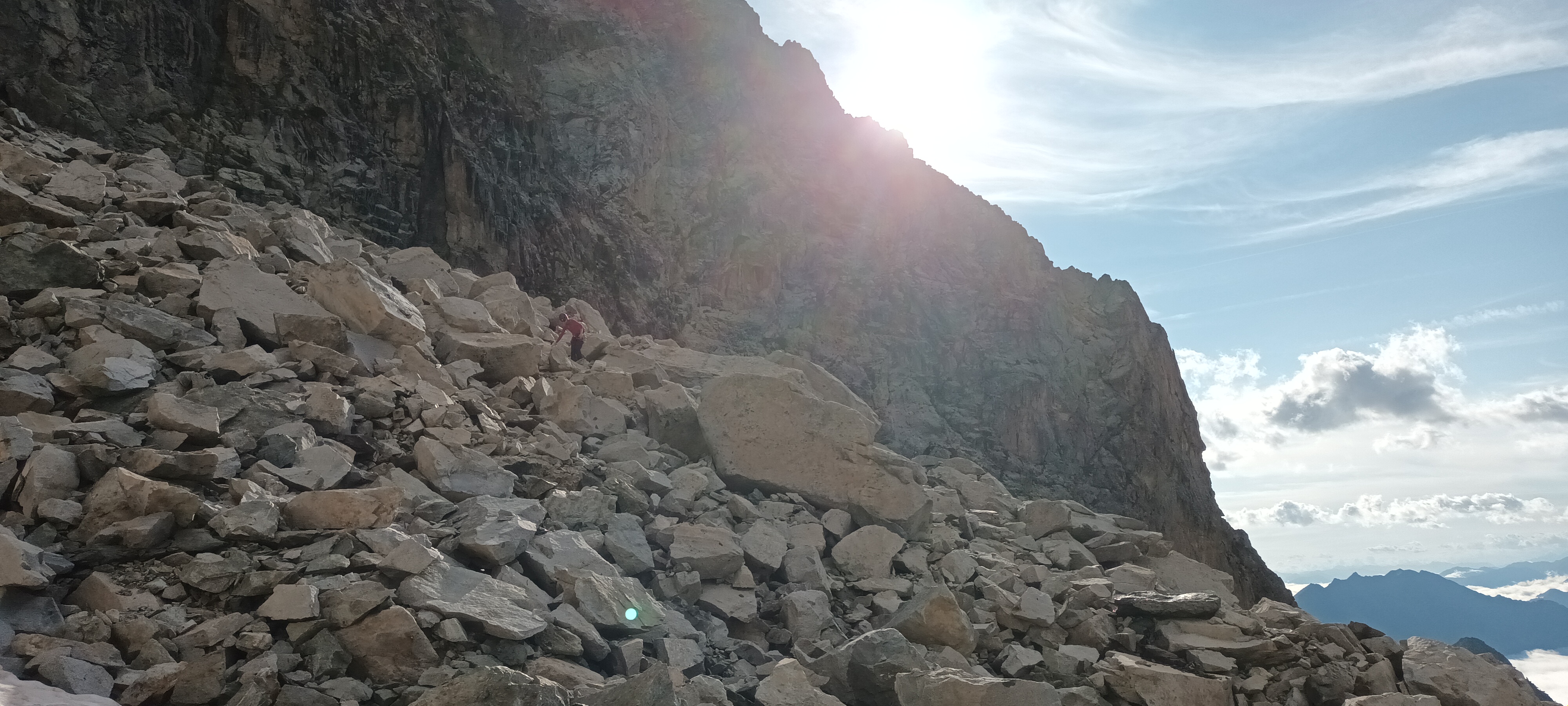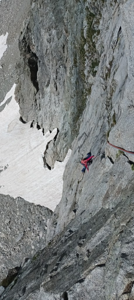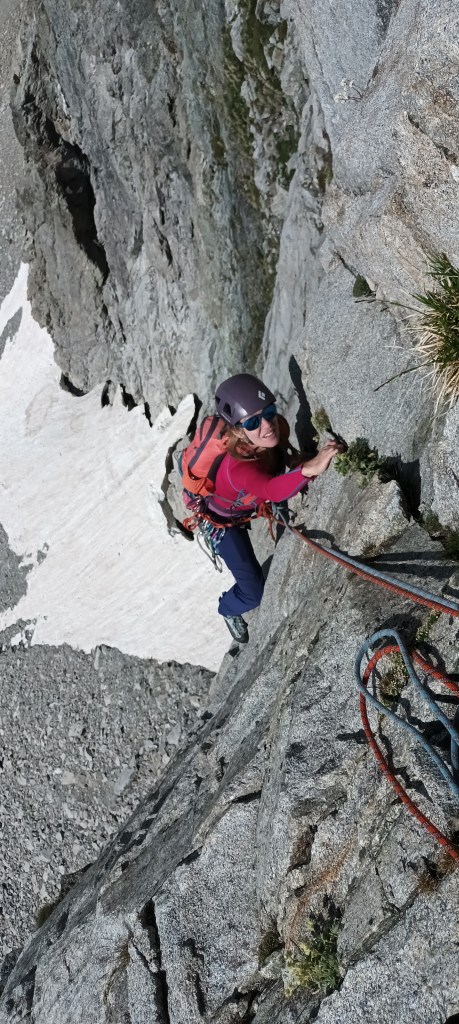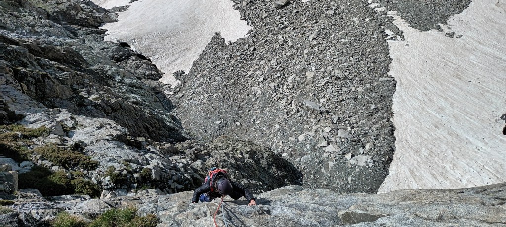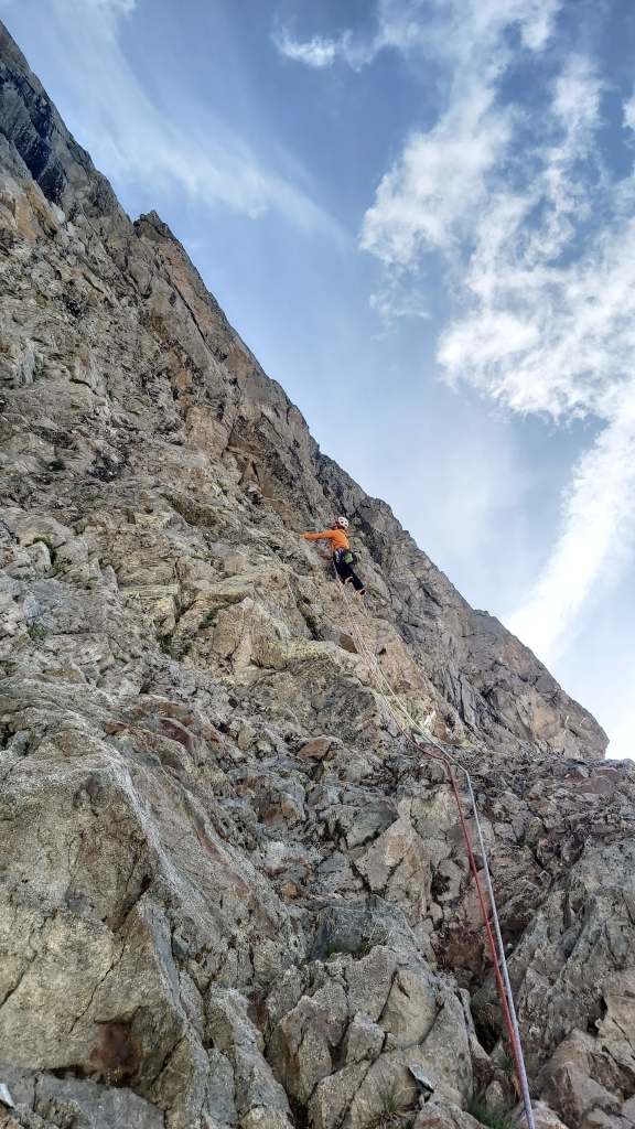 Todavía nos separarán de la cima 100 metros de III grado, mediante trepadas en las que nos podremos complicar lo que queramos. Hay que buscar la opción más fácil, roca muy rota con peligro, no confiarse.