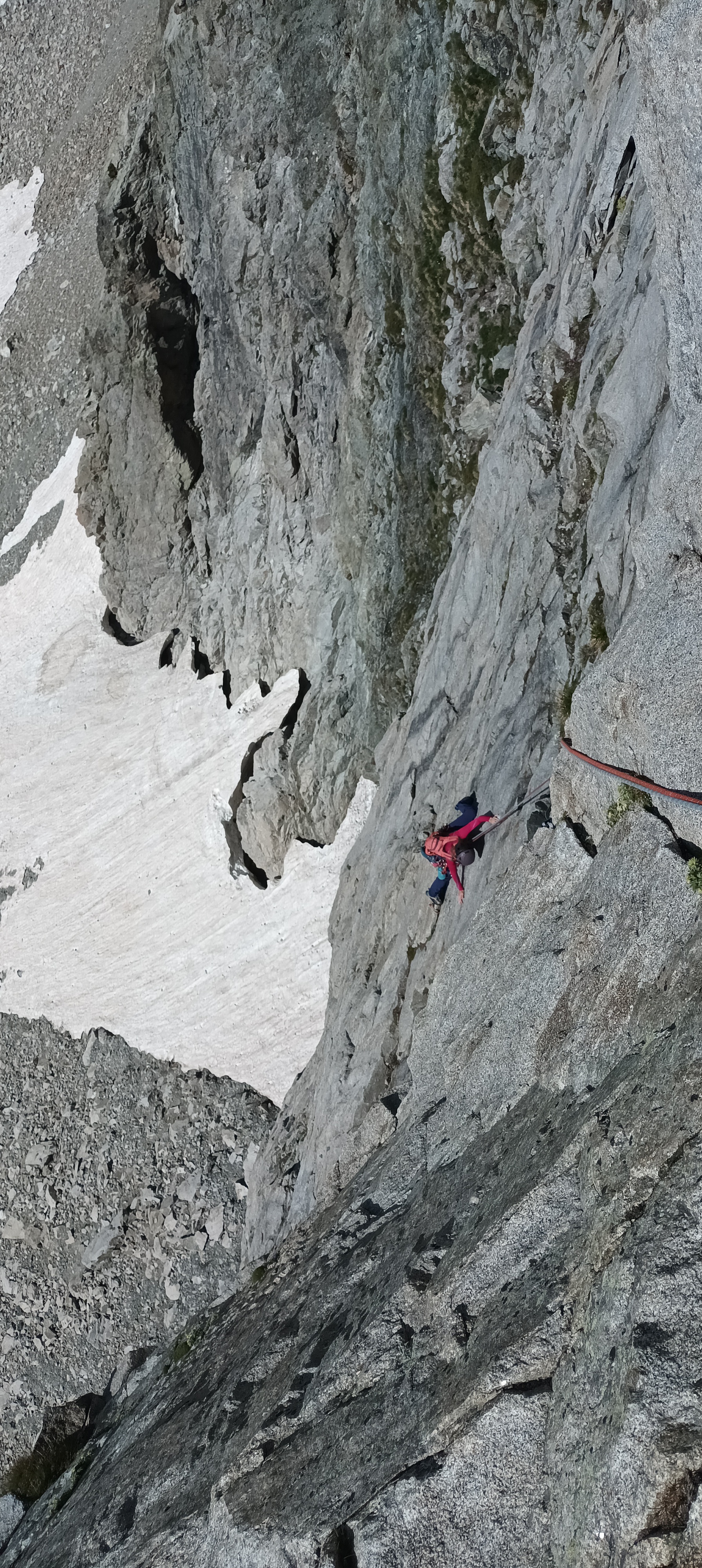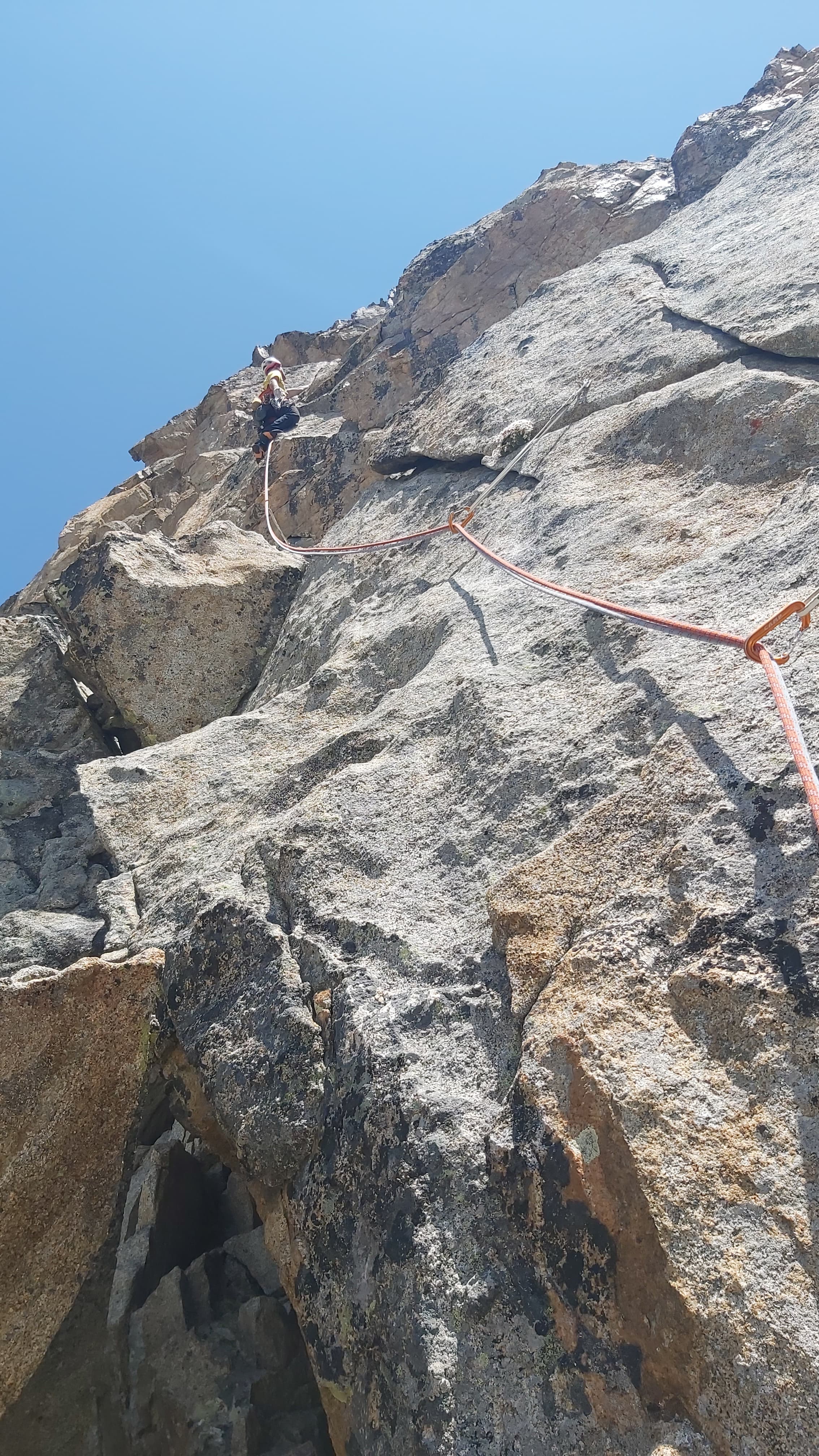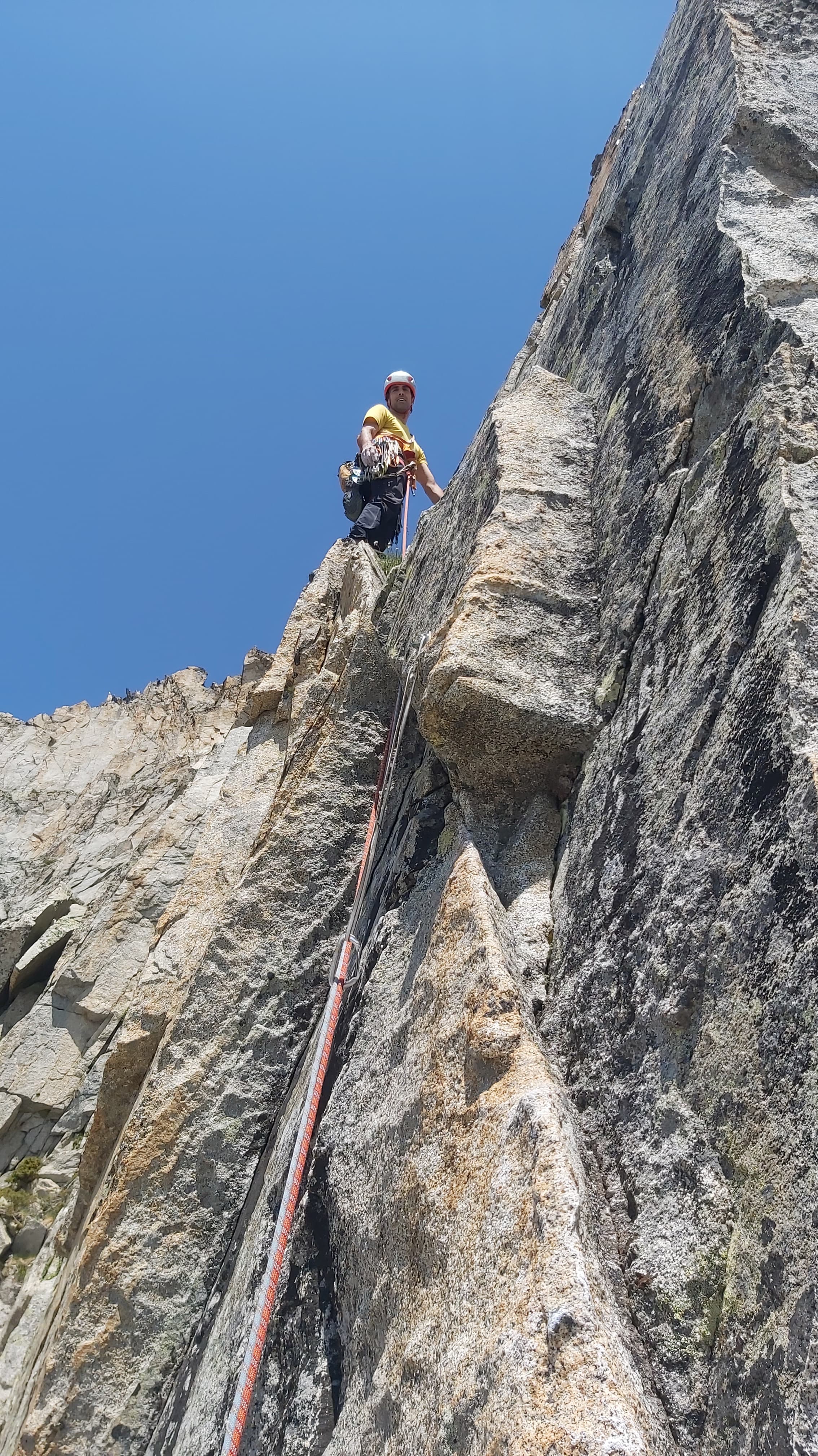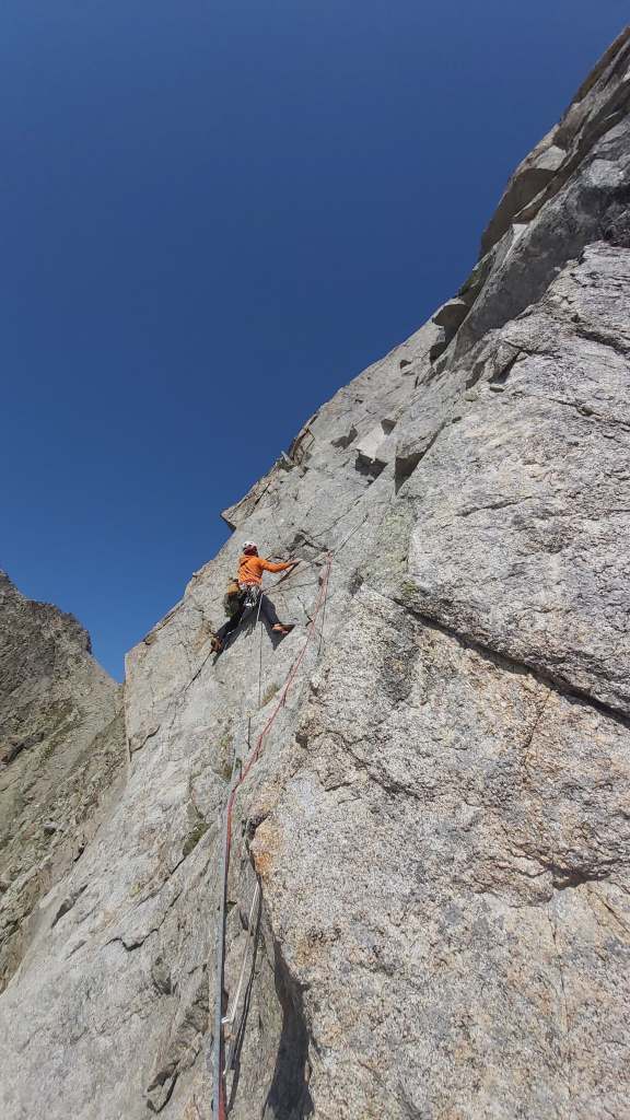 Largo 7, 6a (40 metros): Un par de pasos apretados al salir de la reunión para montarse en el gendarme. Después desde una gran repisa afrontamos la fisura ancha que se aprecia en el siguiente muro (a proteger toda la fisura). Cuando acaba la fisura continuar hacia arriba por bloques rotos unos 10 metros, hasta encontrar la siguiente reunión.