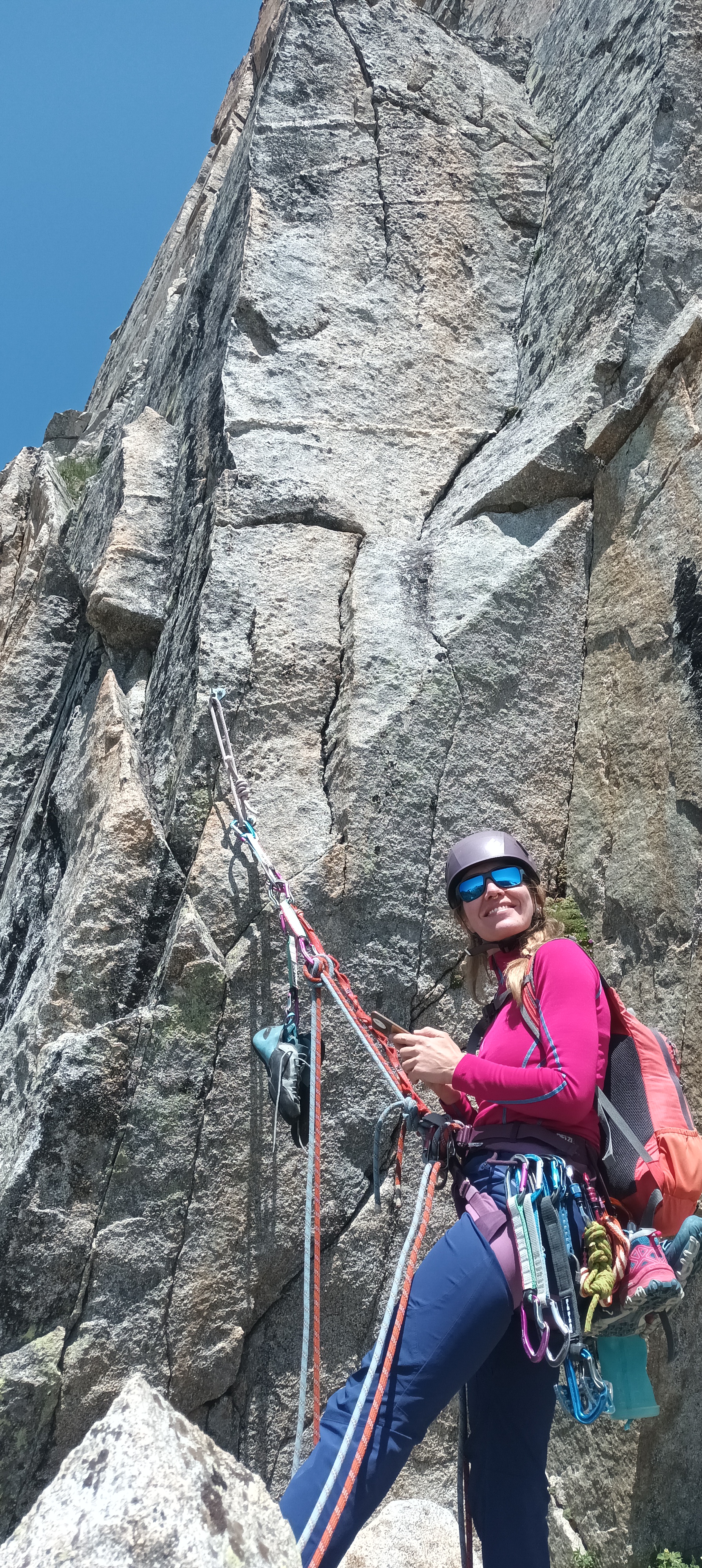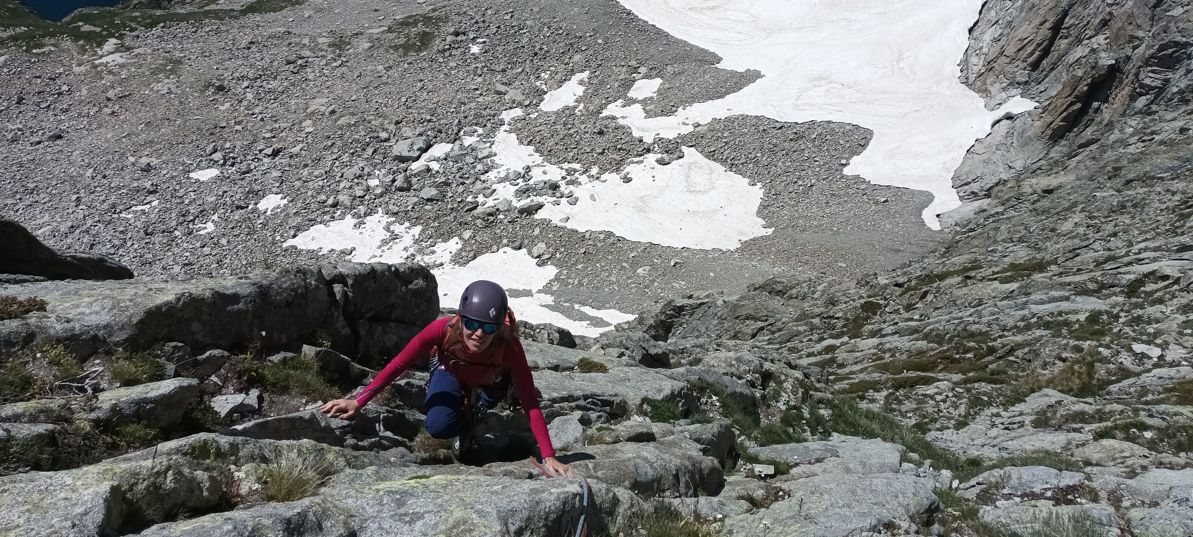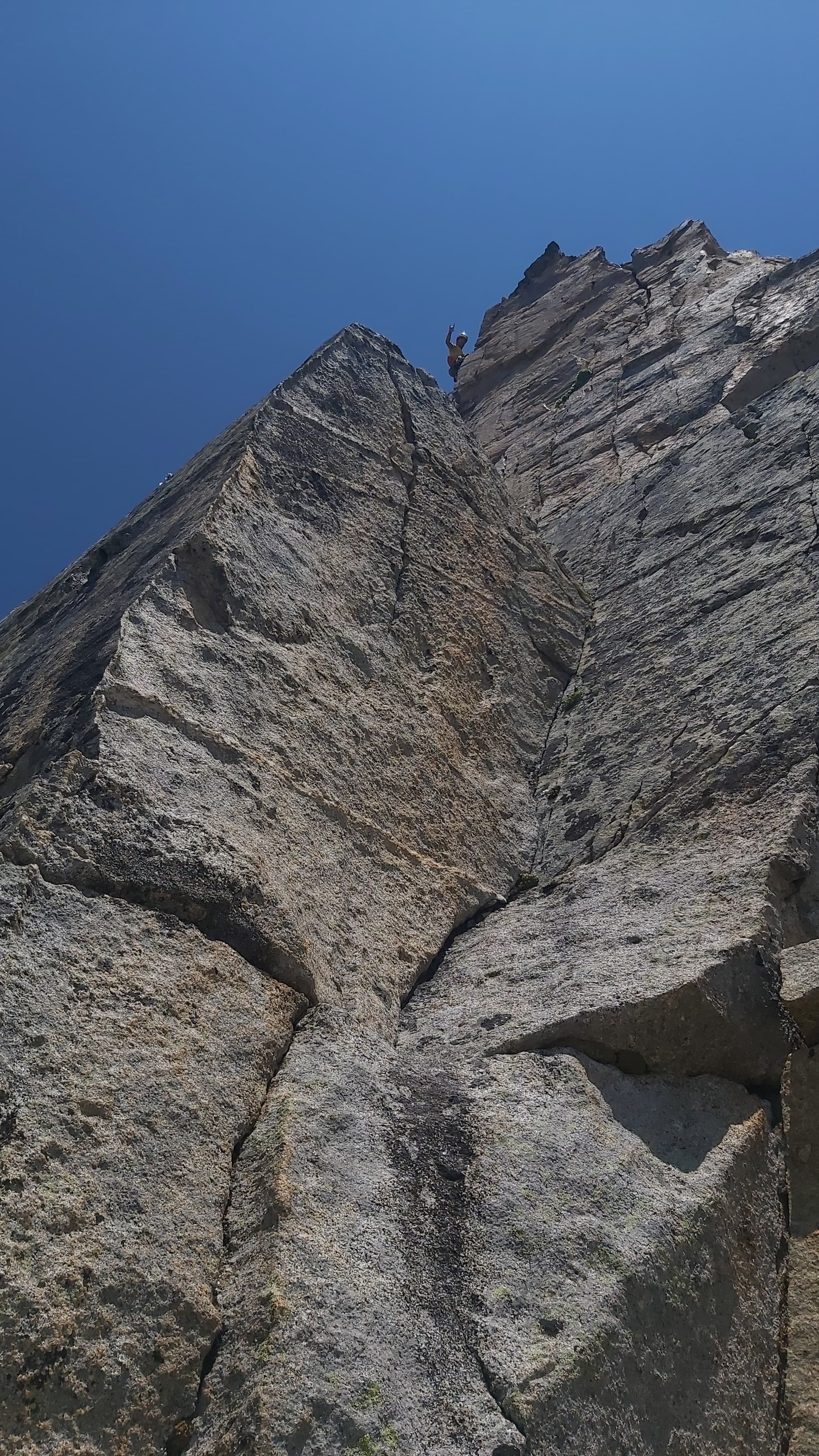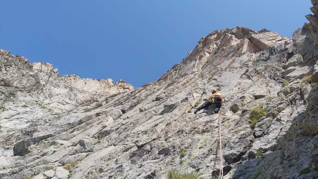 Largo 7, 6a (40 metros): Un par de pasos apretados al salir de la reunión para montarse en el gendarme. Después desde una gran repisa afrontamos la fisura ancha que se aprecia en el siguiente muro (a proteger toda la fisura). Cuando acaba la fisura continuar hacia arriba por bloques rotos unos 10 metros, hasta encontrar la siguiente reunión.