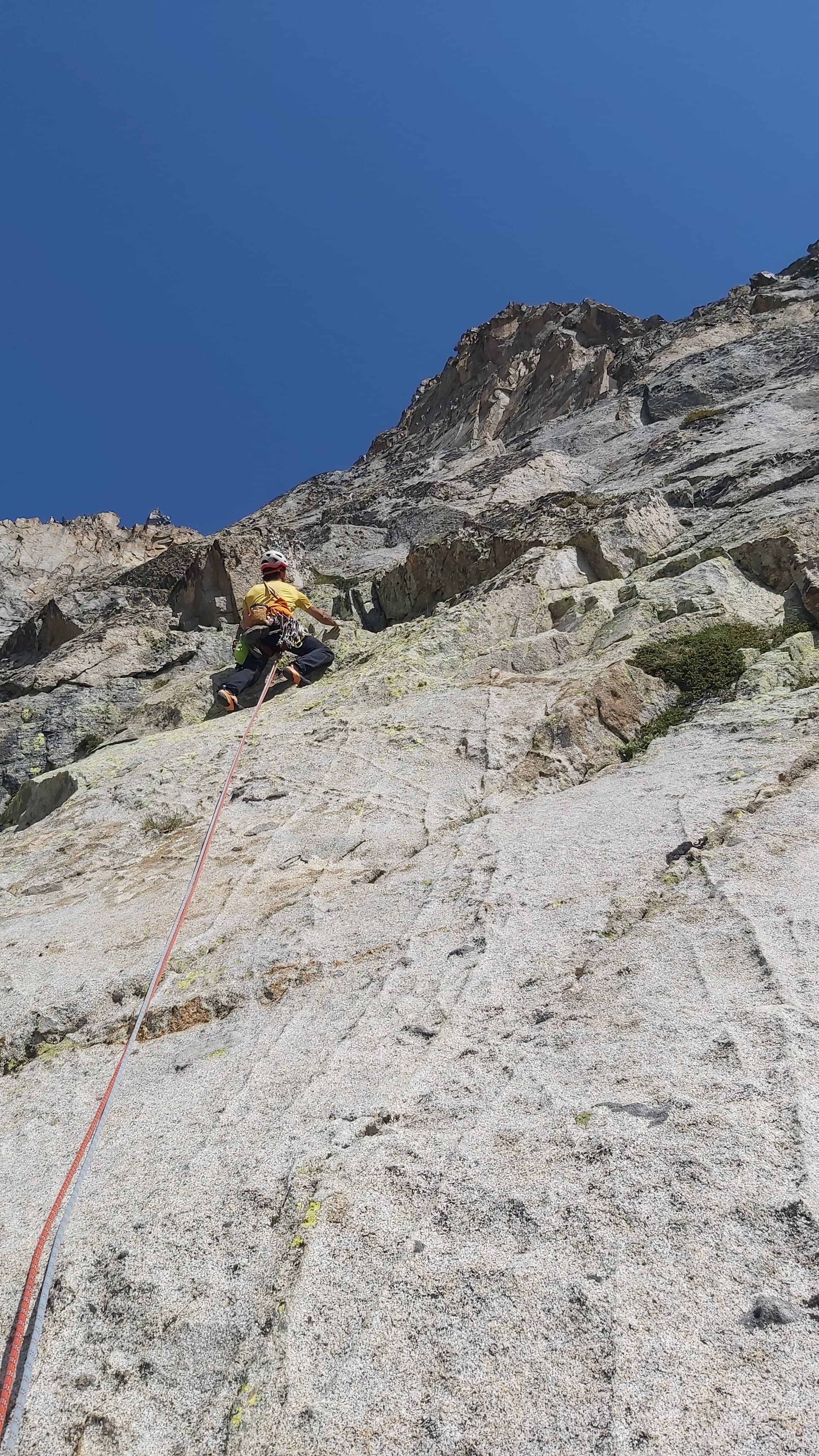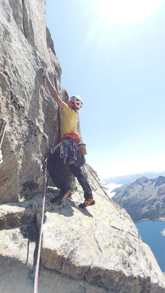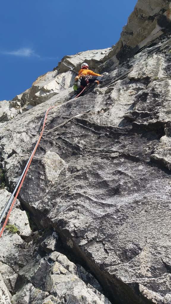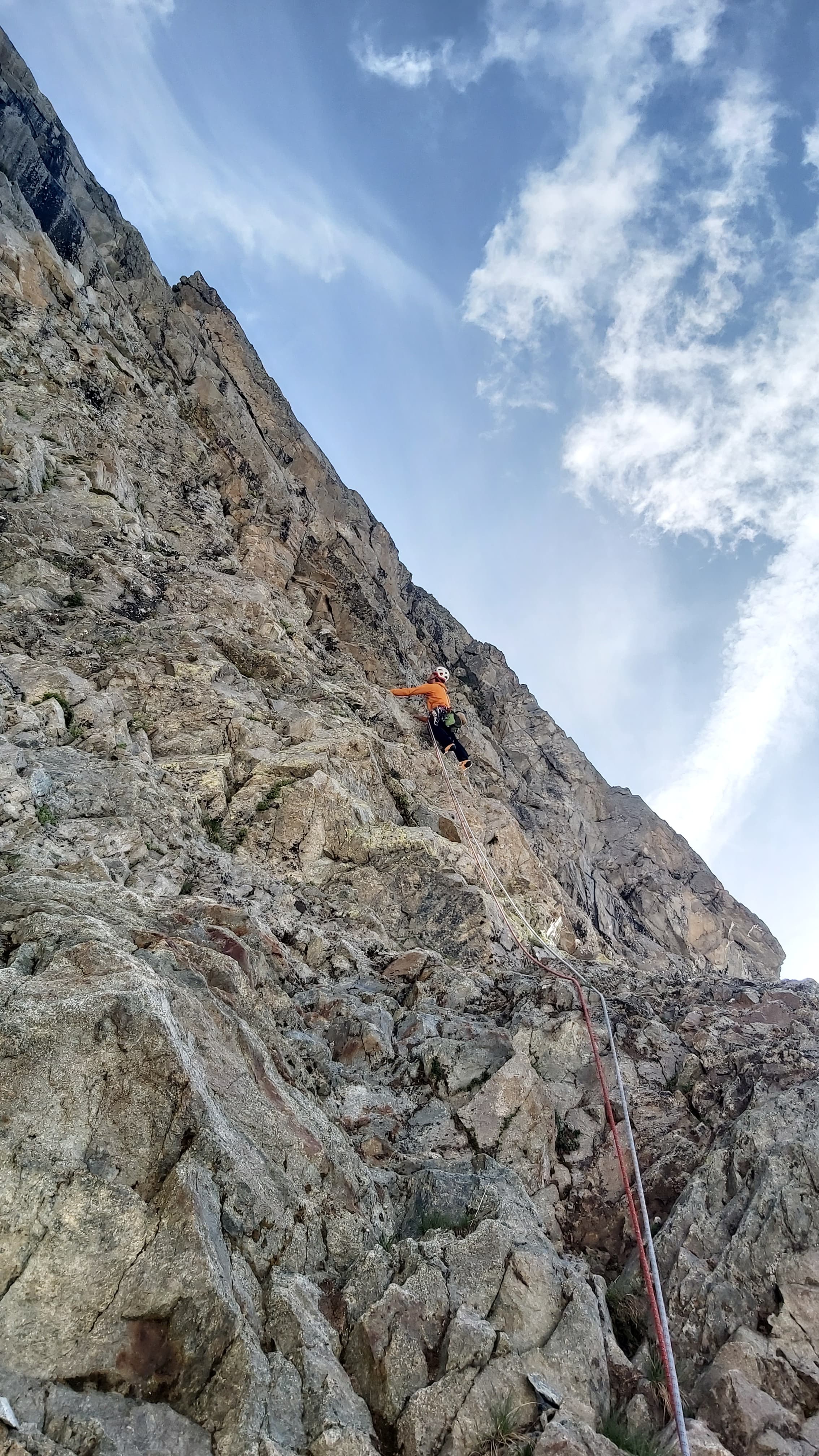 Largo 1, V (50 metros): Escalamos por terreno indefinido sin posiblidad de protección, hasta el bolt que se encuentra antes de la chimenea. En la chimenea encontraremos un cordino y un bolt después. De ahí hasta la reunión un clavo y un puente de roca. Reunión cómoda.