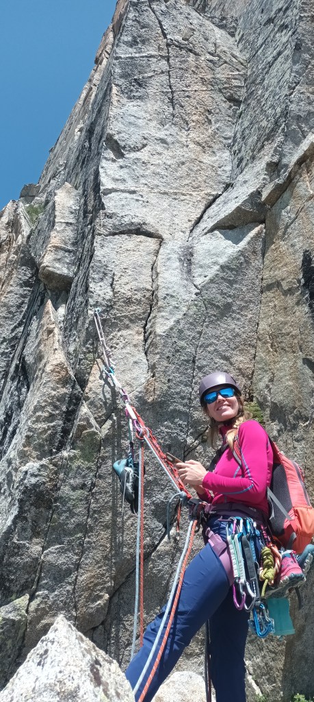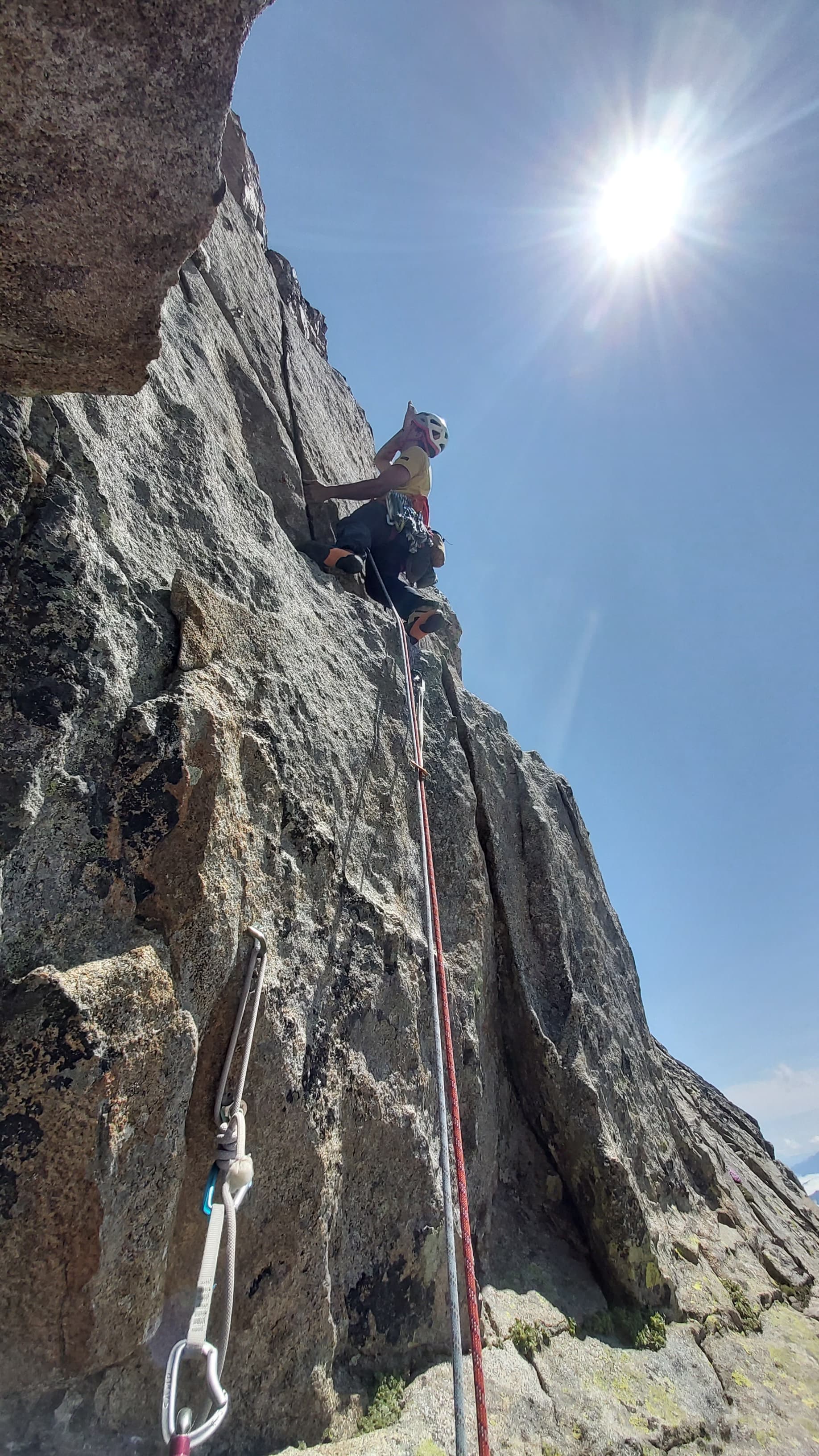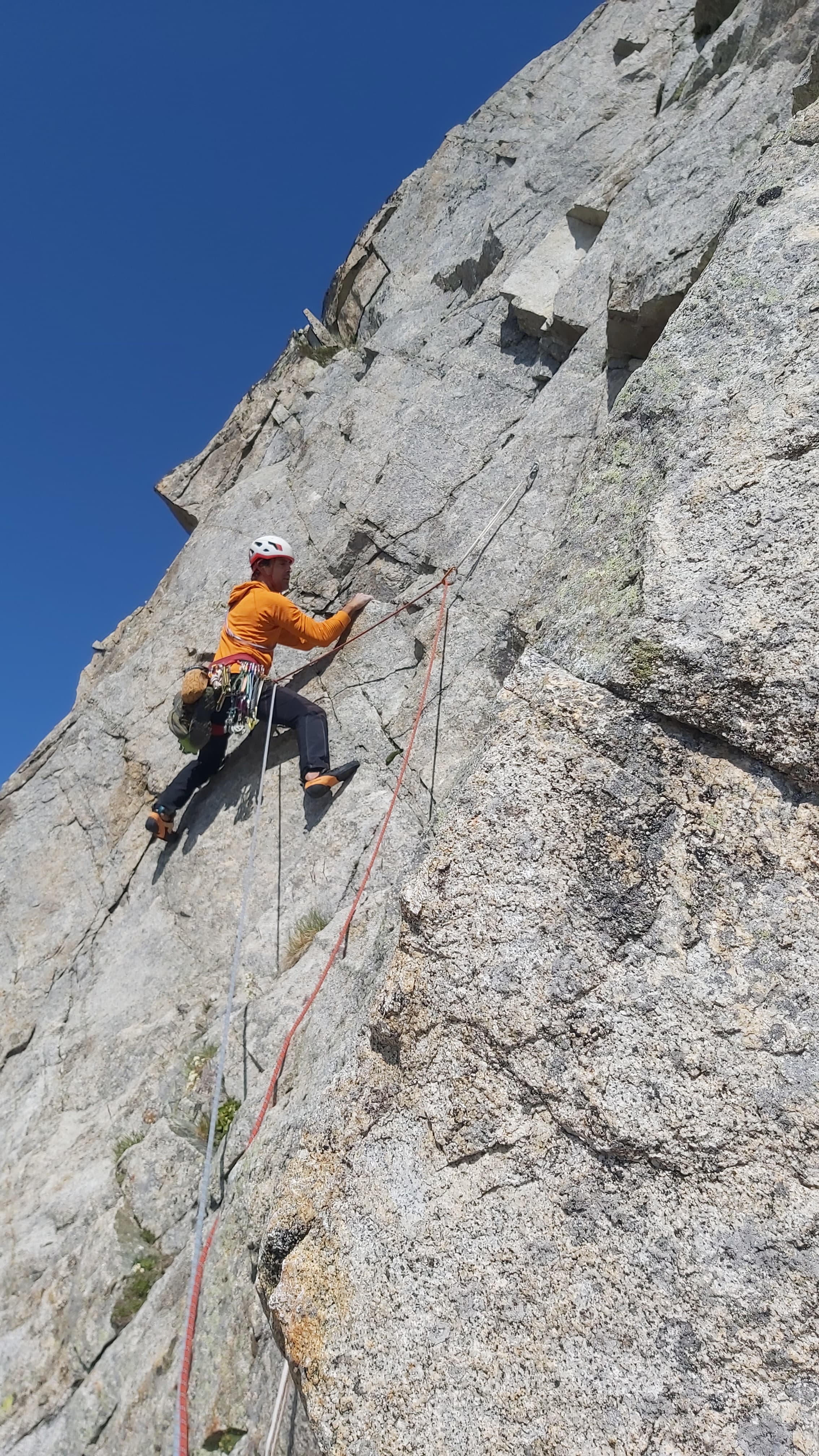 Largo 1, V (50 metros): Escalamos por terreno indefinido sin posiblidad de protección, hasta el bolt que se encuentra antes de la chimenea. En la chimenea encontraremos un cordino y un bolt después. De ahí hasta la reunión un clavo y un puente de roca. Reunión cómoda.