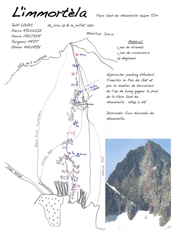 1ª Ascensión: Jeff Lorec, Pierre Roussie, Pierre Foltier, Jaques Prat y Olivier Mauroi el 28 de Junio, y el 10 & 13 Julio 2012.