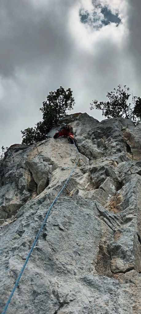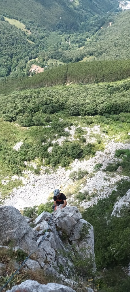 Largo 2, 6a (40 metros): Subimos hasta una placa protegida por un bolt. Superamos la placa y escalamos hasta un cordino en un puente de roca. Una vez superado el cordino hay que escalar por el filo del espolón sin proteger hasta la reunión. Mucho cuidado en este tramo porque la roca es muy dudosa y no se puede proteger. No es difícil pero la roca «da morbo».