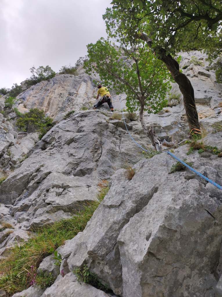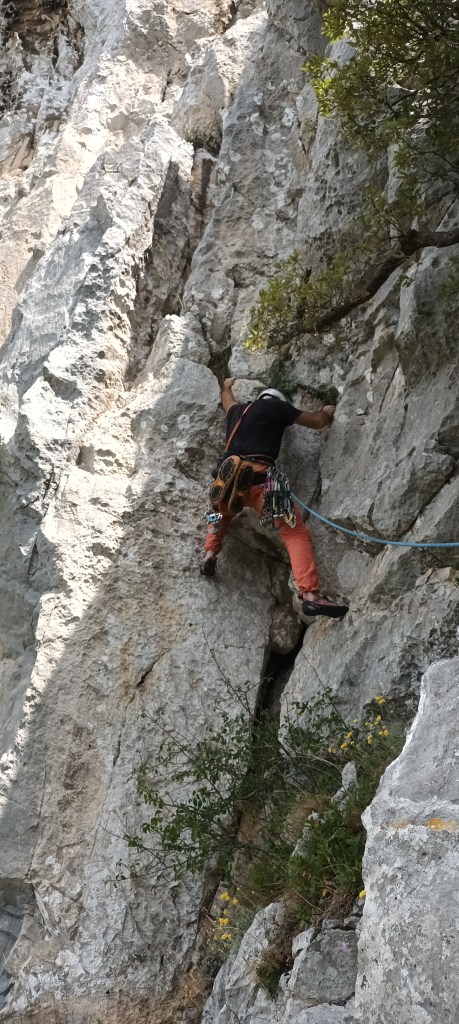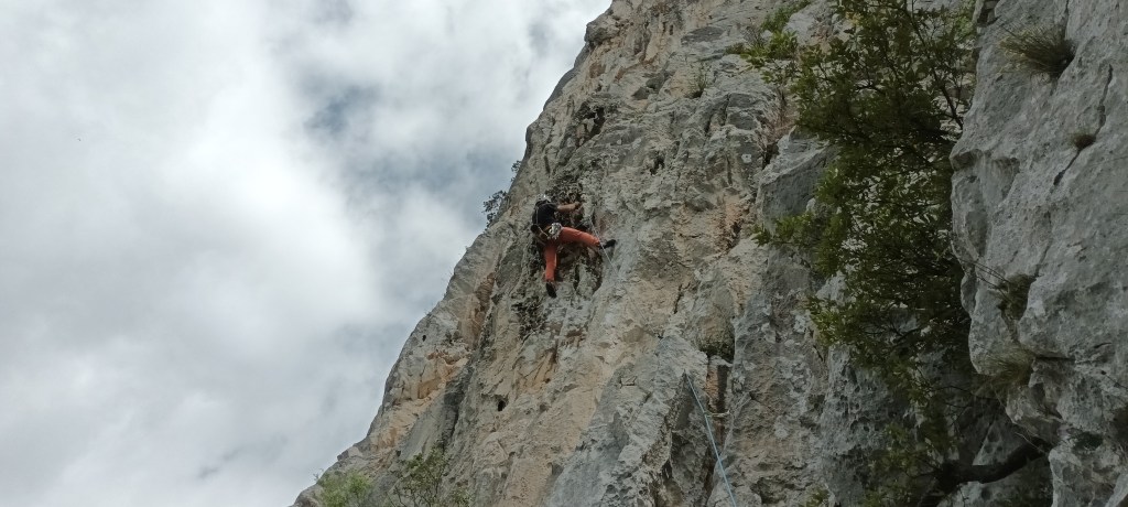 Largo 1, 6a+ (40 metros): Se trata del largo más difícil de la vía. Hay que leerlo bien ya que puede tener un poco de exposición a pesar de tener 2 clavos y 2 parabolts. Comenzamos por una trepada hasta un puente de roca con cordino. De ahí hasta el primer clavo que cuesta ver (justo debajo de un arbusto). Desde el clavo hacia la izquierda para montarnos en una pequeña repisa (otro clavo).