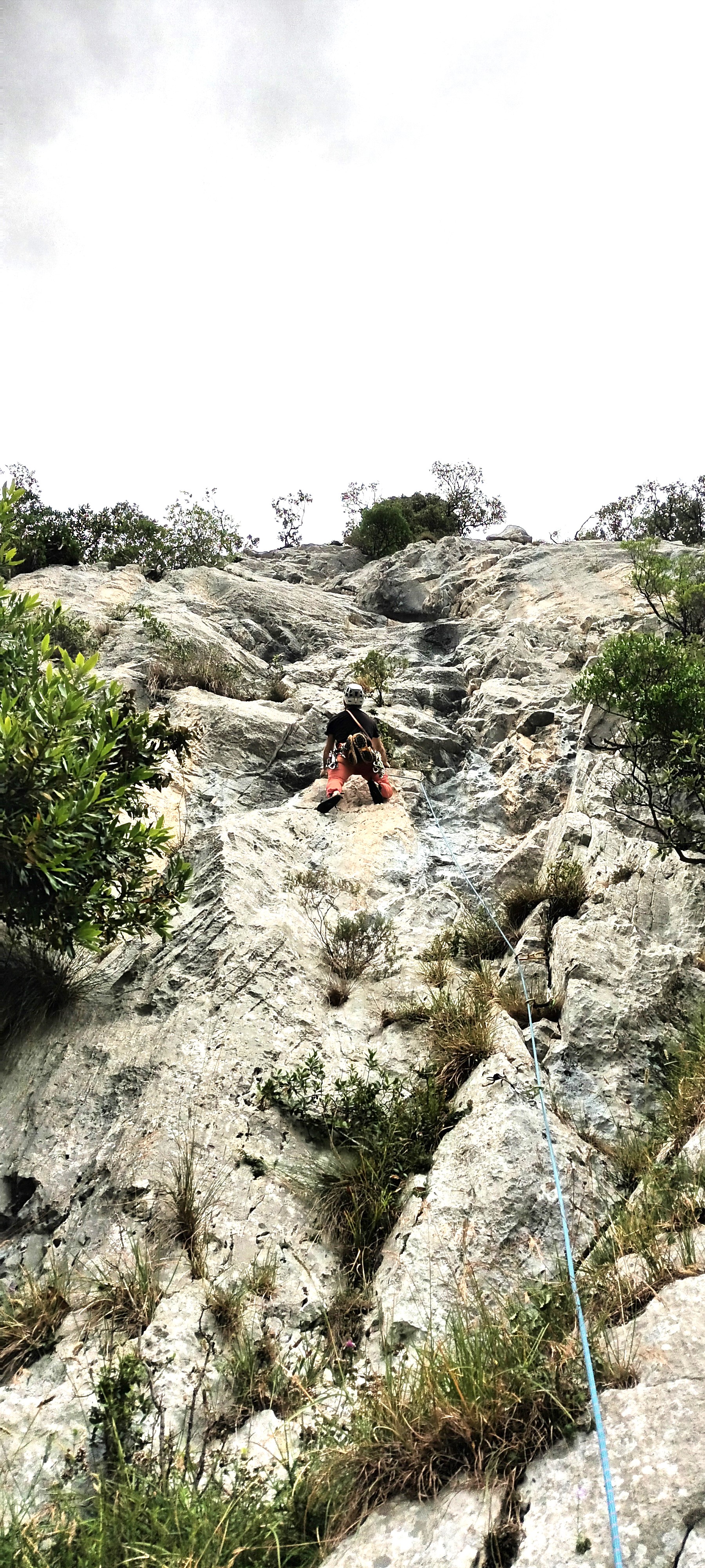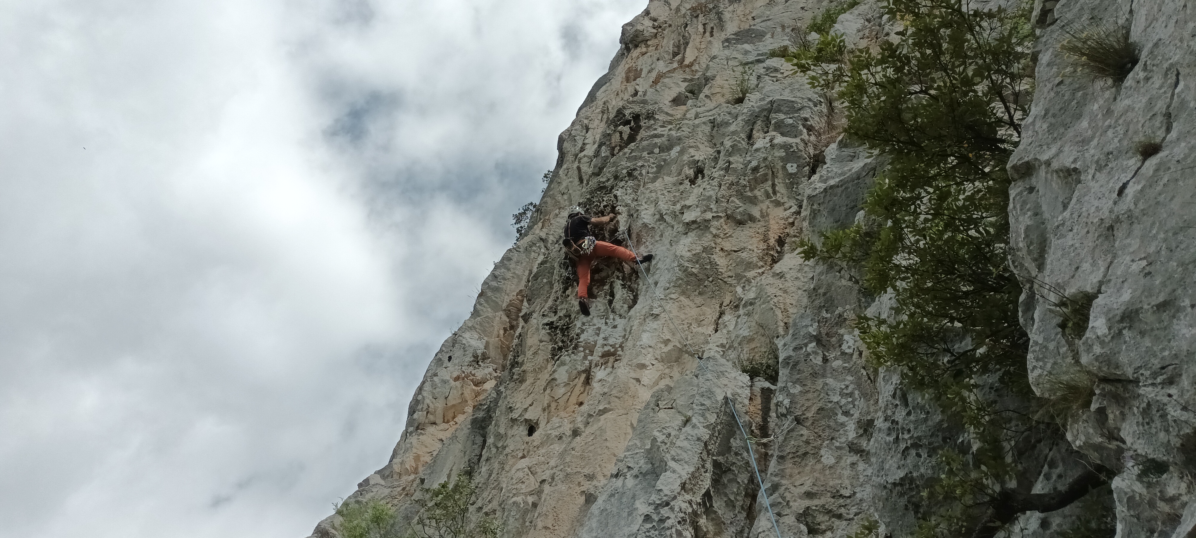 Largo 1, 6a+ (40 metros): Se trata del largo más difícil de la vía. Hay que leerlo bien ya que puede tener un poco de exposición a pesar de tener 2 clavos y 2 parabolts. Comenzamos por una trepada hasta un puente de roca con cordino. De ahí hasta el primer clavo que cuesta ver (justo debajo de un arbusto). Desde el clavo hacia la izquierda para montarnos en una pequeña repisa (otro clavo).