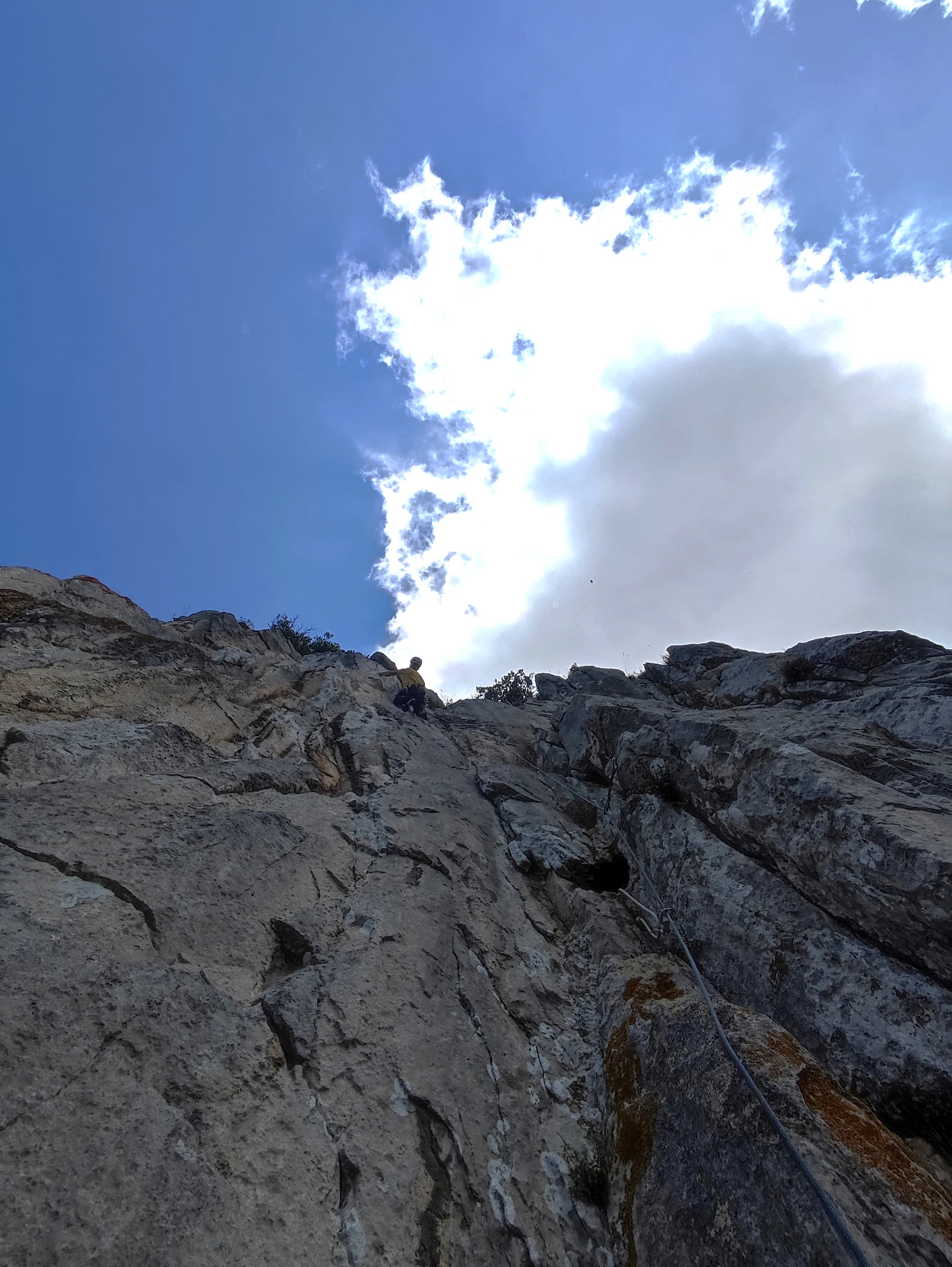 Largo 2, 6a (40 metros): Subimos hasta una placa protegida por un bolt. Superamos la placa y escalamos hasta un cordino en un puente de roca. Una vez superado el cordino hay que escalar por el filo del espolón sin proteger hasta la reunión. Mucho cuidado en este tramo porque la roca es muy dudosa y no se puede proteger. No es difícil pero la roca «da morbo».