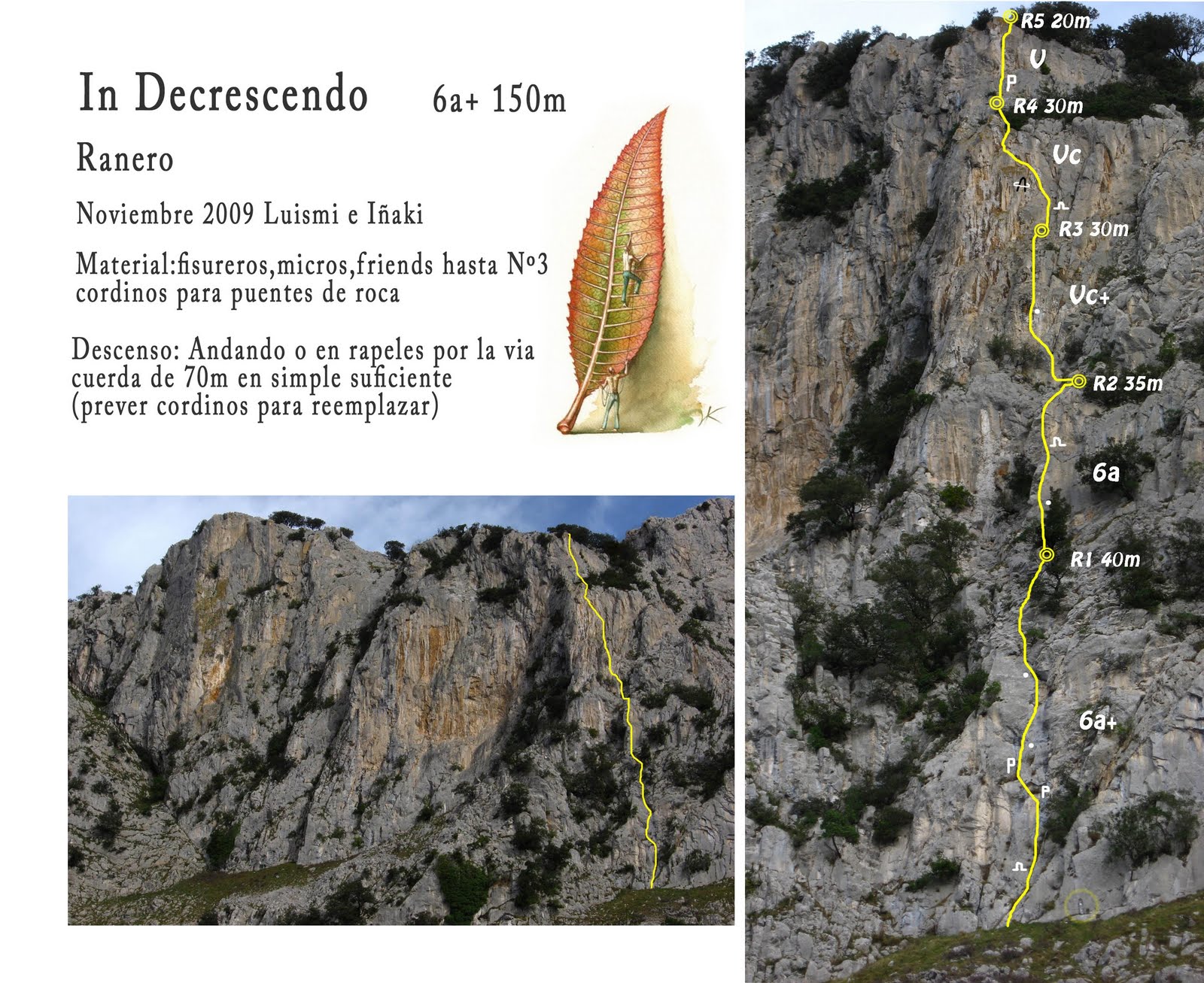 Escalar en Ranero es sinónimo de soledad y ambiente salvaje. Este valle no defrauda, siempre vuelves a casa habiendo vivido una pequeña aventura. In Decrescendo es una vía rápida y asequible, puede ser una buena toma de contacto con estas paredes.