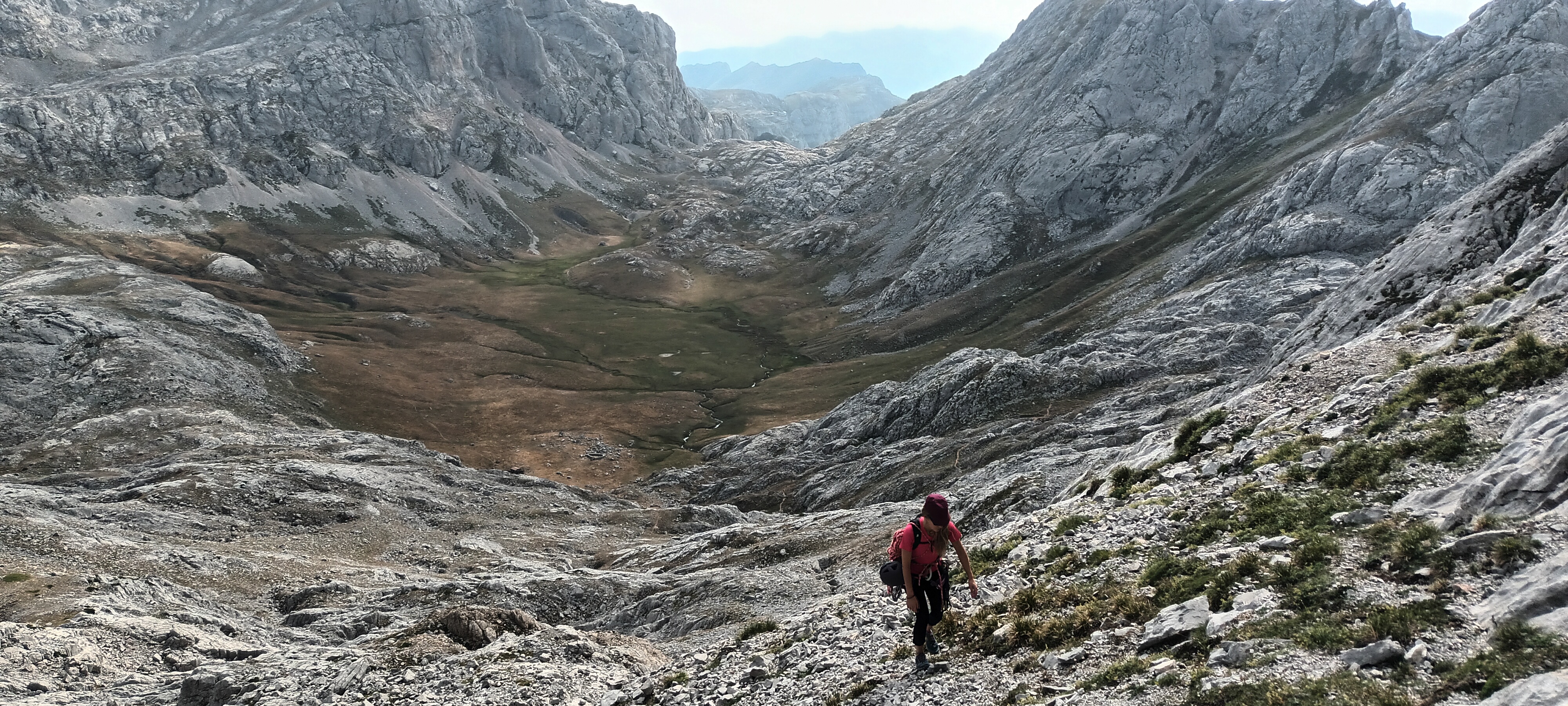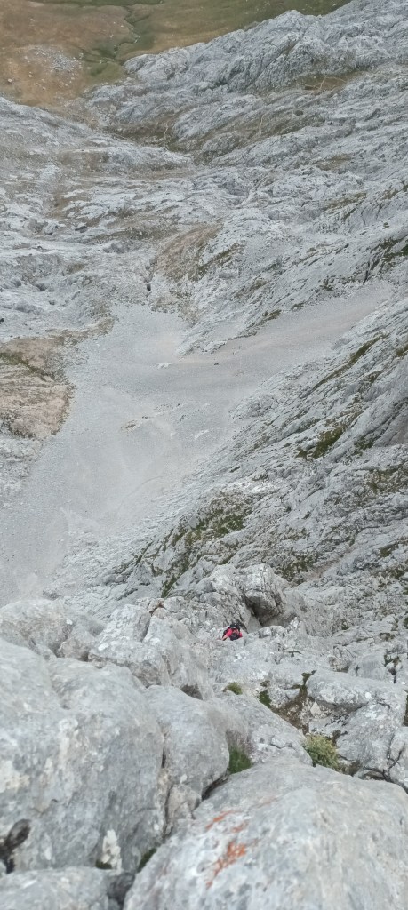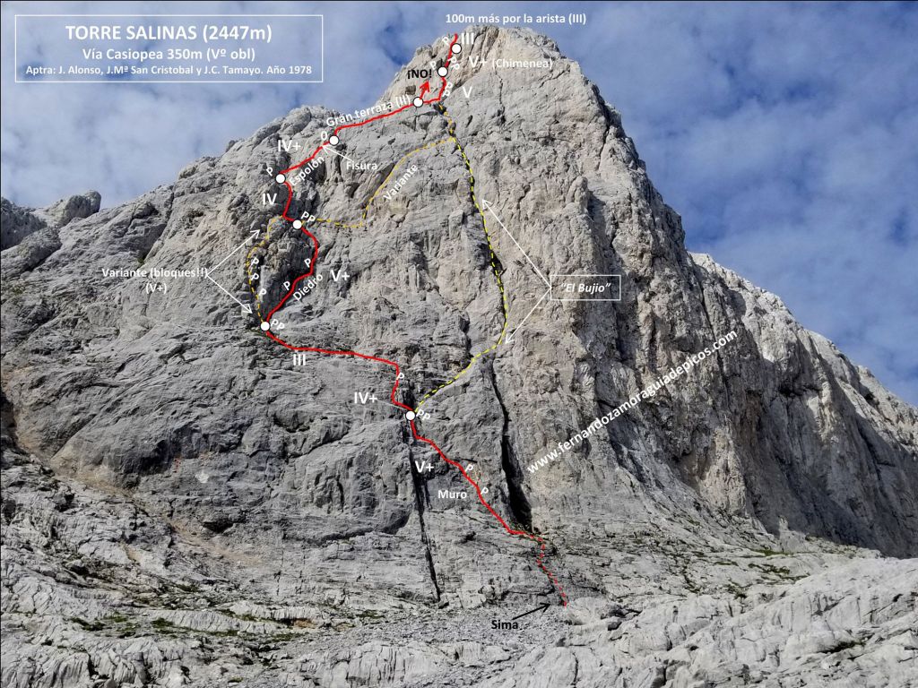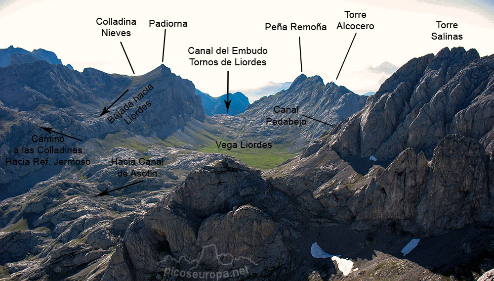 Una vez que lleguemos a la Vega de Liordes, lo primero que vemos a nuestra izquierda es el camino de bajada de Torre Salinas. Debemos seguir los hitos a nuestra izquierda, que por las faldas de Torre Salinas nos llevan al pie de vía, primero siguiendo hitos a través de un terreno cárstico y después subiendo una pedrera hasta una sima.