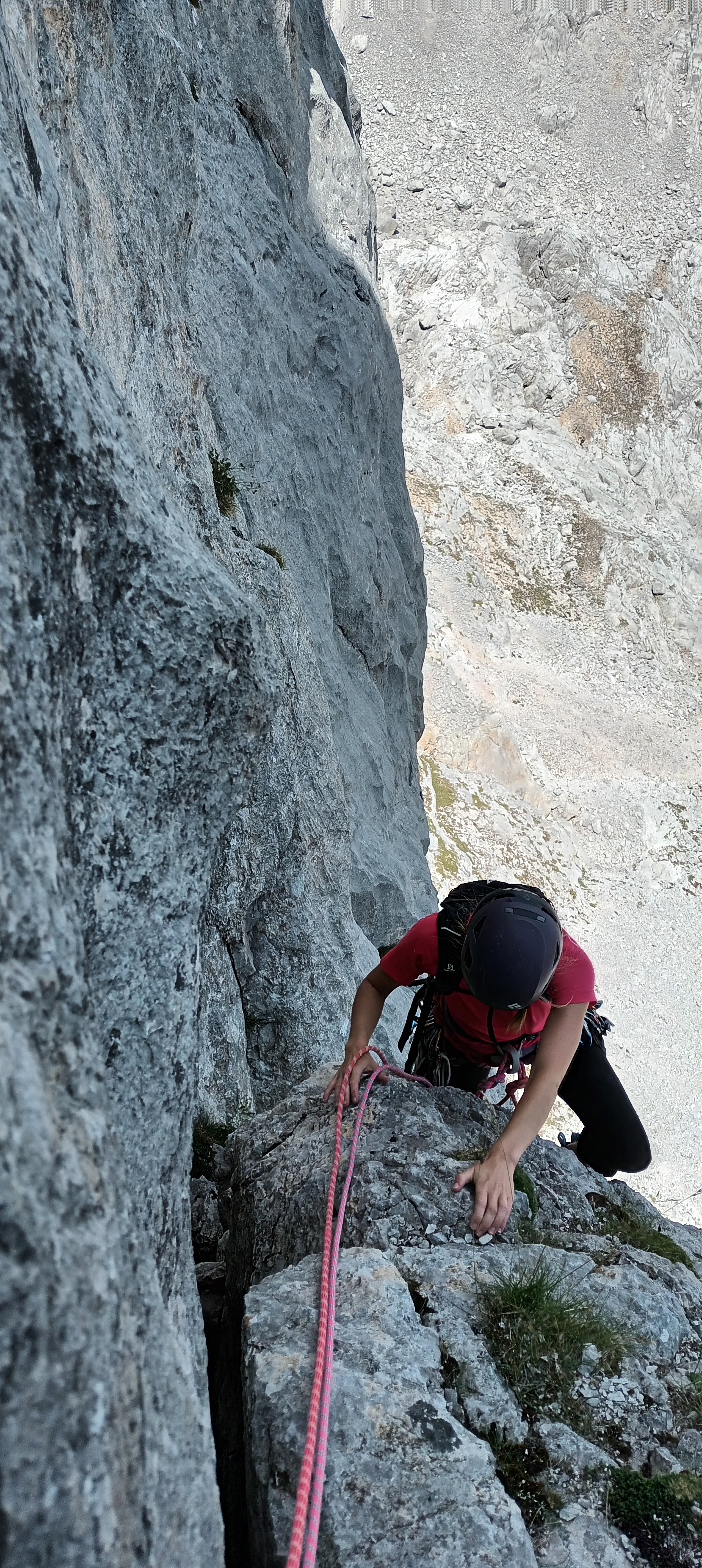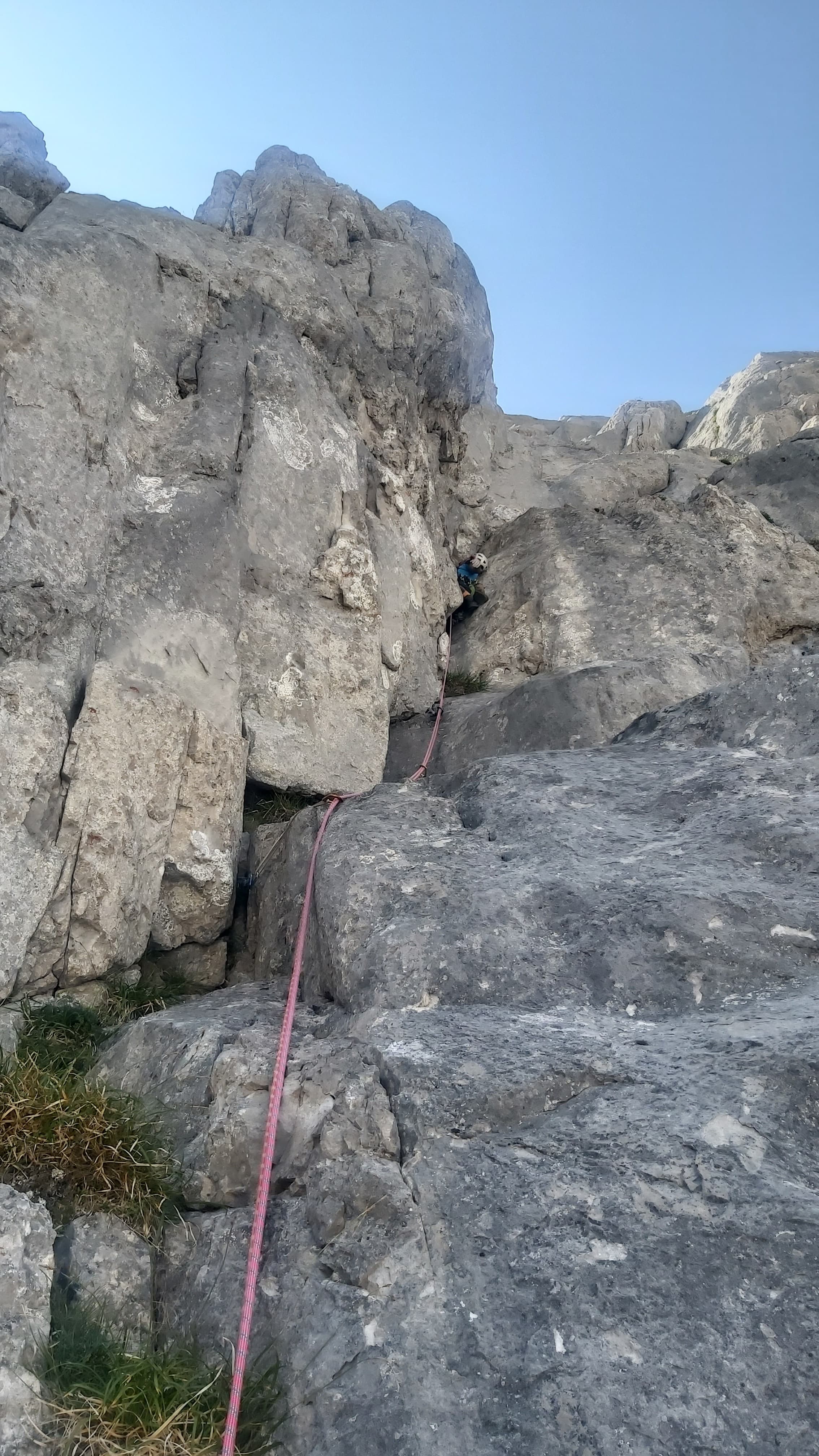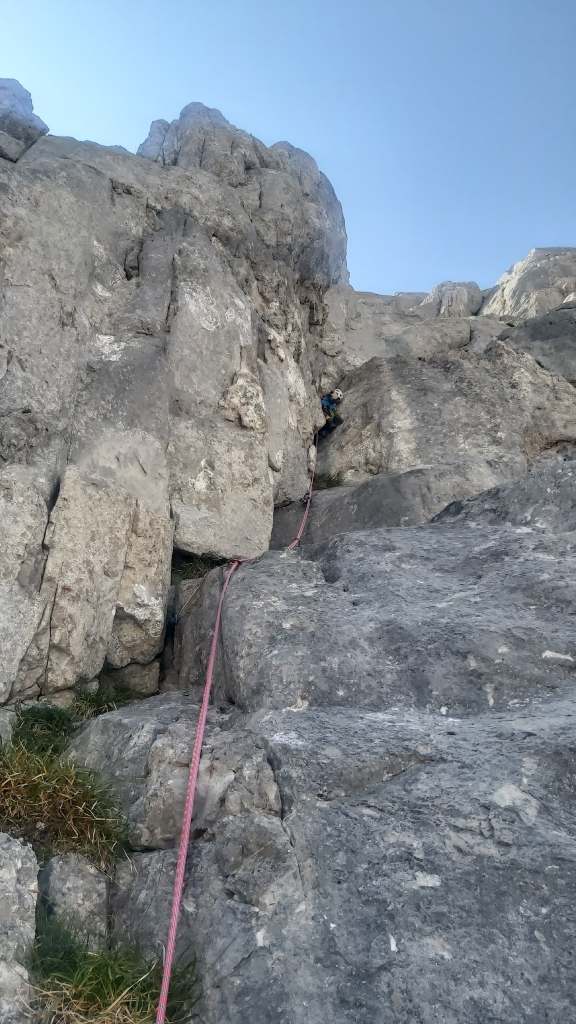 Largo 2, IV+ (30 metros): Salimos de la reunión destrepando con una zancada. Una vez más faltan pies, un paso de IV+ sobre una laja protegido por un friend. Y después otro pasito más con el friend por debajo, para seguir la vira herbosa en travesía a izquierda hasta situarnos debajo del diedro.