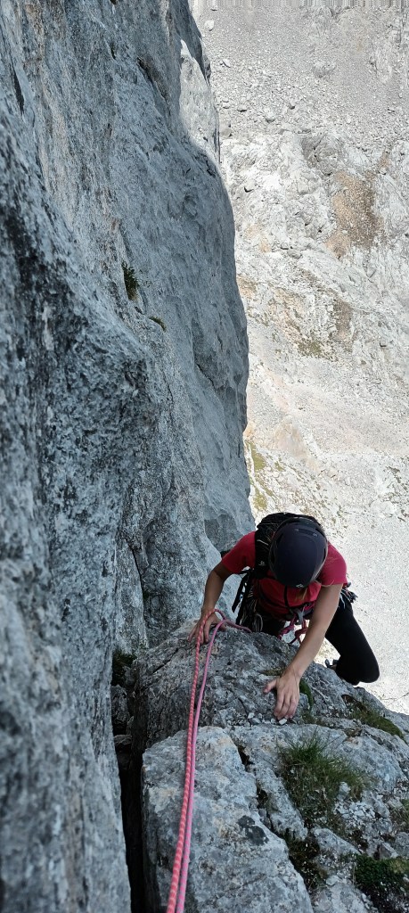 Largo 3, 6a (40 metros): El diedro que tenemos encima. Es más difícil de lo que parece. Tiene un par de pasos donde no hay pies y te ves obligado a ponerlos en adherencia. Después te encajonas en el diedro/chimenea como si fueras en offwidth para salir a la izquierda (cordino en puente de roca protege el paso) para después pasar a la derecha de nuevo a una terraza. Este último paso es aéreo, atlético y con ambiente.
