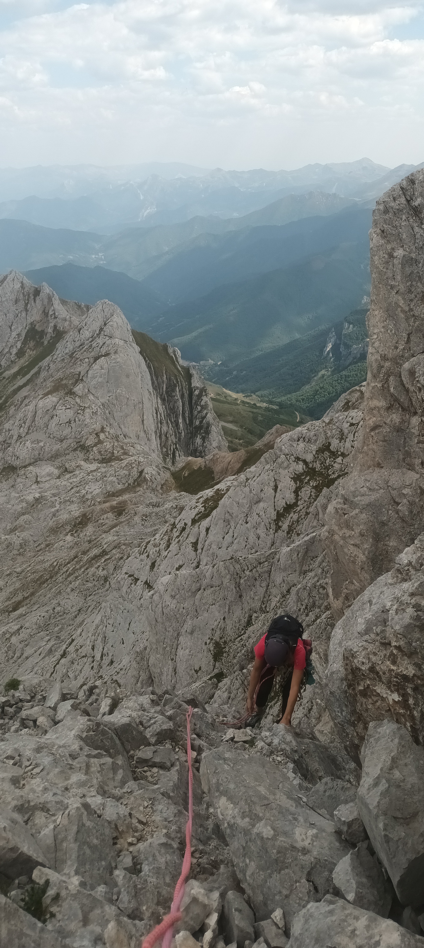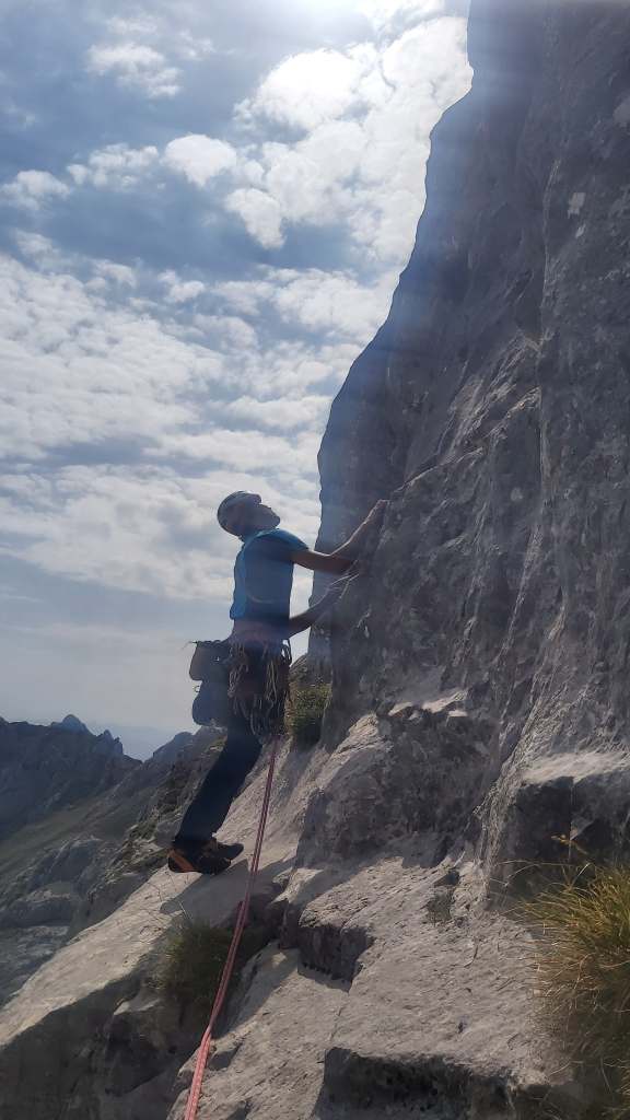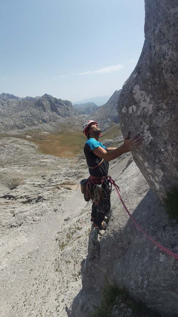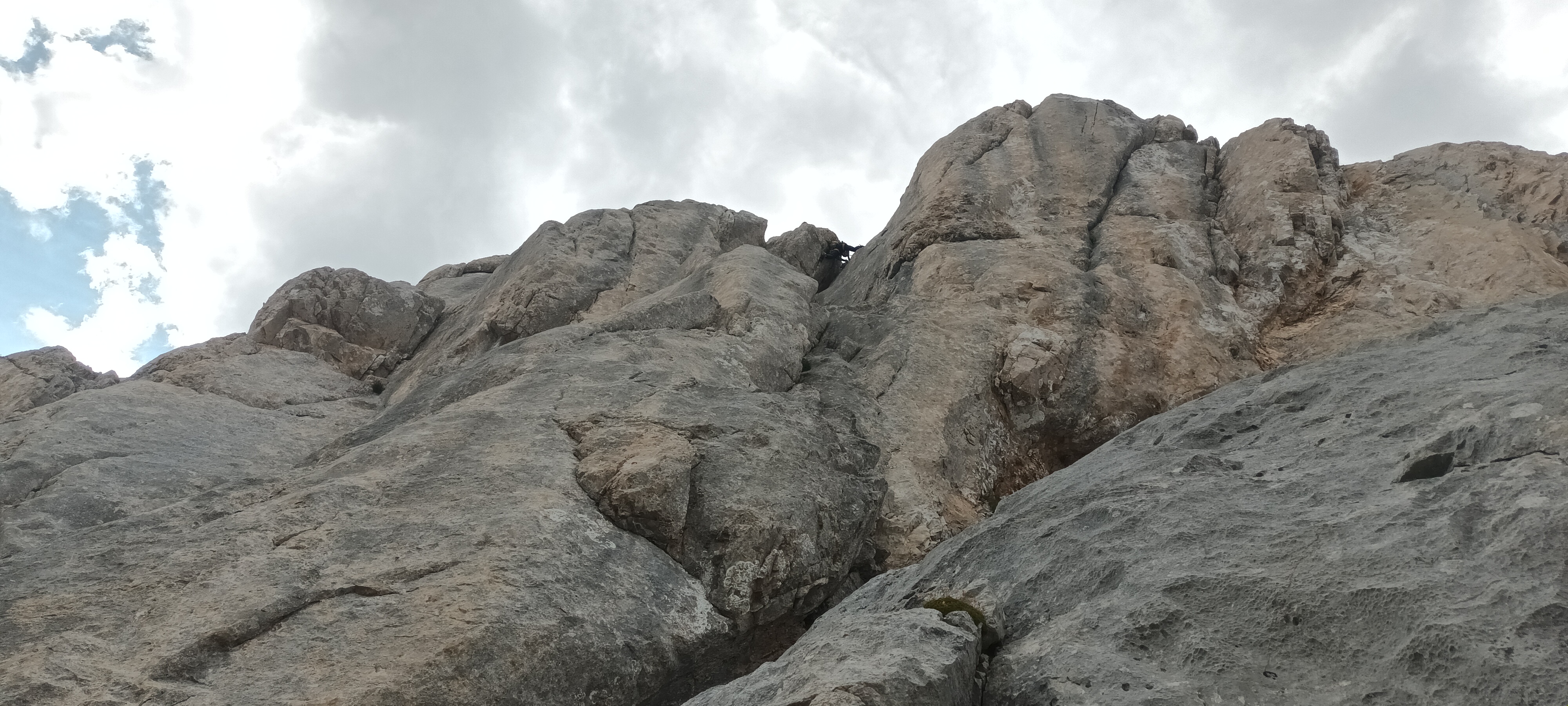 Largo 4, V+ (20 metros): Largo muy cortito. Salimos de la reunión hacia la derecha para alcanzar la terraza de arriba y situarnos en su vertical. Después vamos a la izquierda a través de unos grandes gendarmes, para salir al espolón. Vemos un clavo en el colladito que se aprecia en forma de «V» pero nos pilla muy abajo, de manera que montamos reunión laceando un bloque.