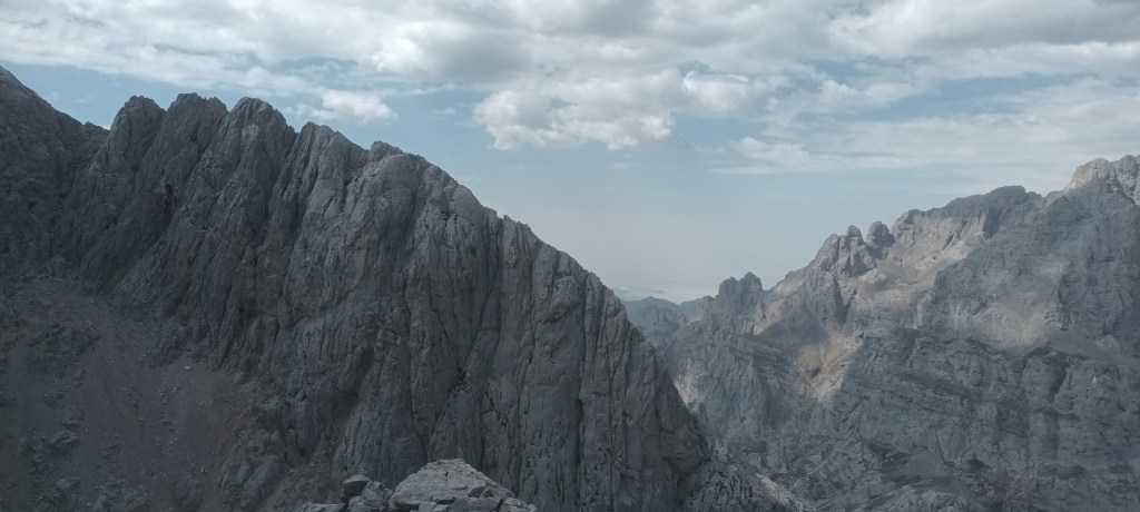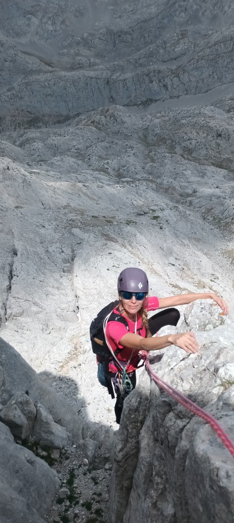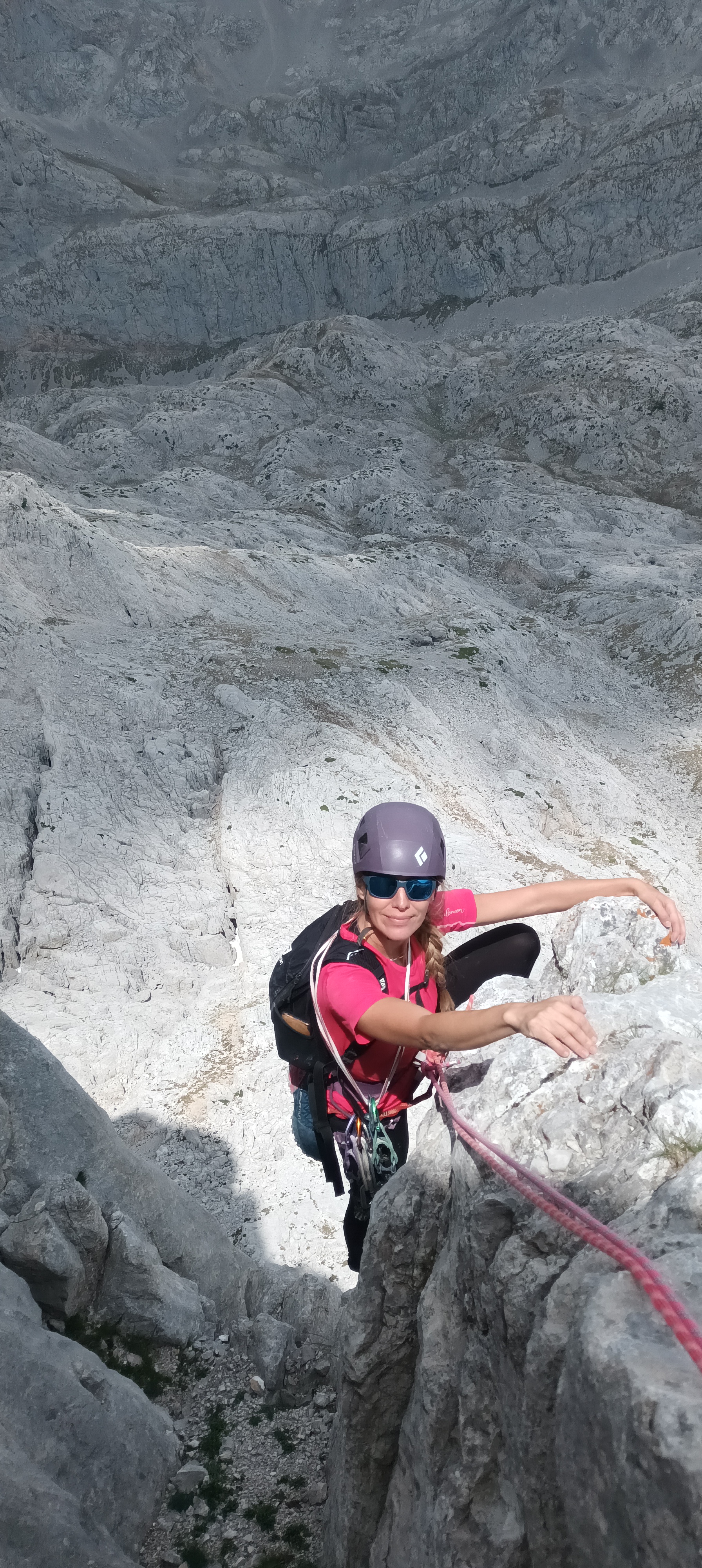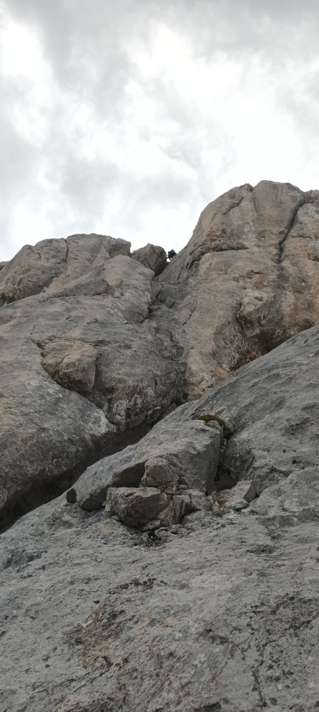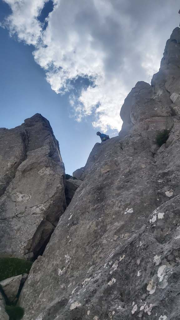 Largo 4, V+ (20 metros): Largo muy cortito. Salimos de la reunión hacia la derecha para alcanzar la terraza de arriba y situarnos en su vertical. Después vamos a la izquierda a través de unos grandes gendarmes, para salir al espolón. Vemos un clavo en el colladito que se aprecia en forma de «V» pero nos pilla muy abajo, de manera que montamos reunión laceando un bloque.