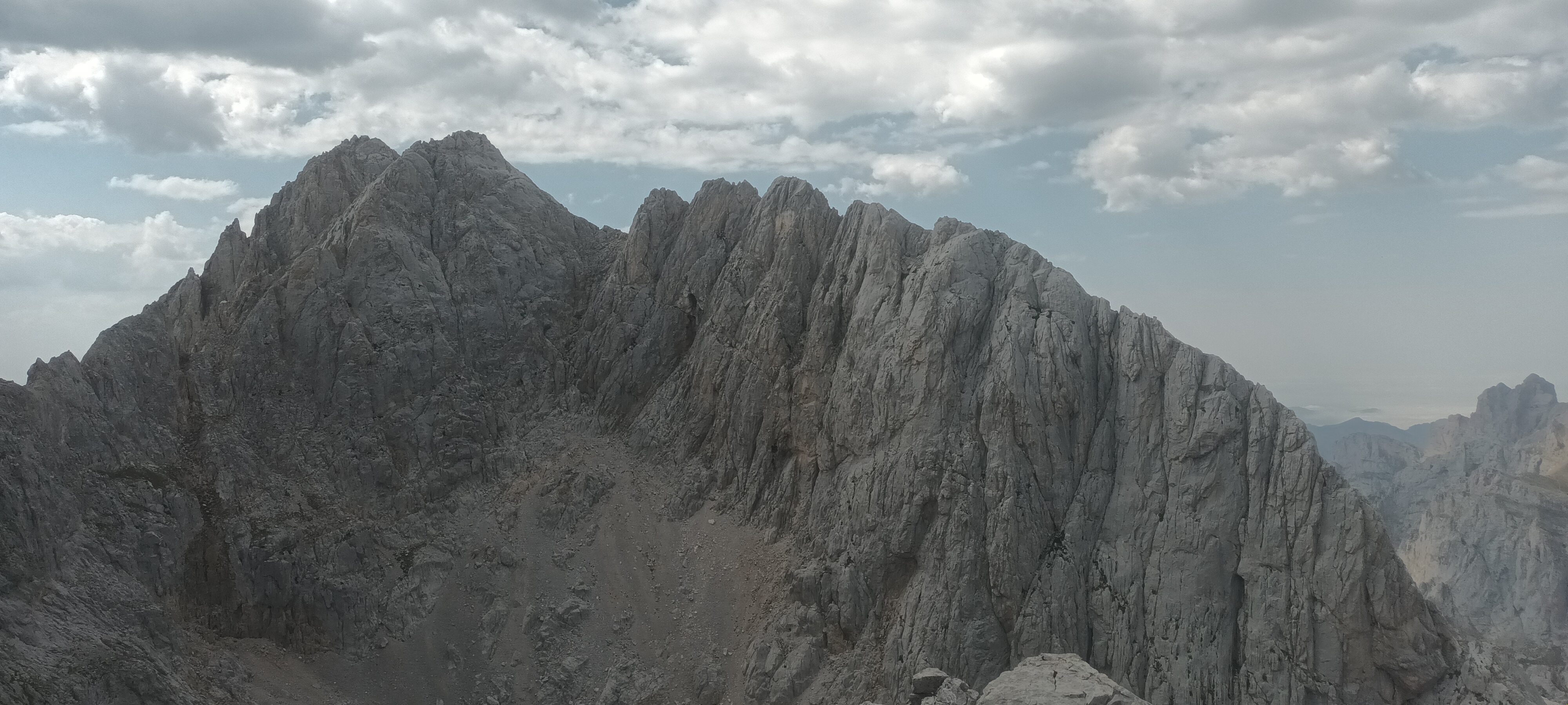En lugar de bajar a la Vega de Liordes, debemos girar a la izquierda y seguir los hitos por un caos de roca por las faldas de la Torre Salinas.