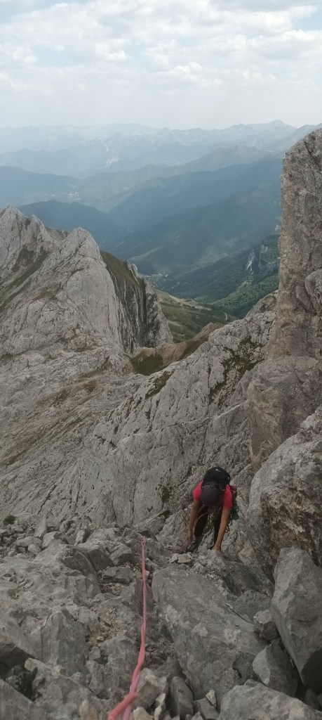 Llegamos a la cima de un gendarme cuando se acaba la fisura. A nuestra izquierda vemos la reunión (un cordino blanco a una gran roca).