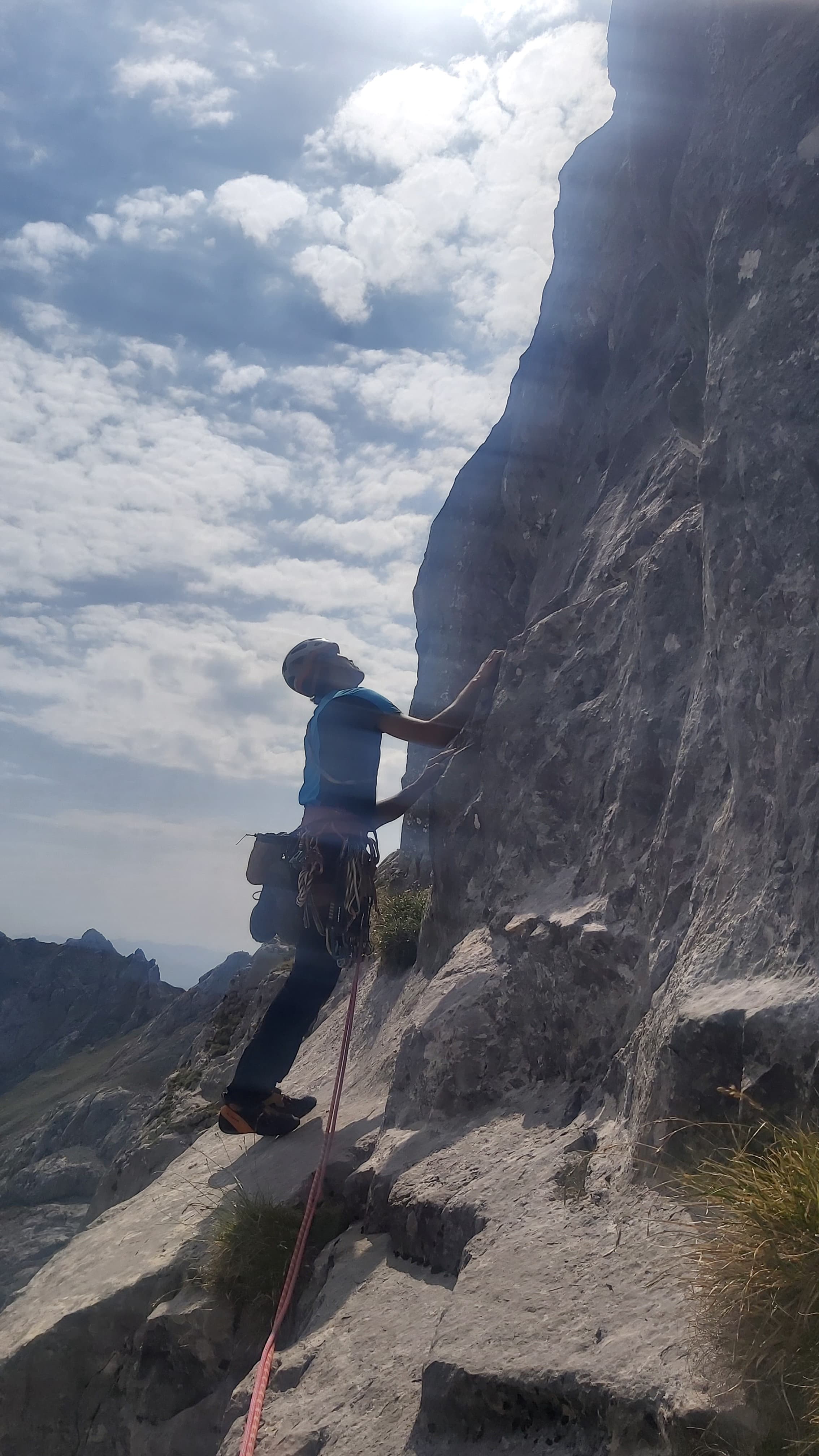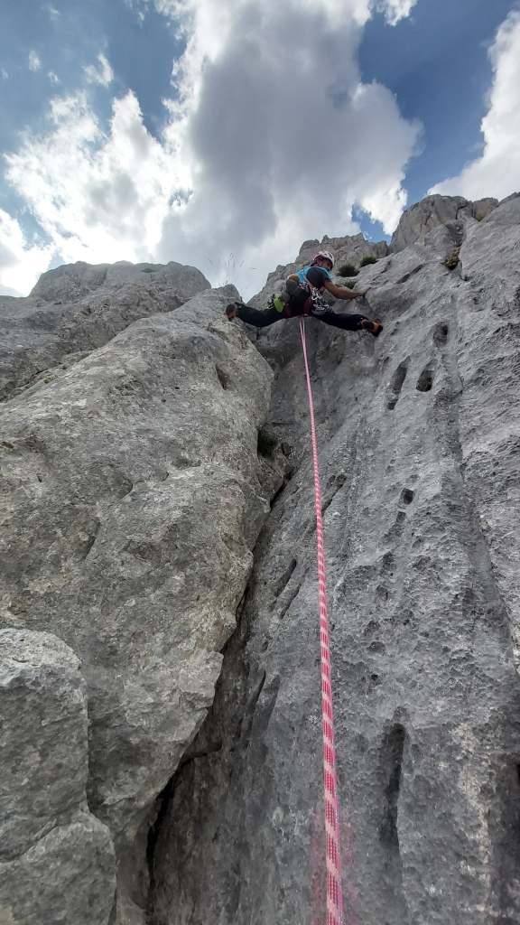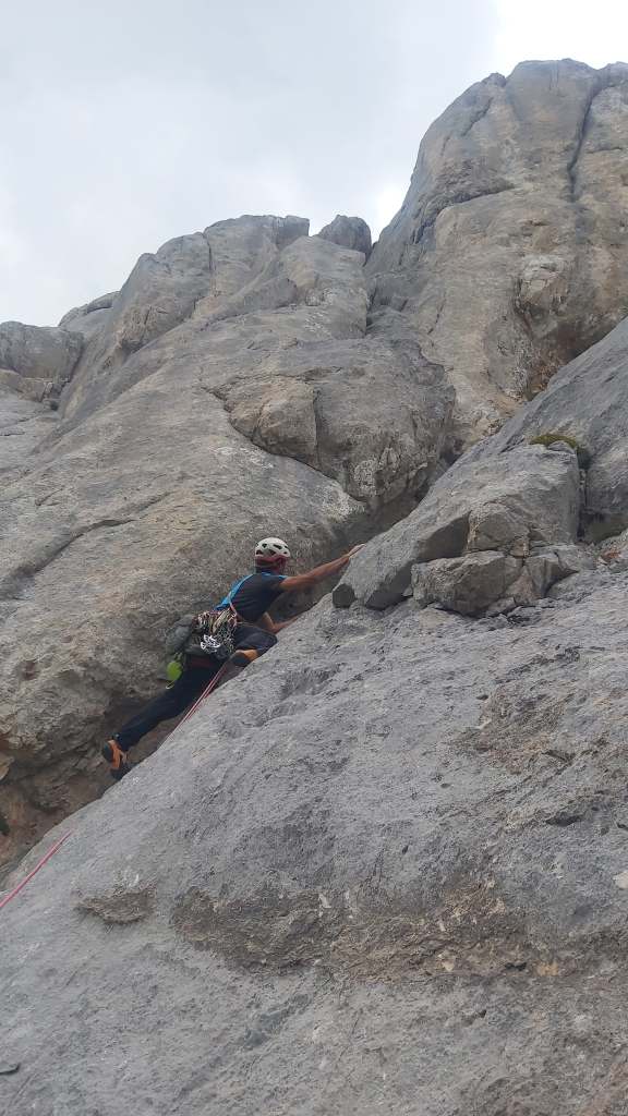 Después nos queda otro pequeño diedro con 2 cordinos y un clavo que cuesta alcanzar, mediante una postura retorcida. Largo duro que nos hará sudar un poco.