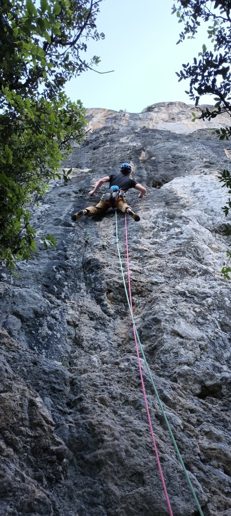De ahí hasta la reunión baja la dificultad, evaluaremos buscando bien el itinerario por roca pinchuda de calidad. Reunión colgada e incómoda para tres personas.