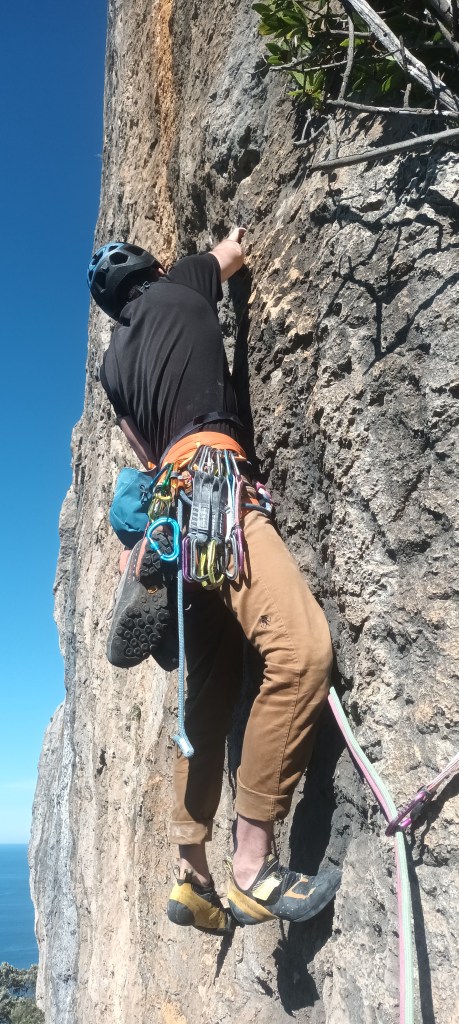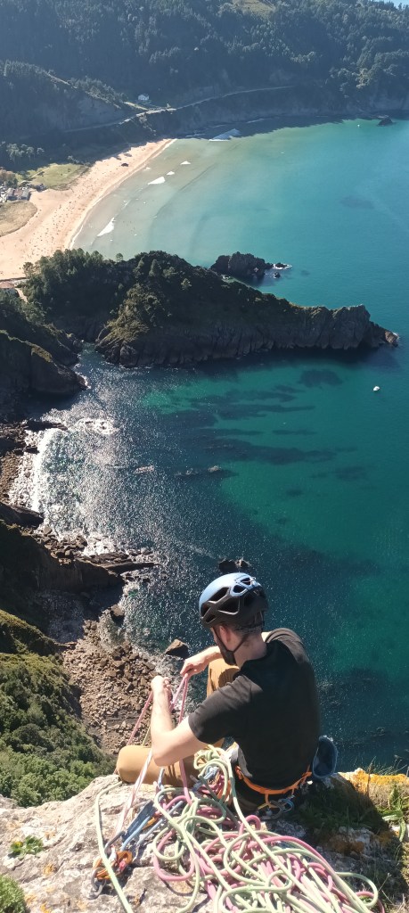 Largo 4 , 6b+ (15 metros): Este largo pertenece a la vía Ondoloin (abierta en 2013 por Ander Lasa y Mikel Bonilla). Surca el desplome que tenemos justo encima de nuestras cabezas. Parece mentira que aparezan cantos tan buenos. Buen largo, aunque muy corto, para acabar la vía.