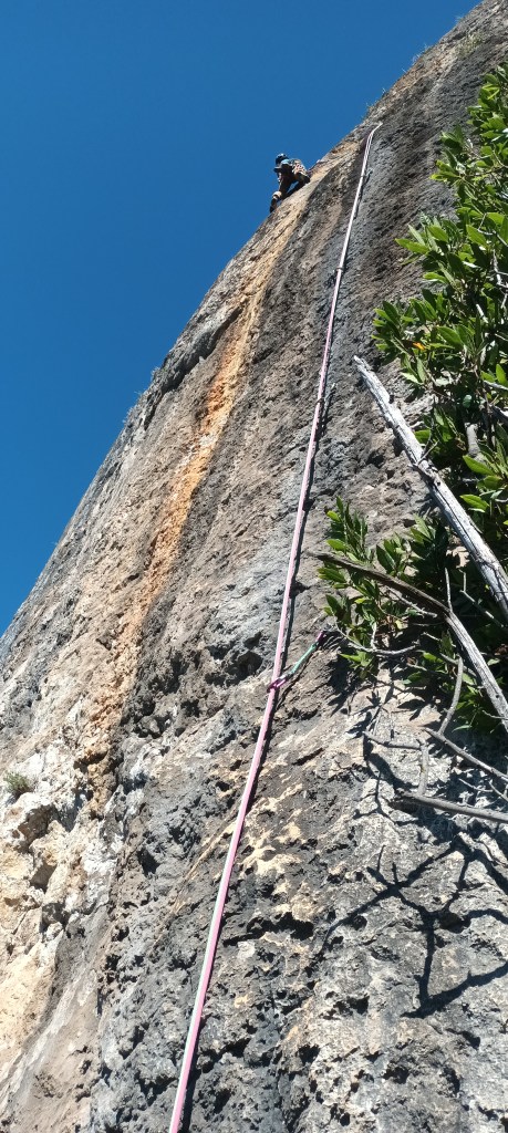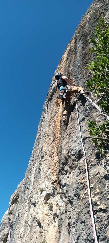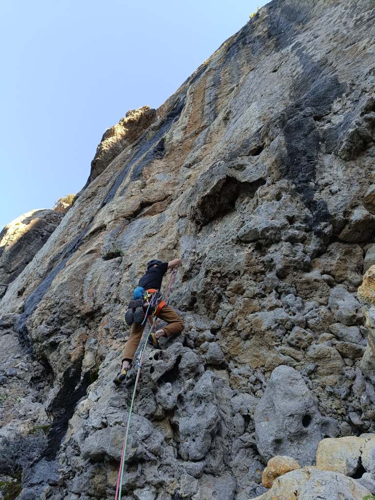 Largo 1 , 7a (35 metros): Al principio roca rota, paso duro a derechas hasta un agujero. Después la vía va relajando hasta la reunión, pero hay que escalar, una placa negra de calidad en torno al 6c de dificultad, de moverse bien.