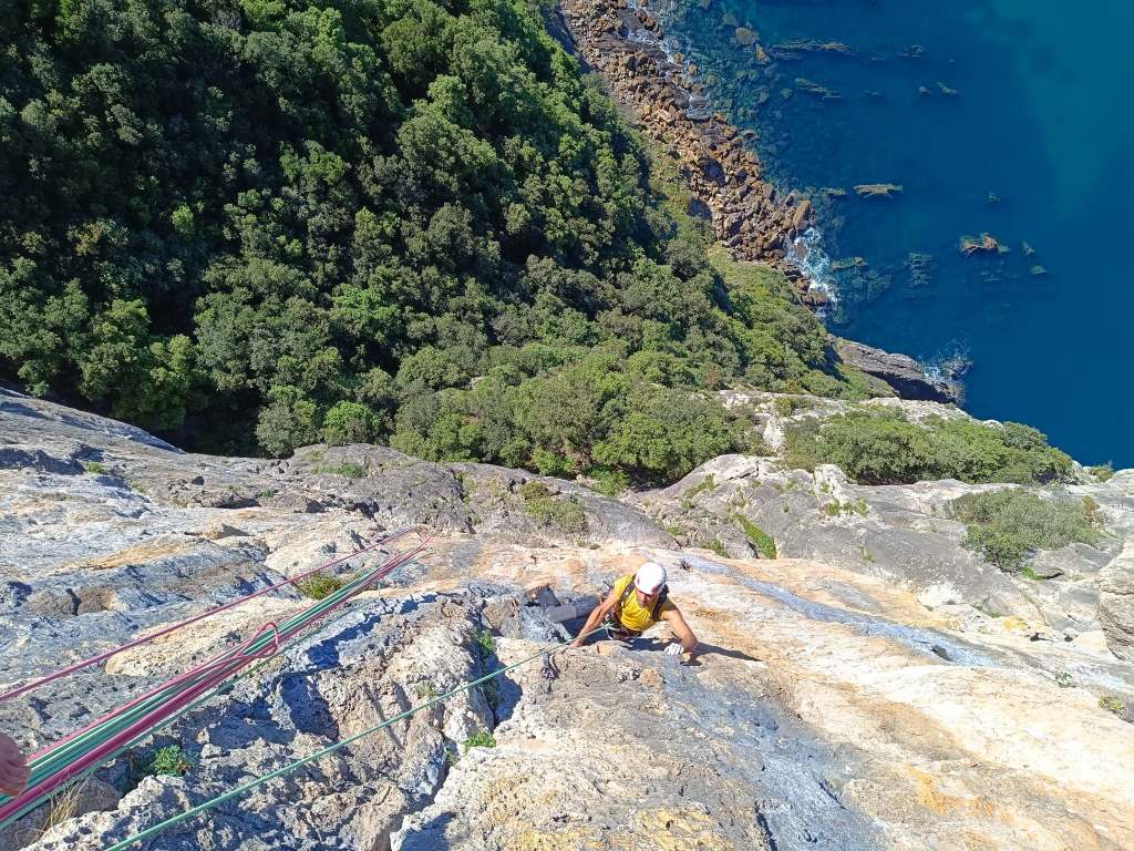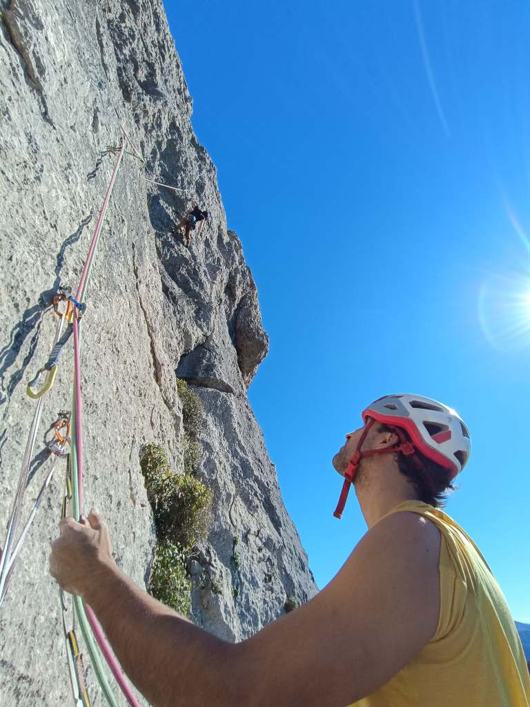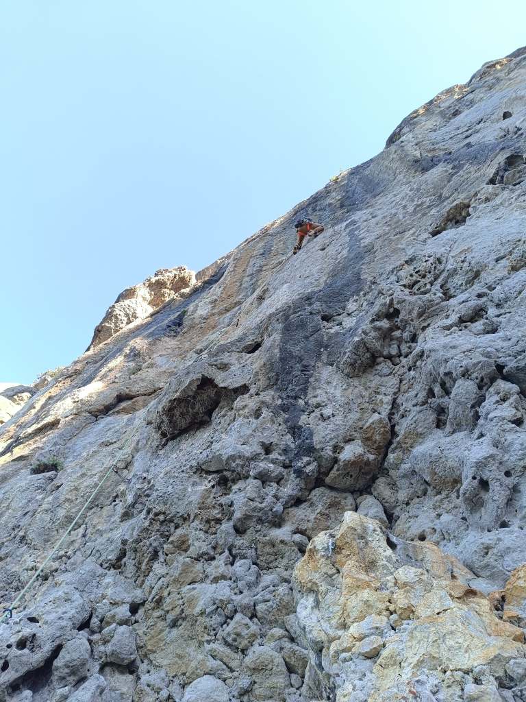Largo 2 , 7c+ (40 metros): Salimos de la reunión hacia la izquierda por un desplome sencillo (atlético) para montarnos en una placa. Debemos estar atentos para buscar la secuencia que nos lleve hacia la derecha, como las chapas indican. Después un bloque nos depositará en el crux; movimientos duros y bonitos sobre roca amarilla.