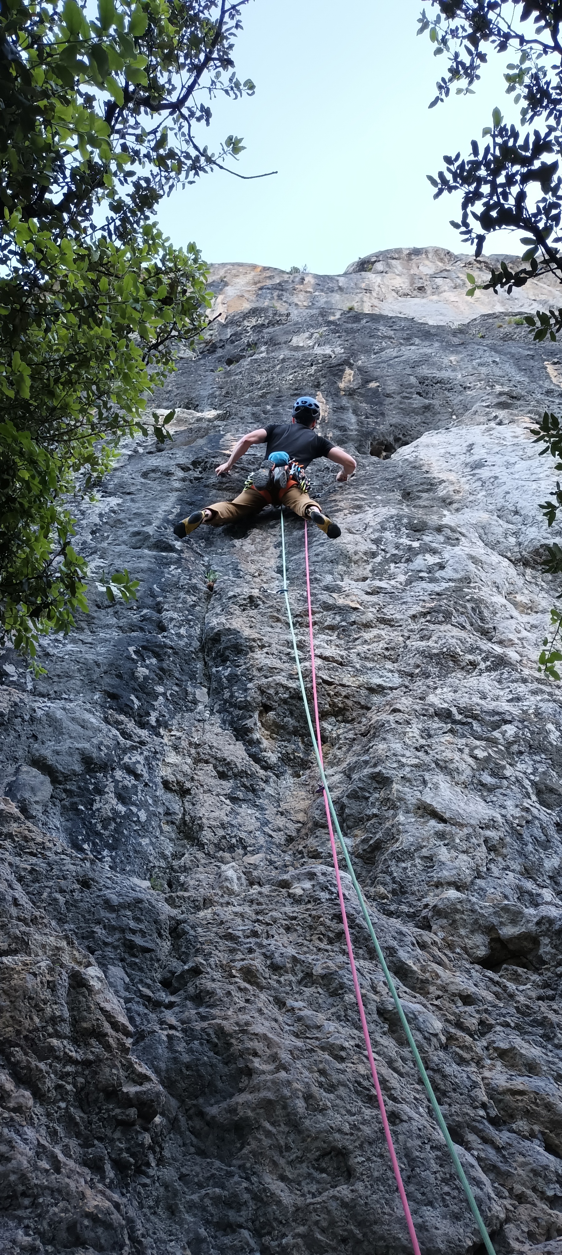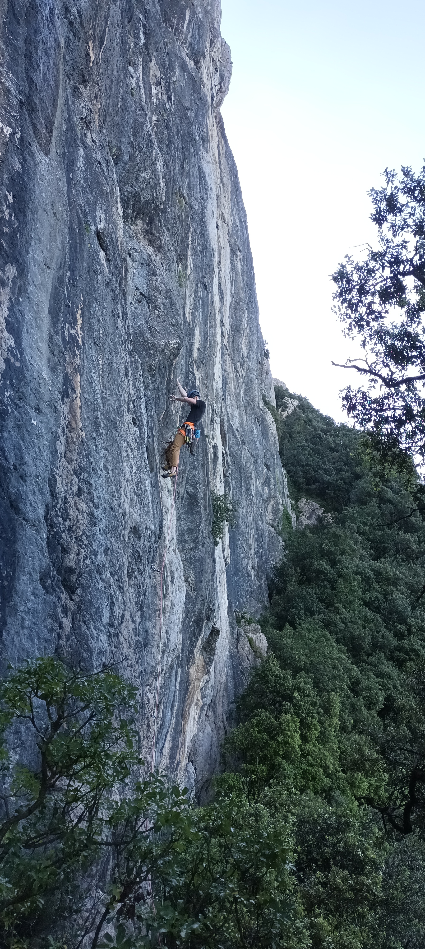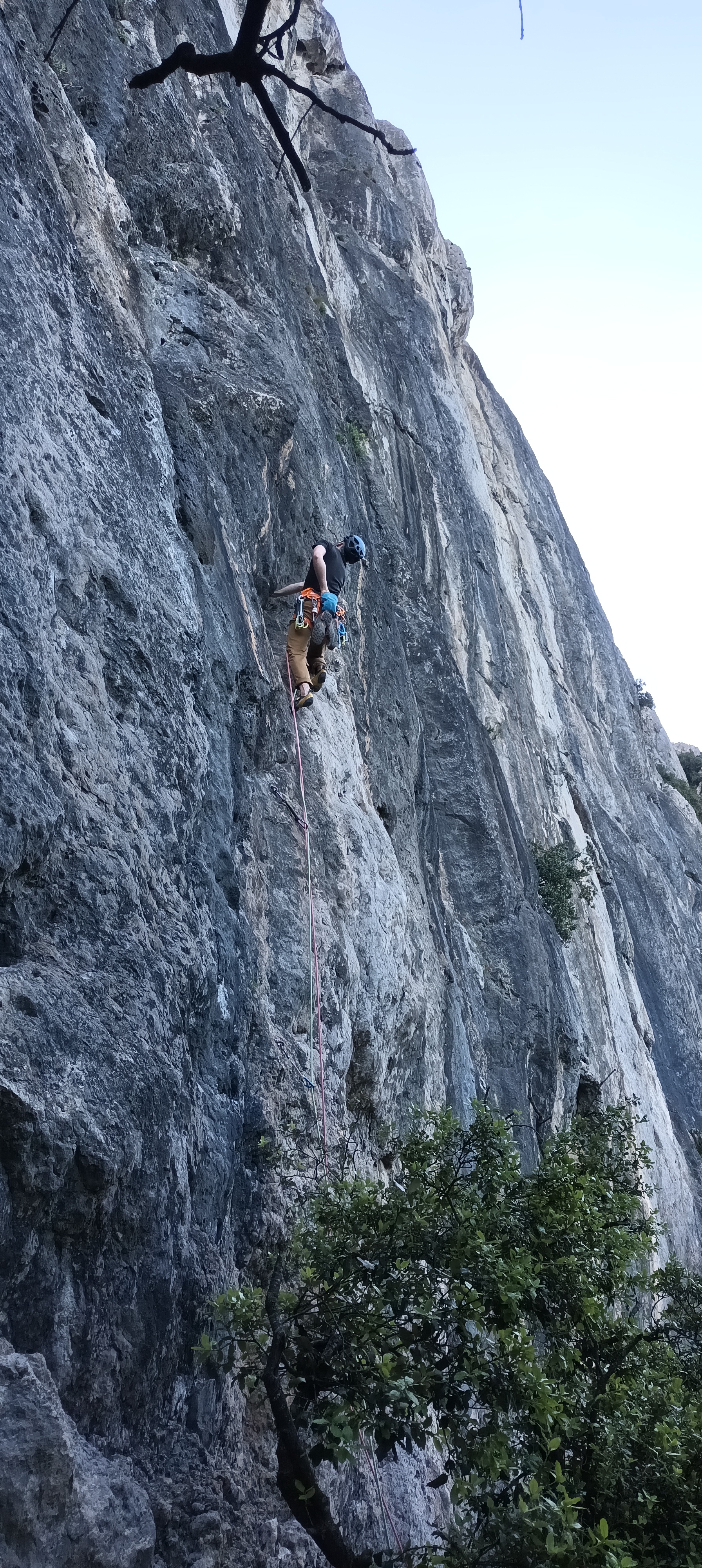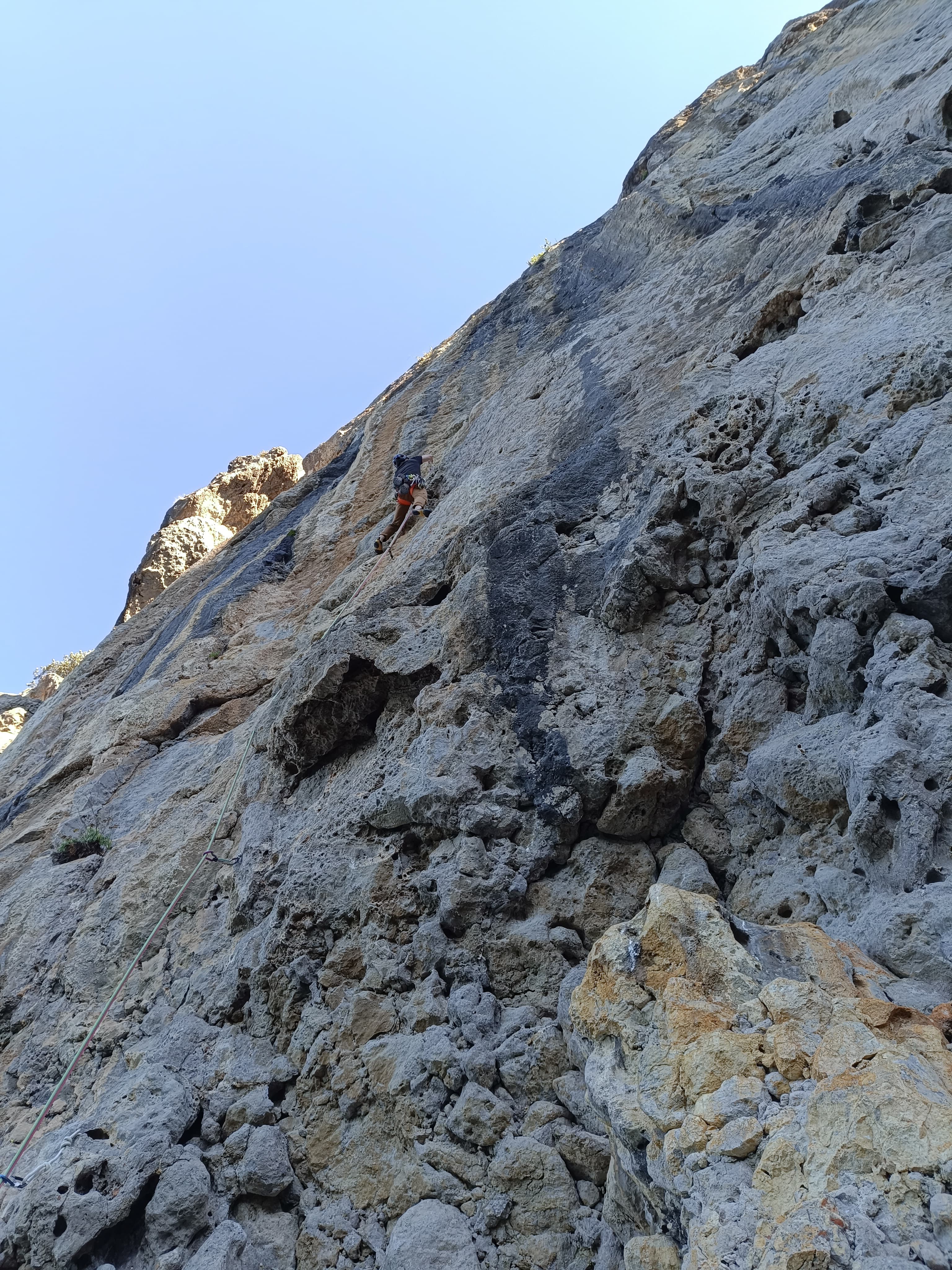 Largo 2 , 7c+ (40 metros): Salimos de la reunión hacia la izquierda por un desplome sencillo (atlético) para montarnos en una placa. Debemos estar atentos para buscar la secuencia que nos lleve hacia la derecha, como las chapas indican. Después un bloque nos depositará en el crux; movimientos duros y bonitos sobre roca amarilla.