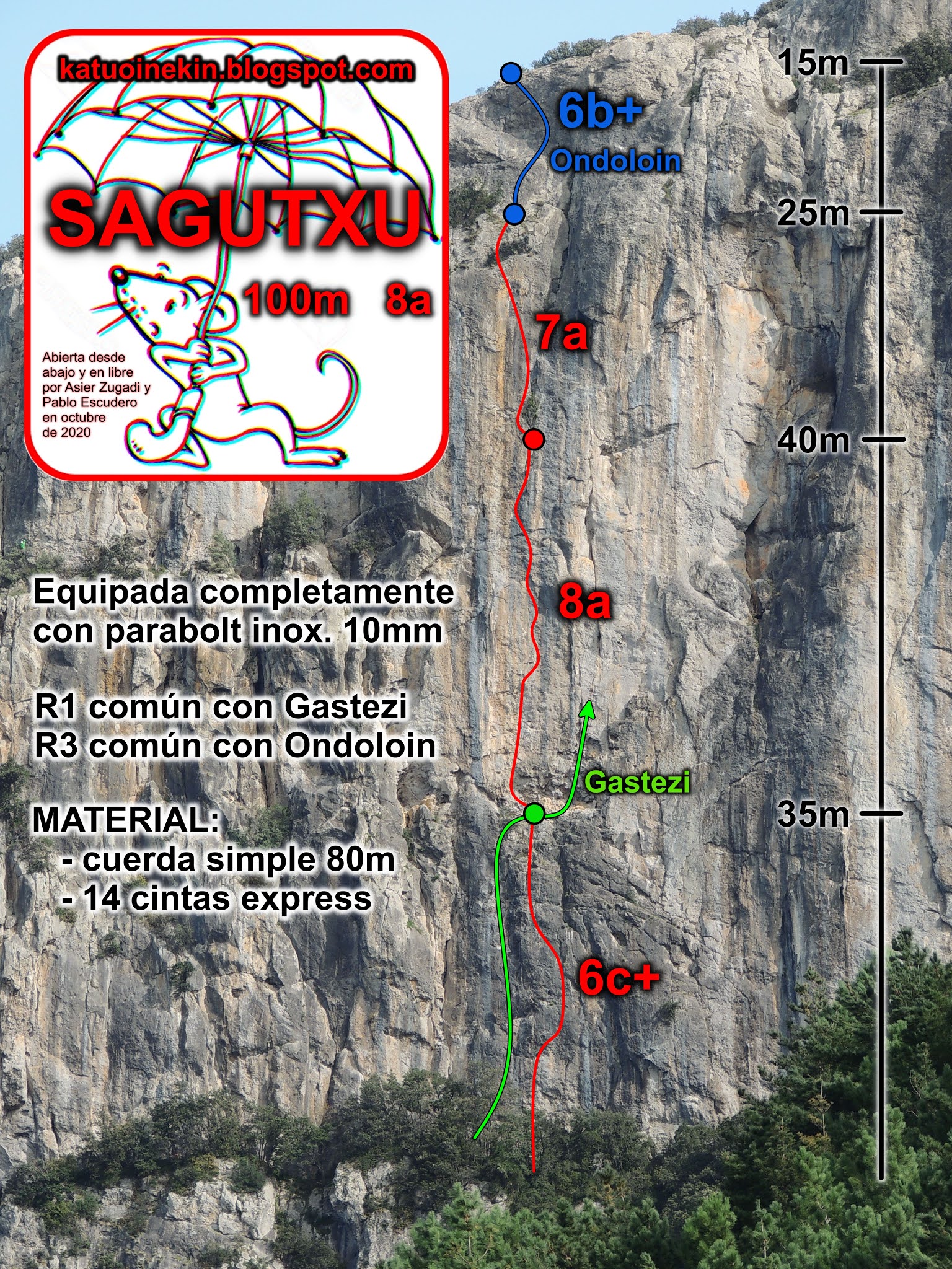 Aproximación: Aparcamos en el cementerio que se encuentra en el cabo Ogoño (cementerio de Elantxobe) y desde allí andamos hasta el acantilado. Bajamos por el camino ya conocido, hasta la repisa que nos conduce a la vía Gaviotas. Una vez en esta repisa, la vía «Sagutxu» es de las primeras líneas que encontramos. La vía comienza justo a la derecha de la vía «Gaztezar» (químicos).