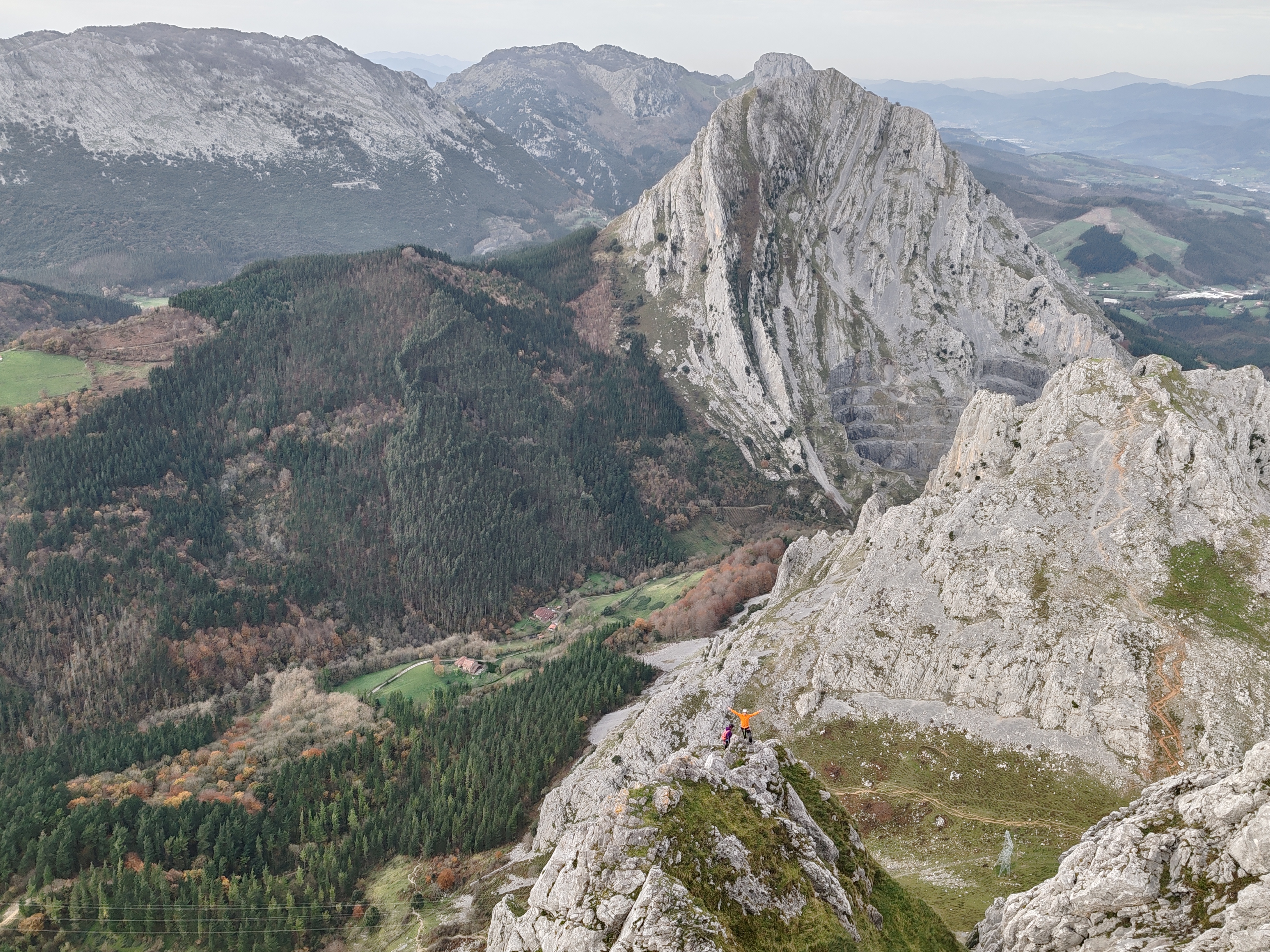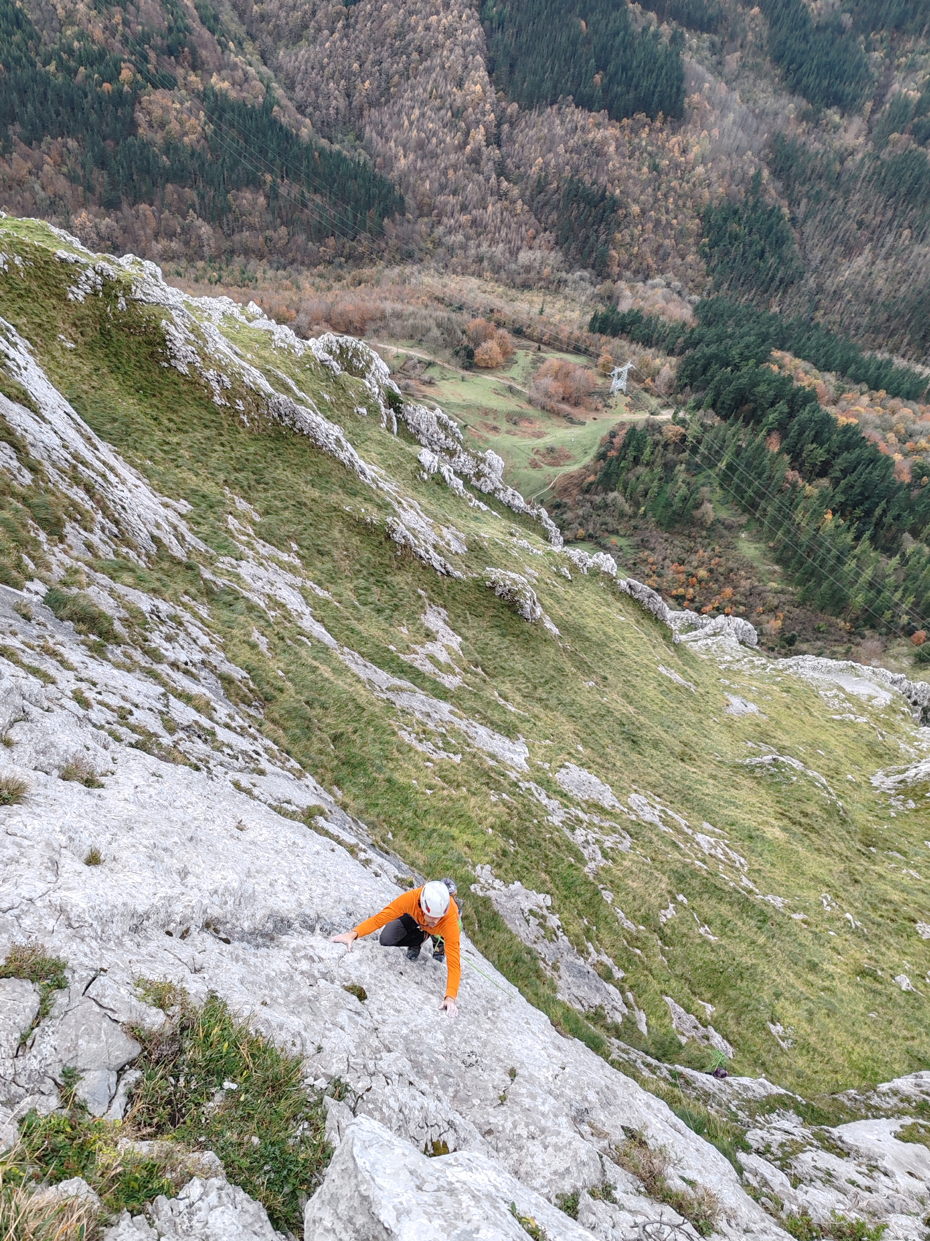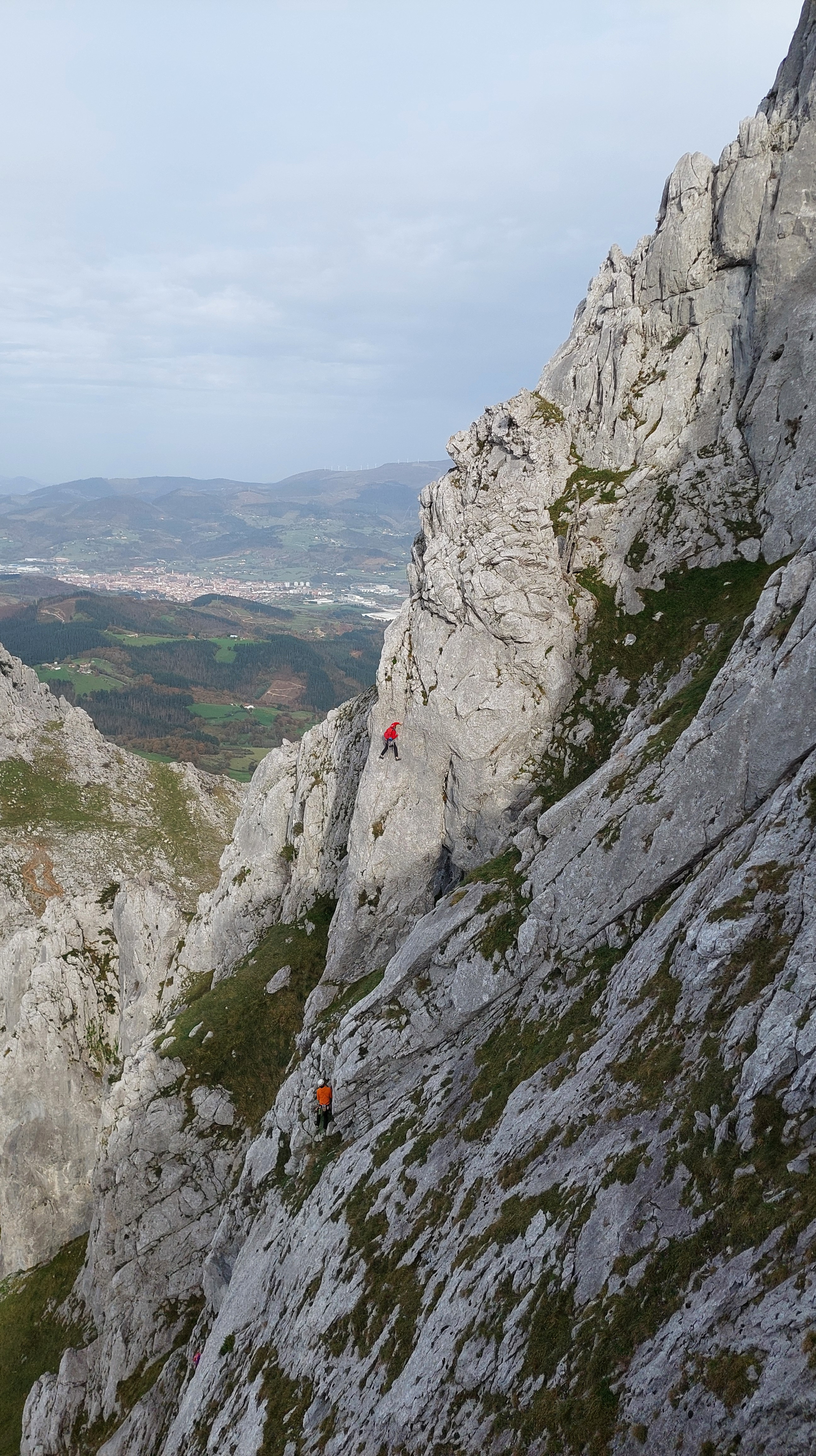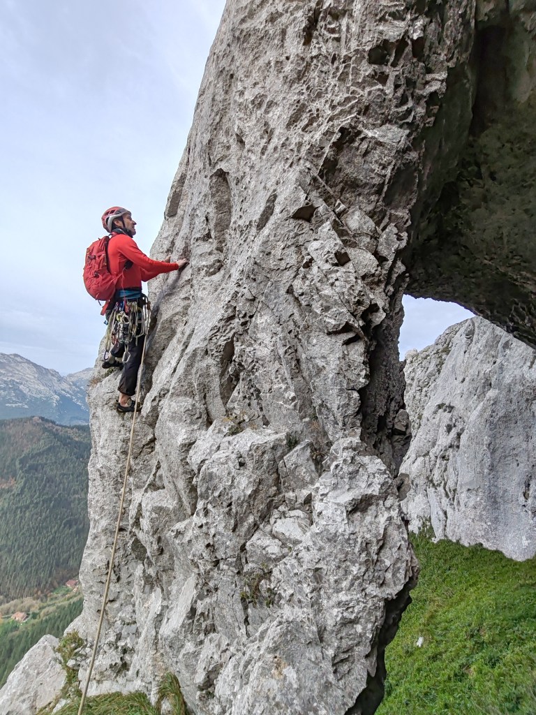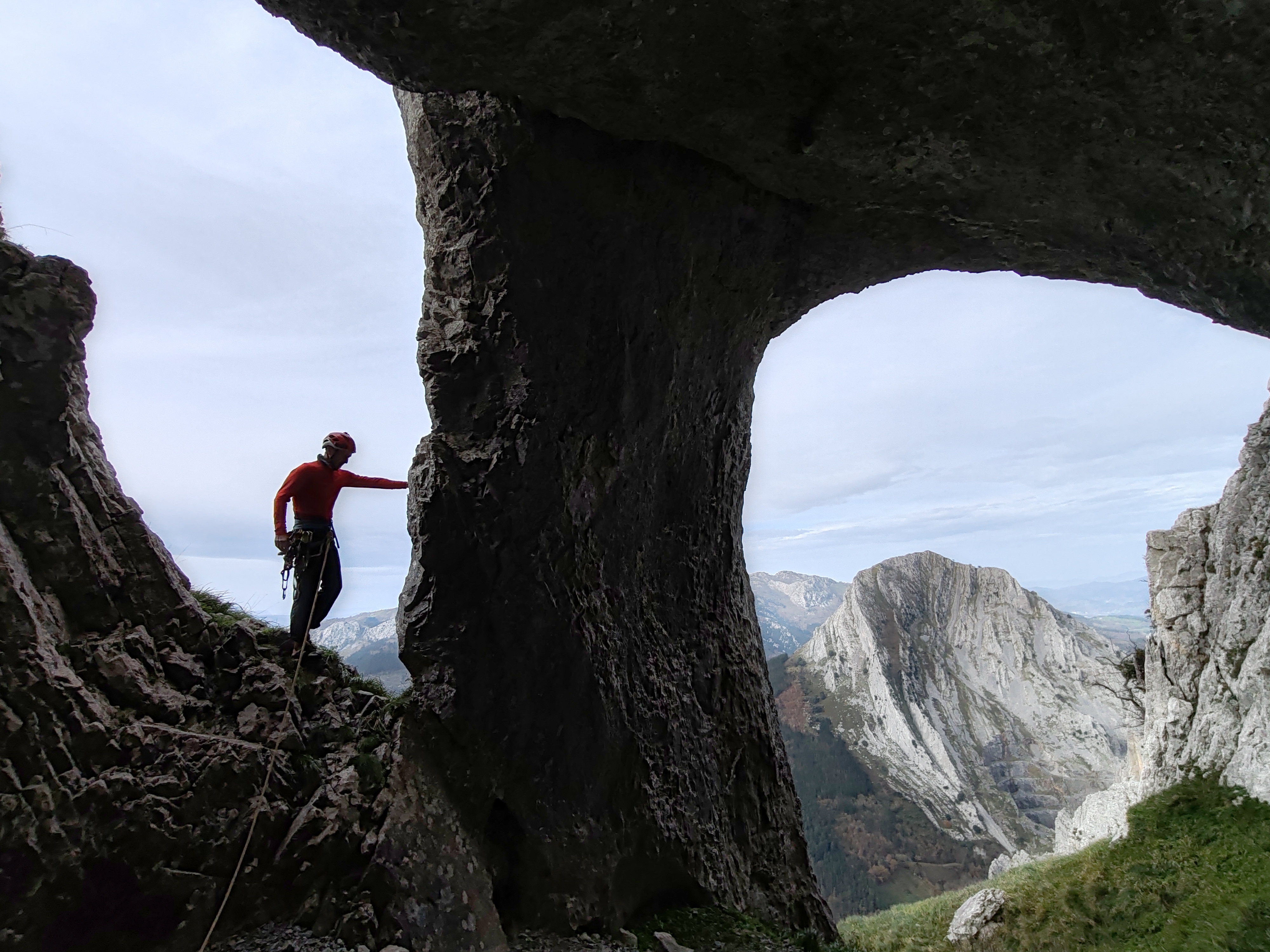 Pasaremos por el gran ojo de Tartalo, la cueva donde quizá vivía el ciclópe más temido de nuestra montañas, o tal vez la cueva horadada por alguno de sus lanzamientos de piedras. Bonitos largos de placa, alternados con arista y tramos andando. Roca dudosa en algunos tramos, pero una vía que merece mucho la pena si nos gustan este tipo de actividades.
