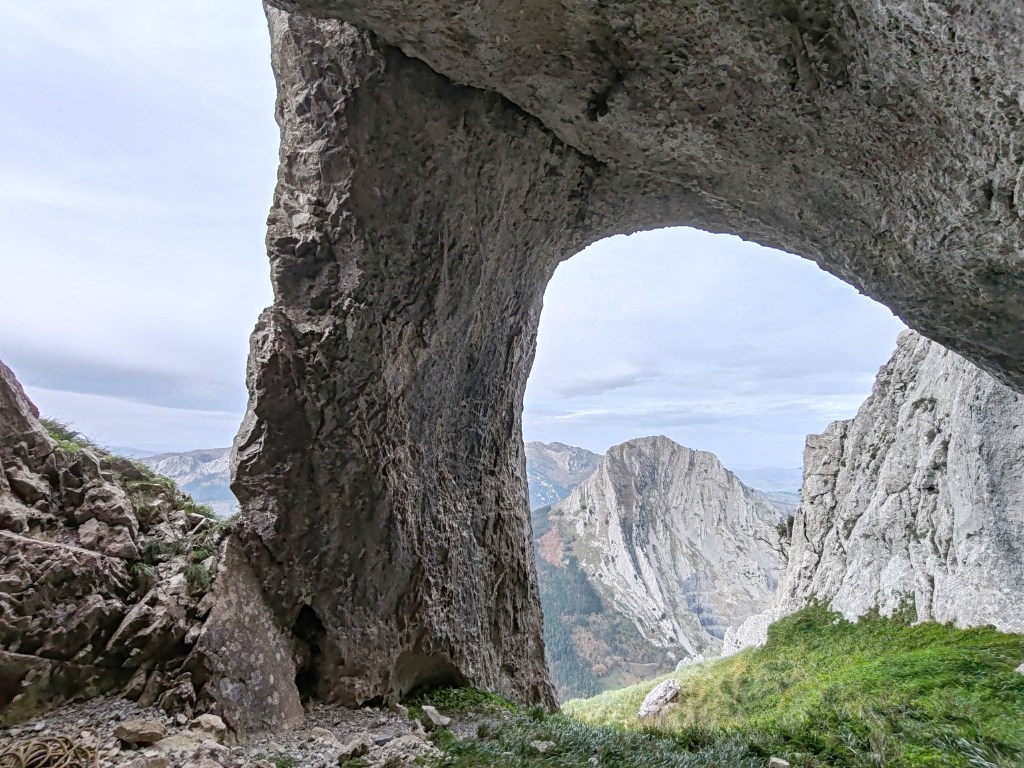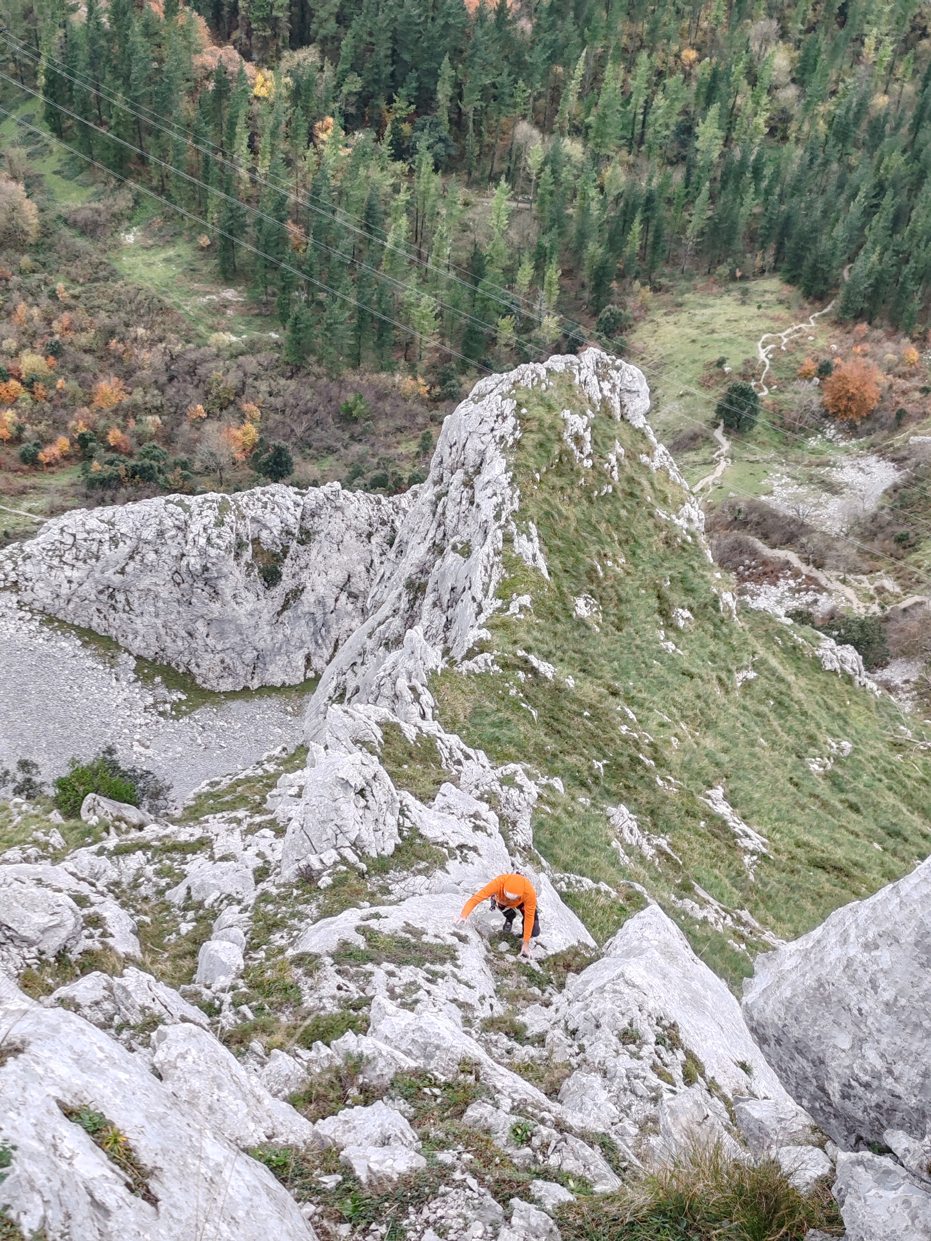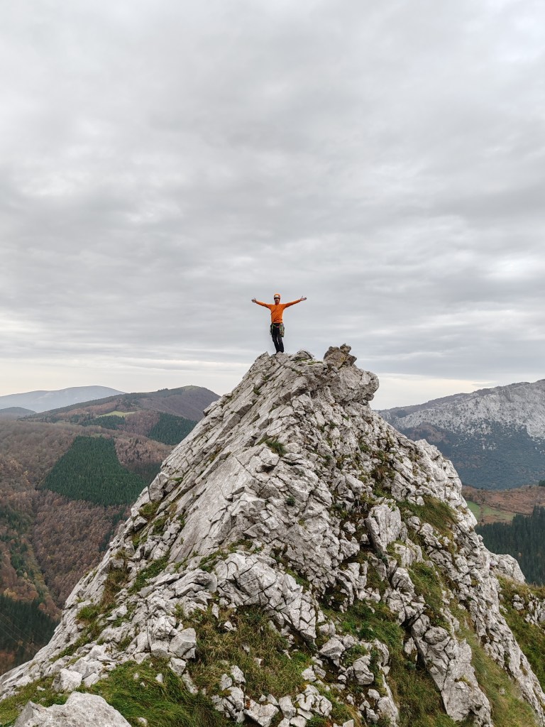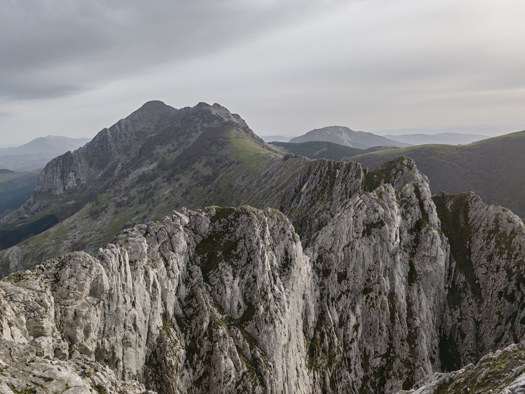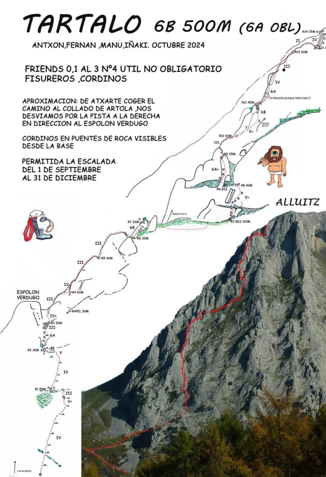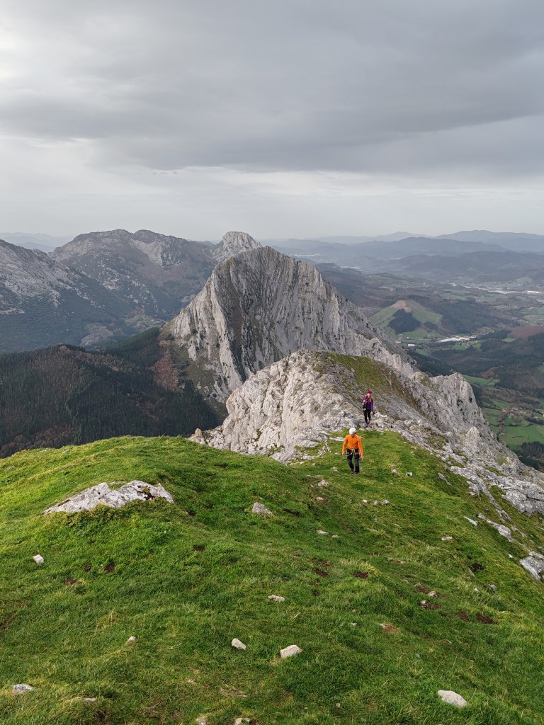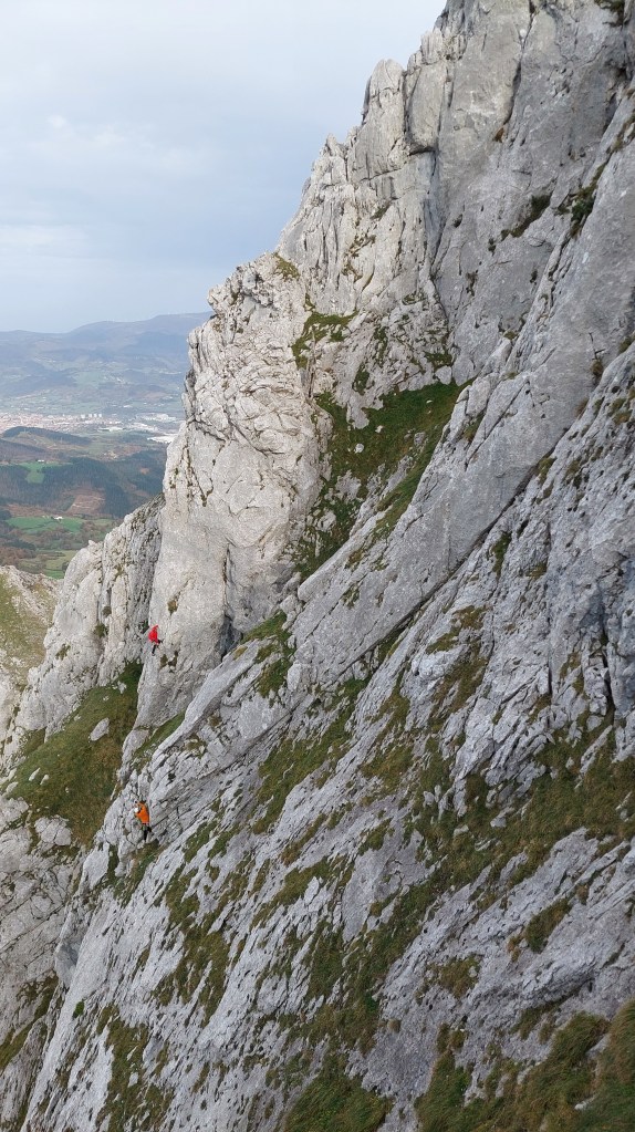 Pasaremos por el gran ojo de Tartalo, la cueva donde quizá vivía el ciclópe más temido de nuestra montañas, o tal vez la cueva horadada por alguno de sus lanzamientos de piedras. Bonitos largos de placa, alternados con arista y tramos andando. Roca dudosa en algunos tramos, pero una vía que merece mucho la pena si nos gustan este tipo de actividades.